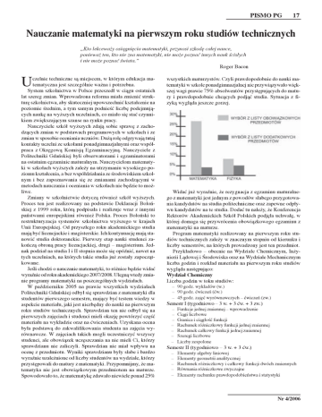 PISMO PG 17 Nauczanie matematyki na pierwszym roku studiów technicznych „Kto lekcewa¿y osi¹gniêcia matematyki, przynosi szkodê ca³ej nauce, poniewa¿ ten, kto nie zna matematyki, nie mo¿e poznaæ innych nauk œcis³ych i nie mo¿e poznaæ œwiata.” Roger Bacon U czelnie techniczne s¹ miejscem, w którym edukacja matematyczna jest szczególnie wa¿na i potrzebna. System szkolnictwa w Polsce przeszed³ w ci¹gu ostatnich lat szereg zmian. Wprowadzona reforma mia³a zmieniæ strukturê szkolnictwa, aby skuteczniej upowszechniæ kszta³cenie na poziomie œrednim, a tym samym podnieœæ liczbê podejmuj¹cych naukê na wy¿szych uczelniach, co mia³o siê staæ czynnikiem zwiêkszaj¹cym szanse na rynku pracy. Nauczyciele szkó³ wy¿szych zdaj¹ sobie sprawê z zachodz¹cych zmian w podstawach programowych w szko³ach i ze zmian w sposobie oceniania uczniów. Du¿¹ rolê odgrywaj¹ tutaj kontakty uczelni ze szko³ami ponadgimnazjalnymi oraz wspó³praca z Okrêgow¹ Komisj¹ Egzaminacyjn¹. Nauczyciele z Politechniki Gdañskiej byli obserwatorami i egzaminatorami na ostatnim egzaminie maturalnym. Nauczycielom matematyki w szko³ach wy¿szych zale¿y na utrzymaniu wysokiego poziomu kszta³cenia, a bez wspó³dzia³ania ze œrodowiskiem szkolnym i bez zapoznawania siê ze zmianami zachodz¹cymi w metodach nauczania i oceniania w szko³ach nie bêdzie to mo¿liwe. Zmiany w szkolnictwie dotycz¹ równie¿ szkó³ wy¿szych. Proces ten jest realizowany na podstawie Deklaracji Boloñskiej z 1999 roku, któr¹ podpisa³a i realizuje wraz z innymi pañstwami europejskimi równie¿ Polska. Proces Boloñski to restrukturyzacja systemów szkolnictwa wy¿szego w krajach Unii Europejskiej. Od przysz³ego roku akademickiego studia maj¹ byæ licencjackie i magisterskie. Ich kontynuacjê maj¹ stanowiæ studia doktoranckie. Pierwszy etap nauki studenci zakoñcz¹ obron¹ pracy licencjackiej, drugi – magisterium. Jednak podzia³ na studia I i II stopnia mo¿e siê opóŸniæ, nawet na tych uczelniach, na których takie studia ju¿ zosta³y zapocz¹tkowane. Jeœli chodzi o nauczanie matematyki, to ró¿nice bêdzie widaæ wyraŸnie od roku akademickiego 2007/2008. Ulegn¹ wtedy zmianie programy matematyki na poszczególnych wydzia³ach. W paŸdzierniku 2005 na prawie wszystkich wydzia³ach Politechniki Gdañskiej odby³ siê sprawdzian z matematyki dla studentów pierwszego semestru, maj¹cy byæ testem wiedzy w aspekcie materia³u, jaki jest niezbêdny do nauki na pierwszym roku studiów technicznych. Sprawdzian ten nie odby³ siê na pierwszych zajêciach i studenci mieli okazjê powtórzyæ czêœæ materia³u na wyk³adzie oraz na æwiczeniach. Uzyskana ocena by³a podstaw¹ do zakwalifikowania studenta na zajêcia wyrównawcze. W zajêciach takich mogli uczestniczyæ wszyscy studenci, ale obowi¹zek uczêszczania na nie mieli Ci, którzy sprawdzianu nie zaliczyli. Sprawdzian nie mia³ wp³ywu na ocenê z przedmiotu. Wyniki sprawdzianu by³y s³abe i bardzo wyraŸnie uzale¿nione od liczby studentów na wydziale, którzy przystêpowali do matury z matematyki. Przypomnijmy, ¿e matematyka nie jest obowi¹zkowym przedmiotem na maturze. Spowodowa³o to, ¿e matematykê zdawa³o niewiele ponad 25% wszystkich maturzystów. Czyli prawdopodobnie do nauki matematyki w szkole ponadgimnazjalnej nie przywi¹zywa³o wiêkszej wagi prawie 75% absolwentów przystêpuj¹cych do matury i prawdopodobnie chc¹cych podj¹æ studia. Sytuacja z fizyk¹ wygl¹da jeszcze gorzej. Widaæ ju¿ wyraŸnie, ¿e rezygnacja z egzaminu maturalnego z matematyki jest jednym z powodów s³abego przygotowania kandydatów na studia politechniczne oraz zapewne odp³ywu kandydatów na te studia. Dodaæ tu nale¿y, ¿e Konferencja Rektorów Akademickich Szkó³ Polskich podjê³a uchwa³ê, w której domaga siê przywrócenia obowi¹zkowego egzaminu z matematyki na maturze. Program matematyki realizowany na pierwszym roku studiów technicznych zale¿y w znacznym stopniu od kierunku i liczby semestrów, na których prowadzony jest ten przedmiot. Przyk³adowo – obecnie na Wydziale Chemicznym, In¿ynierii L¹dowej i Œrodowiska oraz na Wydziale Mechanicznym liczba godzin i rozk³ad materia³u na pierwszym roku studiów wygl¹da nastêpuj¹co: Wydzia³ Chemiczny Liczba godzin w toku studiów: – 90 godz. wyk³adów (w.) – 90 godz. æwiczeñ (æw.) – 45 godz. zajêæ wyrównawczych – æwiczeñ (zw.) Semestr I (tygodniowo – 3 w. + 3 æw. + 3 zw.) – – – – – – – Funkcje jednej zmiennej – wprowadzenie Ci¹gi liczbowe Granica i ci¹g³oœæ funkcji Rachunek ró¿niczkowy funkcji jednej zmiennej Rachunek ca³kowy funkcji jednej zmiennej Szeregi liczbowe Liczby zespolone Semestr II (tygodniowo – 3 w. + 3 æw.) – – – – – Elementy algebry liniowej Elementy geometrii analitycznej Rachunek ró¿niczkowy i ca³kowy funkcji dwóch zmiennych Równania ró¿niczkowe zwyczajne Elementy rachunku prawdopodobieñstwa i statystyki Nr 4/2006 18 PISMO PG Wydzia³ In¿ynierii L¹dowej i Œrodowiska Liczba godzin w toku studiów: - 150 godz. wyk³adów (w.) - 135 godz. æwiczeñ (æw.) - 30 godz. zajêæ wyrównawczych – æwiczeñ (zw.) Semestr I ( tygodniowo – 4 w. + 4 æw. + 3 zw.) – – – – – – – – Funkcje jednej zmiennej – wprowadzenie Ci¹gi liczbowe Granica i ci¹g³oœæ funkcji Rachunek ró¿niczkowy funkcji jednej zmiennej Rachunek ca³kowy funkcji jednej zmiennej Elementy algebry liniowej Elementy geometrii analitycznej Liczby zespolone wiekowej 19-24 lat do roku 2005 wystêpowa³a tendencja wzrostowa do oko³o 3,9 mln osób, a nastêpnie jest prognozowana wyraŸna tendencja spadkowa – w roku 2010 wyniesie oko³o 3,4 mln i oko³o 2,3 miliona osób w 2020 roku. Jak widaæ, nale¿y do³o¿yæ wszelkich starañ, aby przyci¹gn¹æ jak najwiêksz¹ liczbê przysz³ych studentów na uczelnie techniczne. Lêk tegorocznych maturzystów przed studiowaniem na kierunkach technicznych jest spowodow