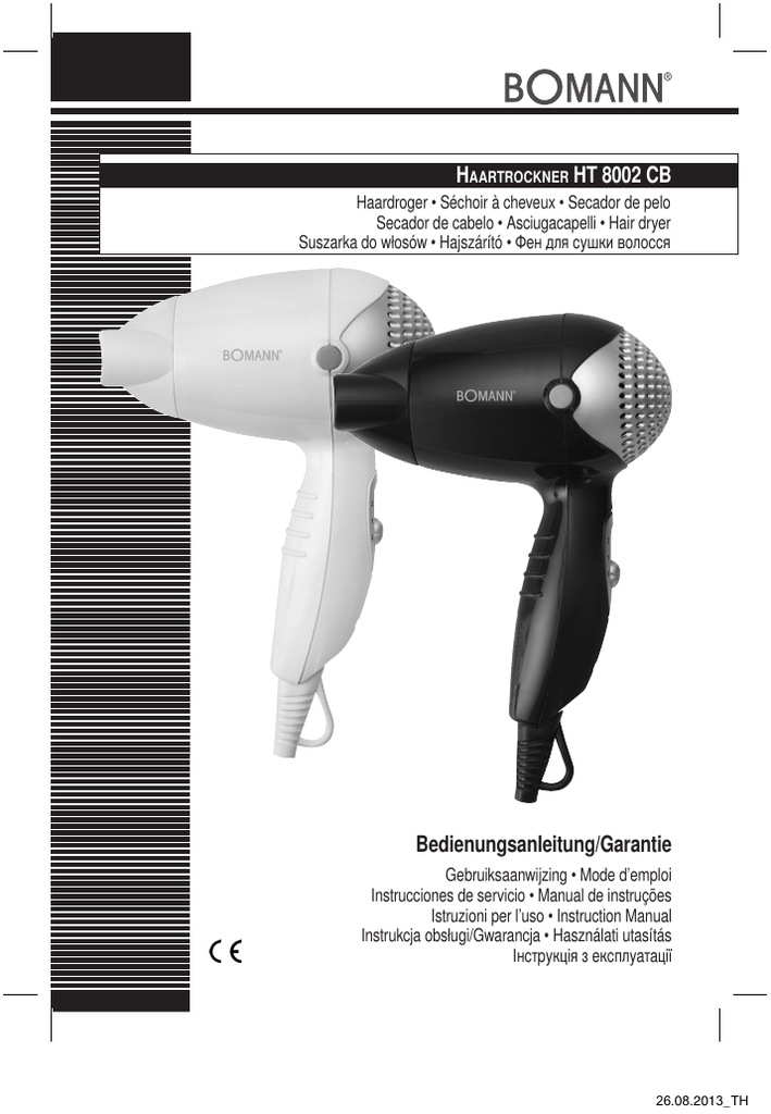 Haartrockner HT 8002 CB Haardroger • Séchoir à cheveux • Secador de pelo Secador de cabelo • Asciugacapelli • Hair dryer Suszarka do włosów • Hajszárító • Фен для сушки волосся Bedienungsanleitung/Garantie Gebruiksaanwijzing • Mode d’emploi Instrucciones de servicio • Manual de instruções Istruzioni per l’uso • Instruction Manual Instrukcja obsługi/Gwarancja • Használati utasítás Інструкція з експлуатації 26.08.2013_TH D Allgemeine Sicherheitshinweise Lesen Sie vor Inbetriebnahme dieses Gerätes die Bedienungsanleitung sehr sorgfältig durch und bewahren Sie diese inkl. Garantieschein, Kassenbon und nach Möglichkeit den Karton mit Innenverpackung gut auf. Falls Sie das Gerät an Dritte weitergeben, geben Sie auch die Bedienungsanleitung mit. • Benutzen Sie das Gerät ausschließlich für den privaten und den dafür vorgesehenen Zweck. Dieses Gerät ist nicht für den gewerblichen Gebrauch bestimmt. Benutzen Sie das Gerät nicht im Freien. Halten Sie es vor Hitze, direkter Sonneneinstrahlung, Feuchtigkeit (auf keinen Fall in Flüssigkeiten tauchen) und scharfen Kanten fern. Benutzen Sie das Gerät nicht mit feuchten Händen. Bei feucht oder nass gewordenem Gerät sofort den Netzstecker ziehen. • Schalten Sie das Gerät aus und ziehen Sie immer den Stecker aus der Steckdose (ziehen Sie am Stecker, nicht am Kabel), wenn Sie das Gerät nicht benutzen, Zubehörteile anbringen, zur Reinigung oder bei Störung. • Betreiben Sie das Gerät nicht unbeaufsichtigt. Sollten Sie den Raum verlassen, schalten Sie das Gerät immer aus. Ziehen Sie den Stecker aus der Steckdose. • Das Gerät und das Netzkabel müssen regelmäßig auf Zeichen von Beschädigungen untersucht werden. Wird eine Beschädigung festgestellt, darf das Gerät nicht mehr benutzt werden. • Verwenden Sie nur Original-Zubehör. • Zur Sicherheit Ihrer Kinder lassen Sie keine Verpackungsteile (Plastikbeutel, Karton, Styropor etc.) erreichbar liegen. WARNUNG! Lassen Sie kleine Kinder nicht mit Folie spielen. Es besteht Erstickungsgefahr! Symbole in dieser Bedienungsanleitung Wichtige Hinweise für Ihre Sicherheit sind besonders gekennzeichnet. Beachten Sie diese Hinweise unbedingt, um Unfälle und Schäden am Gerät zu vermeiden: WARNUNG: Warnt vor Gefahren für Ihre Gesundheit und zeigt mögliche Verletzungsrisiken auf. ACHTUNG: Weist auf mögliche Gefährdungen für das Gerät oder andere Gegenstände hin. HINWEIS: Hebt Tipps und Informationen für Sie hervor. 2 Spezielle Sicherheitshinweise für dieses Gerät D Symbole auf dem Produkt Auf dem Produkt finden Sie Symbole mit Warn- oder Informationscharakter: WARNUNG VOR ELEKTRISCHEM SCHLAG! Dieses Gerät nicht in Nähe von Badewannen, Waschbecken oder anderen Gefäßen benutzen, die Wasser enthalten. WARNUNG: • Dieses Gerät kann von Kindern ab 8 Jahren sowie von Personen mit reduzierten physischen, sensorischen oder mentalen Fähigkeiten oder Mangel an Erfahrung und/oder Wissen benutzt werden, wenn sie beaufsichtigt oder bezüglich des sicheren Gebrauchs des Gerätes unterwiesen wurden und die daraus resultierenden Gefahren verstanden haben. • Kinder dürfen nicht mit dem Gerät spielen. • Reinigung und Benutzer-Wartung dürfen nicht durch Kinder durchgeführt werden, es sei denn, sie sind beaufsichtigt. 3 D • • • • • WARNUNG: Reparieren Sie das Gerät nicht selbst, sondern suchen Sie einen autorisierten Fachmann auf. Um Gefährdungen zu vermeiden, ein defektes Netzkabel nur vom Hersteller, unserem Kundendienst oder einer ähnlich qualifizierten Person durch ein gleichwertiges Kabel ersetzen lassen. Die Düsen werden bei Betrieb heiß! Wird der Haartrockner im Badezimmer verwendet, ziehen Sie nach Gebrauch den Netzstecker, da die Nähe von Wasser eine Gefahr darstellt. Dies gilt auch, wenn der Haartrockner ausgeschaltet ist. Halten Sie keine Gegenstände, Haare oder Ihre Hände vor die Ansaugöffnung! Das Gerät kann trotz Überhitzungsschutz Schaden nehmen, wenn der Luftstrom unterbrochen wird! Achten Sie darauf, dass das Ansauggitter frei von Fusseln oder Haaren bleibt. Brandgefahr! • Als zusätzlicher Schutz wird die Installation einer Fehlerstrom-Schutzeinrichtung (RCD) mit einem Bemessungsauslösestrom von nicht mehr als 30 mA im Badezimmer-Stromkreis empfohlen. Lassen Sie 4 sich bitte von einem autorisierten Elektroinstallateur beraten. D Inbetriebnahme 1. Wickeln Sie das Netzkabel vollständig ab. 2. Vergewissern Sie sich, dass die Gerätespannung (siehe Typenschild) und die Netzspannung übereinstimmen. 3. Setzen Sie ggf. die Düse auf. Mit der Frisierdüse lassen sich durch Bündelung des Luftstromes einzelne Haarpartien gezielt trocknen. 4. Stecken Sie den Stecker in eine vorschriftsmäßig installierte Schutzkontakt-Steckdose. 5. Schieben Sie den Schalter am Griff auf die gewünschte Heiz- / Gebläsestufe: Stufe 0: Stufe 1: Stufe 2: Aus Mäßiger Luftstrom und mäßige Temperatur Starker Luftstrom und hohe Temperatur Ausschalten Schieben Sie den Schalter nach dem Gebrauch auf Position „0“ und ziehen Sie den Netzstecker. Lassen Sie das Gerät vor dem Wegräumen abkühlen! Legen Sie das Gerät dazu auf eine Seite des Gehäuses oder hängen Sie es an der Aufhängeöse auf. Reinigung und Pflege WARNUNG: • Ziehen Sie vor jeder Reinigung den Netzstecker aus der Steckdose. • Das Gerät auf keinen Fall zum Reinigen in Wasser tauchen. Es könnte zu einem elektrischen Schlag oder Brand führen. • Das Gehäuse reinigen Sie mit einem weichen, trockenen Tuch ohne Zusatzmittel. Netzkabel • Wickeln Sie das Netzkabel nur locker auf. • Binden Sie es nicht straff um das Gerät, dies kann auf Dauer zu einem Kabelbruch führen. • Kontrollieren Sie das Netzkabel regelmäßig auf Schäden. 5 D Luftansauggitter • Reinigen Sie das Gitter an der Luftansaugseite des Haartrockners regelmäßig, um Übertemperaturen, durch Hitzestau, zu vermeiden. • Entfernen Sie die vorhandene