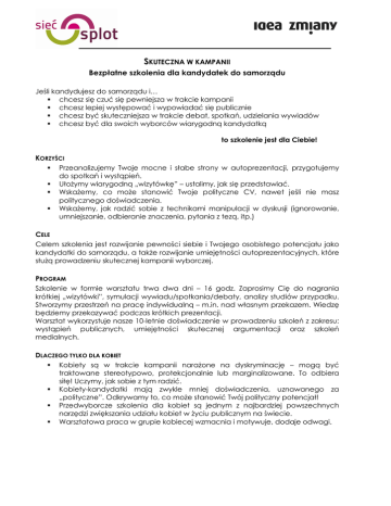 ządowych SPLOT SKUTECZNA W KAMPANII Bezpłatne szkolenia dla kandydatek do samorządu Jeśli kandydujesz do samorządu i… chcesz się czuć się pewniejsza w trakcie kampanii chcesz lepiej występować i wypowiadać się publicznie chcesz być skuteczniejsza w trakcie debat, spotkań, udzielania wywiadów chcesz być dla swoich wyborców wiarygodną kandydatką to szkolenie jest dla Ciebie! KORZYŚCI Przeanalizujemy Twoje mocne i słabe strony w autoprezentacji, przygotujemy do spotkań i wystąpień. Ułożymy wiarygodną „wizytówkę” – ustalimy, jak się przedstawiać. Wskażemy, co może stanowić Twoje polityczne CV, nawet jeśli nie masz politycznego doświadczenia. Wskażemy, jak radzić sobie z technikami manipulacji w dyskusji (ignorowanie, umniejszanie, odbieranie znaczenia, pytania z tezą, itp.) CELE Celem szkolenia jest rozwijanie pewności siebie i Twojego osobistego potencjału jako kandydatki do samorządu, a także rozwijanie umiejętności autoprezentacyjnych, które służą prowadzeniu skutecznej kampanii wyborczej. PROGRAM Szkolenie w formie warsztatu trwa dwa dni – 16 godz. Zaprosimy Cię do nagrania krótkiej „wizytówki”, symulacji wywiadu/spotkania/debaty, analizy studiów przypadku. Stworzymy przestrzeń na pracę indywidualną – m.in. nad własnym przekazem. Wiedzę będziemy przekazywać podczas krótkich prezentacji. Warsztat wykorzystuje nasze 10-letnie doświadczenie w prowadzeniu szkoleń z zakresu: wystąpień publicznych, umiejętności skutecznej argumentacji oraz szkoleń medialnych. DLACZEGO TYLKO DLA KOBIET Kobiety są w trakcie kampanii narażone na dyskryminację – mogą być traktowane stereotypowo, protekcjonalnie lub marginalizowane. To odbiera siłę! Uczymy, jak sobie z tym radzić. Kobiety-kandydatki mają zwykle mniej doświadczenia, uznawanego za „polityczne”. Odkrywamy to, co może stanowić Twój polityczny potencjał! Przedwyborcze szkolenia dla kobiet są jednym z najbardziej powszechnych narzędzi zwiększania udziału kobiet w życiu publicznym na świecie. Warsztatowa praca w grupie kobiecej wzmacnia i motywuje, dodaje odwagi. INICJATORKI I ORGANIZATORZY Projekt jest autorskim przedsięwzięciem trenerek Idei Zmiany (www.ideazmiany.pl). Wyniknął z potrzeby wzmacniania kobiet w życiu publicznym. Realizujemy go dzięki wsparciu i we współpracy z Siecią SPLOT (www.siecsplot.pl). PROWADZĄCE Małgorzata Borowska – trenerka umiejętności społecznych sześcioletnim doświadczeniem. Doświadczenie dotyczące kampanii wyborczych przywiozła ze stażu w brytyjskiej Izbie Lordów, gdzie przygotowywała argumentację do wystąpień Partii Konserwatywnej współpracowała przy programie mentorskim dla kobietkandydatek „Women2Win”. Jest dziennikarką „w stanie spoczynku” – pracowała w Polskim Radiu Pomorza i Kujaw. Przez pięć ostatnich lat prowadziła zajęcia ze skutecznej argumentacji w Stowarzyszeniu Szkoła Liderów. Maja Branka – trenerka i konsultantka z dziesięcioletnim doświadczeniem. Była szefową sztabu wyborczego podczas kampanii samorządowej. Specjalizuje się m.in. w szkoleniach z wystąpień publicznych – uczy jak skutecznie występować i prowadzić prezentacje. Przez 6 lat opracowywała i prowadziła programy rozwojowe i przywódcze dla kobiet (Akademia Równości Kobiet, Akcja Akacja, Instytut Przywództwa Kobiet), realizowane m.in. w Polsce, Kosowie i Gruzji. Założyła i prowadzi firmę Idea Zmiany. Marta Rawłuszko – trenerka i konsultantka w zakresie równości płci i programów na rzecz kobiet. Absolwentka Szkoły Trenerów Biznesu Grupy TROP, prowadzi szkolenia rozwijające umiejętności miękkie dla administracji publicznej oraz organizacji pozarządowych. Autorka programów szkoleniowych dotyczących autoprezentacji i skutecznej argumentacji, realizowanej w Instytucie Liderek w Krakowie oraz podczas Polonijnych Szkół Liderów Europy Zachodniej. Dominika Cieślikowska – psycholożka, trenerka umiejętności psychospołecznych. Specjalizuje się w pracy z grupami kobiecymi w dziedzinie rozwoju kompetencji zawodowych, osobistych, liderskich, przygotowując do aktywnego uczestnictwa w sferze publicznej (szkolenia motywacyjne, planowanie kariery, wystąpienia publiczne, autoprezentacje w świecie biznesu, polityki, mediach) Uczestniczyła w programach dla kobiet w Polsce, Gruzji i Kosowie. WARUNKI UDZIAŁU Pierwszeństwo w szkoleniach będą miały kobiety z małych miejscowości oraz kandydujące po raz pierwszy. Warunkiem przyjęcia na szkolenie jest deklaracja, a następnie rzetelna obecność podczas dwóch dni zajęć. Szkolenie jest bezpłatne, nie pokrywamy jednak kosztów dojazdu, noclegu oraz wyżywienia w trakcie szkolenia. JAK SIĘ ZGŁOSIĆ Szczegóły dotyczące terminu i miejsca szkolenia w Twoim mieście znajdują się na stronach internetowych Ośrodków Sieci SPLOT. 1. Wejdź na stronę Ośrodka 2. Sprawdź termin szkolenia 3. Pobierz formularz zgłoszeniowy 4. Prześlij go na adres podany na stronie 5. Poczekaj na potwierdzenie udziału Sprawdź termin! Pobierz formularz zgłoszeniowy! Zgłoś się: Poznań, www.pisop.org.pl Słupsk, www.cio.slupsk.pl Białystok, www.owop.org.pl Opole, www.ocwip.pl Kraków, www.bis-krakow.pl Elbląg, www.eswip.pl Wrocław, www.rcwip.pl Lublin, www.hf.org.pl Łódź, www.opus.org.pl Do zobaczenia!