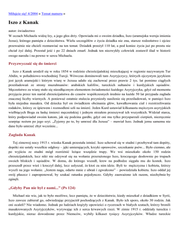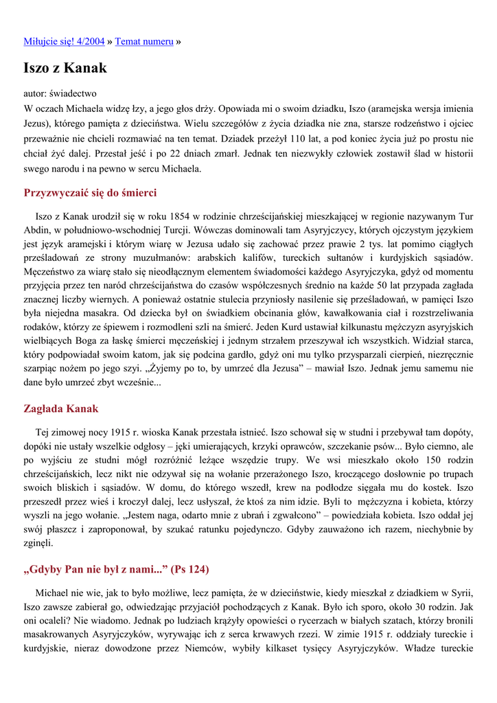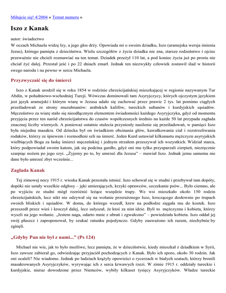 Miłujcie się! 4/2004 » Temat numeru » Iszo z Kanak autor: świadectwo W oczach Michaela widzę łzy, a jego głos drży. Opowiada mi o swoim dziadku, Iszo (aramejska wersja imienia Jezus), którego pamięta z dzieciństwa. Wielu szczegółów z życia dziadka nie zna, starsze rodzeństwo i ojciec przeważnie nie chcieli rozmawiać na ten temat. Dziadek przeżył 110 lat, a pod koniec życia już po prostu nie chciał żyć dalej. Przestał jeść i po 22 dniach zmarł. Jednak ten niezwykły człowiek zostawił ślad w historii swego narodu i na pewno w sercu Michaela. Przyzwyczaić się do śmierci Iszo z Kanak urodził się w roku 1854 w rodzinie chrześcijańskiej mieszkającej w regionie nazywanym Tur Abdin, w południowo-wschodniej Turcji. Wówczas dominowali tam Asyryjczycy, których ojczystym językiem jest język aramejski i którym wiarę w Jezusa udało się zachować przez prawie 2 tys. lat pomimo ciągłych prześladowań ze strony muzułmanów: arabskich kalifów, tureckich sułtanów i kurdyjskich sąsiadów. Męczeństwo za wiarę stało się nieodłącznym elementem świadomości każdego Asyryjczyka, gdyż od momentu przyjęcia przez ten naród chrześcijaństwa do czasów współczesnych średnio na każde 50 lat przypada zagłada znacznej liczby wiernych. A ponieważ ostatnie stulecia przyniosły nasilenie się prześladowań, w pamięci Iszo była niejedna masakra. Od dziecka był on świadkiem obcinania głów, kawałkowania ciał i rozstrzeliwania rodaków, którzy ze śpiewem i rozmodleni szli na śmierć. Jeden Kurd ustawiał kilkunastu mężczyzn asyryjskich wielbiących Boga za łaskę śmierci męczeńskiej i jednym strzałem przeszywał ich wszystkich. Widział starca, który podpowiadał swoim katom, jak się podcina gardło, gdyż oni mu tylko przysparzali cierpień, niezręcznie szarpiąc nożem po jego szyi. „Żyjemy po to, by umrzeć dla Jezusa” – mawiał Iszo. Jednak jemu samemu nie dane było umrzeć zbyt wcześnie... Zagłada Kanak Tej zimowej nocy 1915 r. wioska Kanak przestała istnieć. Iszo schował się w studni i przebywał tam dopóty, dopóki nie ustały wszelkie odgłosy – jęki umierających, krzyki oprawców, szczekanie psów... Było ciemno, ale po wyjściu ze studni mógł rozróżnić leżące wszędzie trupy. We wsi mieszkało około 150 rodzin chrześcijańskich, lecz nikt nie odzywał się na wołanie przerażonego Iszo, kroczącego dosłownie po trupach swoich bliskich i sąsiadów. W domu, do którego wszedł, krew na podłodze sięgała mu do kostek. Iszo przeszedł przez wieś i kroczył dalej, lecz usłyszał, że ktoś za nim idzie. Byli to mężczyzna i kobieta, którzy wyszli na jego wołanie. „Jestem naga, odarto mnie z ubrań i zgwałcono” – powiedziała kobieta. Iszo oddał jej swój płaszcz i zaproponował, by szukać ratunku pojedynczo. Gdyby zauważono ich razem, niechybnie by zginęli. „Gdyby Pan nie był z nami...” (Ps 124) Michael nie wie, jak to było możliwe, lecz pamięta, że w dzieciństwie, kiedy mieszkał z dziadkiem w Syrii, Iszo zawsze zabierał go, odwiedzając przyjaciół pochodzących z Kanak. Było ich sporo, około 30 rodzin. Jak oni ocaleli? Nie wiadomo. Jednak po ludziach krążyły opowieści o rycerzach w białych szatach, którzy bronili masakrowanych Asyryjczyków, wyrywając ich z serca krwawych rzezi. W zimie 1915 r. oddziały tureckie i kurdyjskie, nieraz dowodzone przez Niemców, wybiły kilkaset tysięcy Asyryjczyków. Władze tureckie powiedziały, że każdy Kurd może zabrać sobie wszystko, cokolwiek zdoła zrabować chrześcijanom, więc oni gorliwie zabrali się do roboty, nie szczędząc nikogo. Za cud można uważać fakt, że w regionie Tur Abdin do dziś żyją Asyryjczycy. Iszo na własne oczy widział, jak Kurdowie strącili ze skały w przepaść asyryjskiego księdza, a jemu nic się nie stało. Przerażeni oprawcy pobiegli opowiedzieć o tym imamowi – czy przypadkiem nie Jezus uchronił swojego sługę? Imam zgromił ich i powiedział, że to islam jest najprawdziwszą religią. Wtedy Kurdowie pochwycili imama, zaciągnęli na tę samą skałę i ze słowami: „Zobaczymy, czy Allah ciebie też uchroni” – strącili w dół. Czy można się dziwić, że Iszo z satysfakcją obserwował rozbijającą się o kamienie czaszkę imama? Opowiadają też o mieście Azah (obecnie Idil), że było to jedno z nielicznych miast, które podjęło próbę walki. Oddziały kurdyjskie przez trzy miesiące nie mogły zdobyć miasta, gdyż każdy atak był odpierany potężną kanonadą z armat ustawionych w rejonie kościoła. Opór został złamany dopiero po nadciągnięciu wojsk tureckich dowodzonych przez oficera niemieckiego. Kiedy ten wpadł wraz z żołnierzami do kościoła, zastał tam tłum kobiet i dzieci, trwających na modlitwie. „A gdzie są te wasze armaty?” – spytał. Przerażone kobiety nie wiedziały, o czym mówi. W całym mieście nie było ani jednej armaty. Opowiadają, że oficer ten się nawrócił, a wśród Asyryjczyków do dziś czczona jest Matka Boża z Azahu, która broniła błagającego o wybawienie narodu. Gdzie jesteś, Boże? Czy w obliczu tak wielkiego cierpienia można nie zwątpić? Iszo też miał chwile, kiedy wołał do Boga i nie słyszał odpowiedzi. Największą próbę jego wiara przeszła w obliczu śmierci pewnego niewinnego asyryjskiego chłopca. Po rozstaniu się z ocaleńcami z Kanak Iszo udał się w kierunku miejscowości, gdzie od wieków mieszkali Asyryjczycy. Napotykał jednak zawsze ruiny i trupy. Kiedy dotarł do pewnej wsi, zobaczył, że jest ona zaludniona, lecz słyszał wyłącznie mowę kurdyjską. Iszo zrozumiał, że domy Asyryjczyków zostały zajęte przez Kurdów. Nie miał wyjścia – dalsze błąkanie się oznaczało dla niego śmierć z wycieńczenia. Udając włóczęgę poszukującego pracy, najął się za bochenek chleba dziennie do wypasania bydła nowych gospodarzy wsi. Powierzono mu o