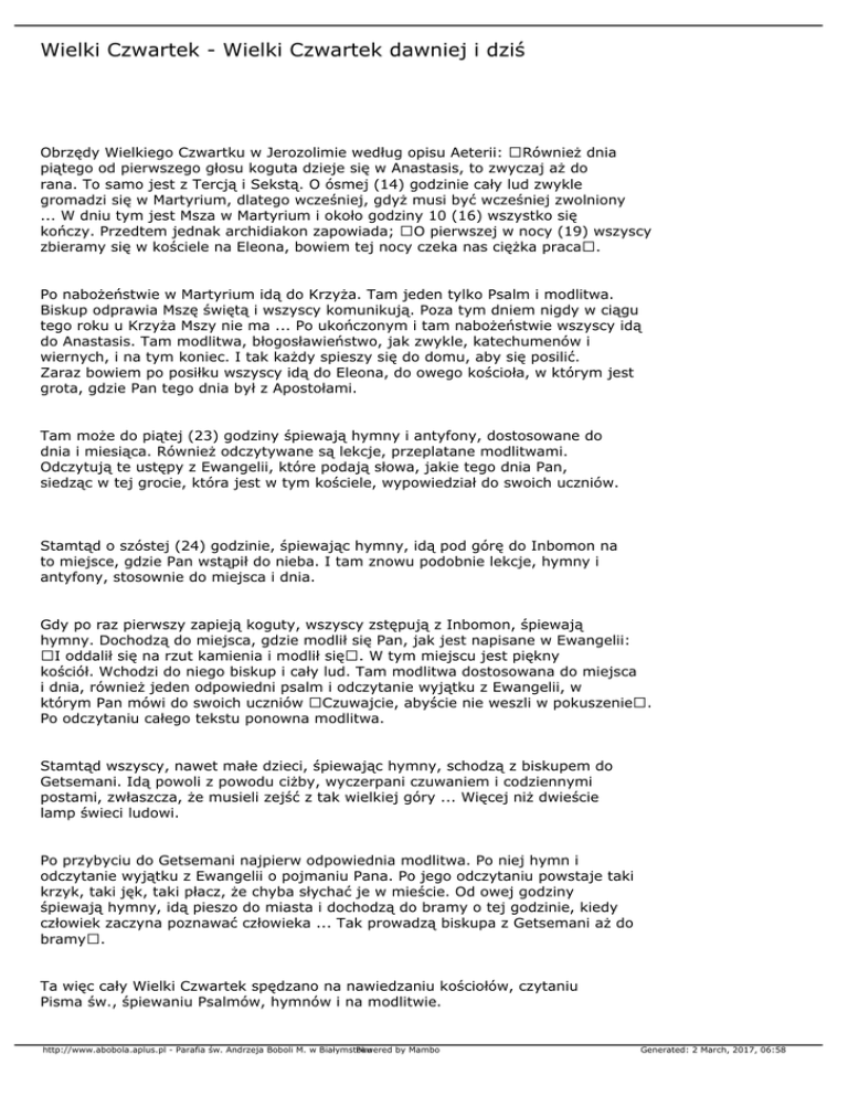 Wielki Czwartek - Wielki Czwartek dawniej i dziś Obrzędy Wielkiego Czwartku w Jerozolimie według opisu Aeterii: Również dnia piątego od pierwszego głosu koguta dzieje się w Anastasis, to zwyczaj aż do rana. To samo jest z Tercją i Sekstą. O ósmej (14) godzinie cały lud zwykle gromadzi się w Martyrium, dlatego wcześniej, gdyż musi być wcześniej zwolniony ... W dniu tym jest Msza w Martyrium i około godziny 10 (16) wszystko się kończy. Przedtem jednak archidiakon zapowiada; O pierwszej w nocy (19) wszyscy zbieramy się w kościele na Eleona, bowiem tej nocy czeka nas ciężka praca. Po nabożeństwie w Martyrium idą do Krzyża. Tam jeden tylko Psalm i modlitwa. Biskup odprawia Mszę świętą i wszyscy komunikują. Poza tym dniem nigdy w ciągu tego roku u Krzyża Mszy nie ma ... Po ukończonym i tam nabożeństwie wszyscy idą do Anastasis. Tam modlitwa, błogosławieństwo, jak zwykle, katechumenów i wiernych, i na tym koniec. I tak każdy spieszy się do domu, aby się posilić. Zaraz bowiem po posiłku wszyscy idą do Eleona, do owego kościoła, w którym jest grota, gdzie Pan tego dnia był z Apostołami. Tam może do piątej (23) godziny śpiewają hymny i antyfony, dostosowane do dnia i miesiąca. Również odczytywane są lekcje, przeplatane modlitwami. Odczytują te ustępy z Ewangelii, które podają słowa, jakie tego dnia Pan, siedząc w tej grocie, która jest w tym kościele, wypowiedział do swoich uczniów. Stamtąd o szóstej (24) godzinie, śpiewając hymny, idą pod górę do Inbomon na to miejsce, gdzie Pan wstąpił do nieba. I tam znowu podobnie lekcje, hymny i antyfony, stosownie do miejsca i dnia. Gdy po raz pierwszy zapieją koguty, wszyscy zstępują z Inbomon, śpiewają hymny. Dochodzą do miejsca, gdzie modlił się Pan, jak jest napisane w Ewangelii: I oddalił się na rzut kamienia i modlił się. W tym miejscu jest piękny kościół. Wchodzi do niego biskup i cały lud. Tam modlitwa dostosowana do miejsca i dnia, również jeden odpowiedni psalm i odczytanie wyjątku z Ewangelii, w którym Pan mówi do swoich uczniów Czuwajcie, abyście nie weszli w pokuszenie. Po odczytaniu całego tekstu ponowna modlitwa. Stamtąd wszyscy, nawet małe dzieci, śpiewając hymny, schodzą z biskupem do Getsemani. Idą powoli z powodu ciżby, wyczerpani czuwaniem i codziennymi postami, zwłaszcza, że musieli zejść z tak wielkiej góry ... Więcej niż dwieście lamp świeci ludowi. Po przybyciu do Getsemani najpierw odpowiednia modlitwa. Po niej hymn i odczytanie wyjątku z Ewangelii o pojmaniu Pana. Po jego odczytaniu powstaje taki krzyk, taki jęk, taki płacz, że chyba słychać je w mieście. Od owej godziny śpiewają hymny, idą pieszo do miasta i dochodzą do bramy o tej godzinie, kiedy człowiek zaczyna poznawać człowieka ... Tak prowadzą biskupa z Getsemani aż do bramy. Ta więc cały Wielki Czwartek spędzano na nawiedzaniu kościołów, czytaniu Pisma św., śpiewaniu Psalmów, hymnów i na modlitwie. http://www.abobola.aplus.pl - Parafia św. Andrzeja Boboli M. w Białymstoku Powered by Mambo Generated: 2 March, 2017, 06:58 Dzisiaj w Jerozolimie obrzędy Wielkiego Czwartku odbywają się inaczej, gdyż panami bazyliki Groby Pańskiego są prawosławni. A oto opis jednego z uczestników: Zasiada patriarcha grecki i dwunastu apostołów w Wieczerniku, w scenie umywania nóg przez Jezusa. Patriarcha przyklęka po kolei przy każdym z nich i spełnia rytuał liturgiczny. Gdy zbliża się do Piotra, wymienia z nim słowa przekazane przez Ewangelię. Obrzęd ten ma charakter dramatu liturgicznego i nasuwa myśl o misteriach kościelnych, tak dobrze znanych z naszego katolickiego średniowiecza i obrzędów chrześcijańskich z Bizancjum. Tutaj scena znajduje się w pobliżu kościoła, role są obsadzane przez kler w strojach liturgicznych, dialogi ułożone są według słów Pisma św. Tego samego dnia, w kościele armeńskim św. Jakuba asystowaliśmy przy podobnym rytuale, mającym przypomnieć dowolne uniżenie się Jakuba wobec swoich uczniów. Zebraliśmy się w pobliżu świątyni św. Piotra, na stopniach pozostałych ze starych schodów, które w starożytności łączyły dzielnicę, gdzie odbywała się uczta, z Getsemani. Te stopnie są jedynym istniejącym śladem jednej ze stromych uliczek dawnej Jerozolimy. Chrystus przechodził tędy wiele razy, być może i wówczas, gdy udał się ze swymi apostołami na Górę Oliwną, by tam spędzić noc na modlitwie. Zstępujemy ku dolinie wśród głośnego szmeru modlitw. Wydaje się nam, że idziemy pośród apostołów, a Pan idzie z nami. Na lewo wznosi się wieżyczka świątyni, z drugiej strony dolina Jozefata, piętrzy się mnóstwo grobów żydowskich. Poprzez te cienie Starego Testamentu wkraczamy do Getsemani. Stary zwyczaj Jerozolimski chce, by spędzić Wigilię Wielkiego Czwartku i Wielkiego Piątku u stóp Góry Oliwnej, tam gdzie miała miejsce agonia i pojmanie Jezusa. I my z kolei zatrzymaliśmy się w Getsemani, pod tysiącletnimi oliwkami, wracając myślą do tego, co przeżywał Jezus w tym ogrodzie pełnym kwiatów. Dzień Wielkiego Czwartku posiada wyjątkowo dużą liczbę nazw. W językach narodowych niektóre nazwy nawiązują do publicznego pojednania grzeszników, które odbywało się w Wielki Czwartek: Jeudi absolu (obecnie Jeudi Saintinne). Inne nazwy zawierają odniesienie do ceremonii umycia nóg mandatum. Obrzęd ten zachowany jest do dziś w liturgii. W Rzymie pojawił się w XII wieku. Mszał Piusa V przewidywał umycie nóg po Mszy św., a od 1955 r. przewidziane jest ono po Ewangelii i homilii. Przed reformą w 1955 r. obrzęd ten zarezerwowany był dla biskupów i opatów. Obecnie poleca się go w każdej parafii. Godzina celebracji liturgii zmieniała się w ciągu wieków. Odbywała się między trzecią a dziewiątą. Z Pamiętnika Egerii (35-36) wynika, że w Wielki Czwartek w Jerozolimie sprawowano dwie Msze św.. Pierwsza w godzinach 