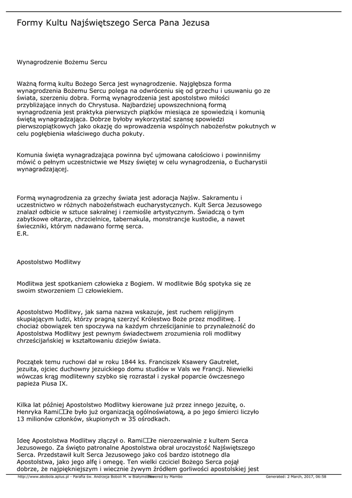 Formy Kultu Najświętszego Serca Pana Jezusa Wynagrodzenie Bożemu Sercu Ważną formą kultu Bożego Serca jest wynagrodzenie. Najgłębsza forma wynagrodzenia Bożemu Sercu polega na odwróceniu się od grzechu i usuwaniu go ze świata, szerzeniu dobra. Formą wynagrodzenia jest apostolstwo miłości przybliżające innych do Chrystusa. Najbardziej upowszechnioną formą wynagrodzenia jest praktyka pierwszych piątków miesiąca ze spowiedzią i komunią świętą wynagradzająca. Dobrze byłoby wykorzystać szansę spowiedzi pierwszopiątkowych jako okazję do wprowadzenia wspólnych nabożeństw pokutnych w celu pogłębienia właściwego ducha pokuty. Komunia święta wynagradzająca powinna być ujmowana całościowo i powinniśmy mówić o pełnym uczestnictwie we Mszy świętej w celu wynagrodzenia, o Eucharystii wynagradzającej. Formą wynagrodzenia za grzechy świata jest adoracja Najśw. Sakramentu i uczestnictwo w różnych nabożeństwach eucharystycznych. Kult Serca Jezusowego znalazł odbicie w sztuce sakralnej i rzemiośle artystycznym. Świadczą o tym zabytkowe ołtarze, chrzcielnice, tabernakula, monstrancje kustodie, a nawet świeczniki, którym nadawano formę serca. E.R. Apostolstwo Modlitwy Modlitwa jest spotkaniem człowieka z Bogiem. W modlitwie Bóg spotyka się ze swoim stworzeniem człowiekiem. Apostolstwo Modlitwy, jak sama nazwa wskazuje, jest ruchem religijnym skupiającym ludzi, którzy pragną szerzyć Królestwo Boże przez modlitwę. I chociaż obowiązek ten spoczywa na każdym chrześcijaninie to przynależność do Apostolstwa Modlitwy jest pewnym świadectwem zrozumienia roli modlitwy chrześcijańskiej w kształtowaniu dziejów świata. Początek temu ruchowi dał w roku 1844 ks. Franciszek Ksawery Gautrelet, jezuita, ojciec duchowny jezuickiego domu studiów w Vals we Francji. Niewielki wówczas krąg modlitewny szybko się rozrastał i zyskał poparcie ówczesnego papieża Piusa IX. Kilka lat później Apostolstwo Modlitwy kierowane już przez innego jezuitę, o. Henryka Ramière było już organizacją ogólnoświatową, a po jego śmierci liczyło 13 milionów członków, skupionych w 35 ośrodkach. Ideę Apostolstwa Modlitwy złączył o. Ramière nierozerwalnie z kultem Serca Jezusowego. Za święto patronalne Apostolstwa obrał uroczystość Najświętszego Serca. Przedstawił kult Serca Jezusowego jako coś bardzo istotnego dla Apostolstwa, jako jego alfę i omegę. Ten wielki czciciel Bożego Serca pojął dobrze, że najpiękniejszym i wiecznie żywym źródłem gorliwości apostolskiej jest http://www.abobola.aplus.pl - Parafia św. Andrzeja Boboli M. w Białymstoku Powered by Mambo Generated: 2 March, 2017, 06:58 Serce Zbawiciela. O. Ramière zadania Apostolstwa Modlitwy ujął w takich słowach: Dać Chrystusowi prawdziwych przyjaciół, całą duszą oddanych Mu zwolenników, apostołów, którzy by się starali jedynie bronić Bożej sprawy i szerzyć chwałę Jezusa: najpierw przez modlitwę, ona bowiem jest w mocy każdego, a następnie przez czyny to znowu jest celem naszego Stowarzyszenia ... Nie bądźmy obojętni dla żadnej sprawy drogiej Boskiemu Sercu, pokochajmy wszystko, co Jezus miłuje, odwracajmy się od tego, czego On nienawidzi, popierajmy czynnie wszelkie praktyki mające na celu uwielbienie Najświętszego Serca, a nade wszystko usiłujmy serdecznie przysparzać Mu chwały, jaką je okrywa ustawiczne pomnażanie się szeregów dusz wybranych, które oddają się Jezusowi bez żadnych zastrzeżeń. W ten sposób pojmując Apostolstwo Modlitwy wprowadzamy w czyn jak najdoskonalej nabożeństwo do Boskiego Serca. Apostolstwo Modlitwy nabrało szczególnego znaczenia po Soborze Watykańskim II. Jako posoborowy ruch religijny jest tą formą działalności apostolskiej, którą potrafią urzeczywistniać wszyscy wierzący, ponieważ na mocy sakramentu chrztu, uczestnicząc w kapłańskiej, królewskiej i proroczej funkcji Jezusa Chrystusa, powołani są i zobowiązani do apostołowania w świecie. Zjednoczenie z Chrystusem Panem jest możliwe wyłącznie na drodze miłości. Dlatego Apostolstwo Modlitwy przywiązuje szczególną wagę do kultu Najświętszego Serca Jezusowego. Istotą bowiem tego kultu jest oddawana cześć niezgłębionej tajemnicy miłości Boga do ludzi, którą Chrystus ukazał nam w swoim życiu i w swojej nauce. Przede wszystkim zaś w misterium paschalnym, czyli w Męce, Śmierci i w Zmartwychwstaniu. Członkowie Apostolstwa Modlitwy starając się głębiej wnikać w te tajemnice i należycie je przeżywać, oddają cześć nieskończonej Miłości Zbawiciela, którego przebite Serce stało się źródłem nadprzyrodzonego życia dla Kościoła. KB Intronizacja poświęcenie rodzin Sercu Bożemu Poświęcenie rodzin to jedno z wielkich dzieł Apostolstwa Modlitwy. Jest to inicjatywa o. Ramièrie, który przez poświęcenie małych społeczności chciał przygotować drogę do poświęcenia całego Kościoła. Nawiązał z nim kontakt Teodor Wibaux, początkowo żołnierz, później jezuita, apostoł biednych wieśniaków i rybaków na angielskiej wyspie Jersej. Odwiedzał on ubogie domy swoich wiernych, rozdawał obrazy Serca Jezusowego i poświęcał rodziny Najświętszemu Sercu. Praktyka poświęcenia się Najświętszemu Sercu wchodziła w życie Kościoła w miarę rozwoju kultu. Głównym jej źródłem była miłość. Bogu Miłości, który upominał się o ludzką miłość, należało odpowiedzieć miłością, oddaniem i poświęceniem. Gorliwymi zwolennikami tej praktyki byli: Jan Eudes, Klaudiusz la Colombière, http://www.abobola.aplus.pl - Parafia św. Andrzeja Boboli M. w Białymstoku Powered by Mambo Generated: 2 March, 2017, 06:58 Małgorzata Maria Alacoque i kardynał Bèrulle. Oni zapoczątkowali osobiste poświęcenie Najświętszemu Sercu. Z biegiem czasu rozpowszechniło się w Kościele poświęcenie wspólne. Małgorzata Maria Alacoque jako mistrzyni nowicjatu oddała S