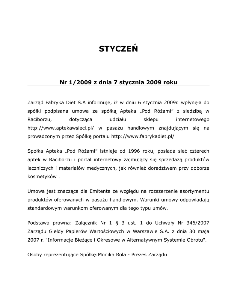 STYCZEŃ Nr 1/2009 z dnia 7 stycznia 2009 roku Zarząd Fabryka Diet S.A informuje, iż w dniu 6 stycznia 2009r. wpłynęła do spółki podpisana umowa ze spółką Apteka „Pod Różami” z siedzibą w Raciborzu, dotycząca udziału sklepu internetowego http://www.aptekawsieci.pl/ w pasażu handlowym znajdującym się na prowadzonym przez Spółkę portalu http://www.fabrykadiet.pl/ Spółka Apteka „Pod Różami” istnieje od 1996 roku, posiada sieć czterech aptek w Raciborzu i portal internetowy zajmujący się sprzedażą produktów leczniczych i materiałów medycznych, jak również doradztwem przy doborze kosmetyków . Umowa jest znacząca dla Emitenta ze względu na rozszerzenie asortymentu produktów oferowanych w pasażu handlowym. Warunki umowy odpowiadają standardowym warunkom oferowanym dla tego typu umów. Podstawa prawna: Załącznik Nr 1 § 3 ust. 1 do Uchwały Nr 346/2007 Zarządu Giełdy Papierów Wartościowych w Warszawie S.A. z dnia 30 maja 2007 r. "Informacje Bieżące i Okresowe w Alternatywnym Systemie Obrotu". Osoby reprezentujące Spółkę:Monika Rola - Prezes Zarządu Nr 2/2009 z dnia 30 stycznia 2009 roku Zarząd Fabryka Diet S.A. informuje, że w dniu dzisiejszym otrzymał podpisaną umowę z dnia 21 stycznia 2009 r. ze spółką Polskie Radio Rozgłośnia Regionalna w Warszawie - ,,Radio dla Ciebie'' S.A. z siedzibą w Warszawie. Portal internetowy http://www.fabrykadiet.pl/ prowadzony przez Fabrykę Diet S.A. weźmie udział w akcji promocyjno-reklamowej "Tydzień Urody" poświęconej pielęgnacji i urodzie na antenie Radia Dla Ciebie. Radio Dla Ciebie (jedna ze spółek Polskiego Radia SA) jest to największa rozgłośnia lokalna działająca na terenie woj. mazowieckiego. Jako partner akcji, Fabryka Diet SA, będzie obecna w spotach reklamowych i audycjach sponsorowanych emitowanych na antenie RDC, a logo firmy będzie zamieszczone na głównej stronie rozgłośni. W marcu 2009 r. na antenie RDC będzie wyemitowanych 25 spotów reklamowych Fabryki Diet S.A. Umowa została zawarta na ogólnych warunkach. Zarząd Emitenta uważa podpisaną umową za istotną, ponieważ jest elementem budowy strategii marketingowo-medialnej spółki. Podstawa prawna: Załącznik Nr 1 § 3 ust. 1 do Uchwały Nr 346/2007 Zarządu Giełdy Papierów Wartościowych w Warszawie S.A. z dnia 30 maja 2007 r. "Informacje Bieżące i Okresowe w Alternatywnym Systemie Obrotu". Osoby reprezentujące spółkę:Monika Rola - Prezes Zarządu LUTY Nr 3/2009 z dnia 5 lutego 2009 roku Zarząd Spółki Fabryka Diet S.A. informuje, że w dniu 05.02. 2009r. Rada Nadzorcza podjęła uchwałę w sprawie wyboru biegłego rewidenta do zbadania sprawozdania finansowego Spółki za rok 2008 r. sporządzonego dnia 31.12. 2008 roku. Rada Nadzorcza wybrała BR Audyt Sp. z o.o. z siedzibą w Płońsku przy ul. 19-go Stycznia 41B. Spółka BR Audyt z siedzibą w Płońsku została wpisana do Rejestru Przedsiębiorców KRS dnia 30.07.2003r. pod nr 0000169310, a na listę podmiotów uprawnionych do badania sprawozdań finansowych Krajowej Izby Biegłych Rewidentów w Warszawie pod numerem 2792 dnia 15.07.2003r. Podstawa prawna: § 3 ust. 1 Załącznika nr 1 do Uchwały nr 346/2007 Zarządu Giełdy Papierów Wartościowych w Warszawie S.A. z dnia 30 maja 2007 r. Informacje Bieżące i Okresowe w Alternatywnym Systemie Obrotu. Osoby reprezentujące spółkę:Monika Rola - Prezes Zarządu Nr 4/2009 z dnia 11 lutego 2009 roku Zarząd Fabryka Diet S.A. informuje, że uruchomił w ramach prowadzonych już usług pion, który będzie specjalizował się w działaniach multimedialnych. Fabryka Diet S.A nawiązała współpracę z wiodącym na rynku dostawcą usług dodanych, spółką MNI Premium, który oferuje szeroki zakres usług multimedialnych dla rynku medialnego i telekomunikacyjnego. W opinii Zarządu działalność multimedialna ma stanowić jedno z istotnych źródeł przychodów Spółki. Spodziewane dochody z tego tytułu mają docelowo stanowić ok. 20% zakładanych wpływów w 2009 roku. Podstawa prawna: § 3 ust. 1 Załącznika nr 1 do Uchwały nr 346/2007 Zarządu Giełdy Papierów Wartościowych w Warszawie S.A. z dnia 30 maja 2007 r. Informacje Bieżące i Okresowe w Alternatywnym Systemie Obrotu. Osoby reprezentujące spółkę:Monika Rola - Prezes Zarządu Nr 5/2009 z dnia 13 lutego 2009 Zgodnie z punktem 16 Załącznika Nr 1 do Uchwały Nr 795/2008 Zarządu Giełdy z dnia 31 października 2008r. Zarząd Fabryka Diet SA przekazuje miesięczny raport dotyczący:1) - istotnych zdarzeń w otoczeniu rynkowym Emitenta – styczeń 2009r.2) - raportów bieżących opublikowanych w styczniu 2009r.3) – informacji na temat celów emisji, jeżeli ich realizacja nastąpiła w styczniu4) - wydarzeń mających mieć miejsce w marcu 2009r. Ad.1) W styczniu nie wystąpiły istotne zdarzenia w otoczeniu rynkowym Emitenta. Ad.2)RB 1/2009 - Zawarcie umowyZarząd Fabryka Diet S.A. poinformował o otrzymaniu w dniu 06 stycznia 2009 roku umowy ze spółką Apteką „Pod Różami” dotyczącą udziału sklepu internetowego http://www.aptekawsieci.pl/ w pasażu handlowym znajdującym się na prowadzonym przez spółkę portalu http://www.fabrykadiet.pl/ .RB 2/2009 - Istotna informacja Spółka przekazała informację o wpłynięciu w dniu 21 stycznia 2009 roku umowy ze spółką Polskie Radio Rozgłośnia Radiowa w Warszawie „Radio dla Ciebie” S.A. dotyczącej udziału w akcji promocyjno-reklamowej „Tydzień Urody”. Ad.3)Spółka zrealizowała następujące cele, które przedstawione zostały w Dokumencie Informacyjnym opublikowanym 5 grudnia 2008r. o strategii Spółki:budowa znajomości marki „Fabryka Diet” jako najważniejszego znaku na rynku towarów i usług związanych z dietą, prawidłowym odżywianiem oraz zdrowym trybem życia,budowa oferty towarów i usług o najwyższej jakości, sprawdzonych i polecanych przez specjalistów Emitenta, Ad.4) W marcu 2009r. Zarząd Fabryka Diet S.A. pla