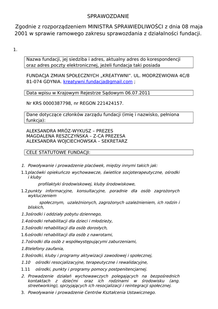 SPRAWOZDANIE Zgodnie z rozporządzeniem MINISTRA SPRAWIEDLIWOŚCI z dnia 08 maja 2001 w sprawie ramowego zakresu sprawozdania z działalności fundacji. 1. Nazwa fundacji, jej siedziba i adres, aktualny adres do korespondencji oraz adres poczty elektronicznej, jeżeli fundacja taki posiada FUNDACJA ZMIAN SPOŁECZNYCH „KREATYWNI”. UL. MODRZEWIOWA 4C/8 81-074 GDYNIA. [email protected] ; Data wpisu w Krajowym Rejestrze Sądowym 06.07.2011 Nr KRS 0000387798, nr REGON 221424157. Dane dotyczące członków zarządu fundacji (imię i nazwisko, pełniona funkcja): ALEKSANDRA MRÓZ-WYKUSZ – PREZES MAGDALENA RESZCZYŃSKA – Z-CA PREZESA ALEKSANDRA WOJCIECHOWSKA – SEKRETARZ CELE STATUTOWE FUNDACJI: 1. Powoływanie i prowadzenie placówek, między innymi takich jak: 1.1 placówki opiekuńczo wychowawcze, świetlice socjoterapeutyczne, ośrodki i kluby profilaktyki środowiskowej, kluby środowiskowe, 1.2 punkty informacyjne, konsultacyjne, poradnie dla osób zagrożonych wykluczeniem społecznym, uzależnionych, zagrożonych uzależnieniem, ich rodzin i bliskich, 1.3ośrodki i oddziały pobytu dziennego, 1.4ośrodki rehabilitacji dla dzieci i młodzieży, 1.5ośrodki rehabilitacji dla osób dorosłych, 1.6 ośrodki rehabilitacji dla osób z nawrotami, 1.7ośrodki dla osób z współwystępującymi zaburzeniami, 1.8telefony zaufania, 1.9ośrodki, kluby i programy aktywizacji zawodowej i społecznej, 1.10 ośrodki resocjalizacyjne, terapeutyczne i rewalidacyjne, 1.11 ośrodki, punkty i programy pomocy postpenitencjarnej. 2. Prowadzenie działań wychowawczych polegających na bezpośrednich kontaktach z dziećmi oraz ich rodzinami w środowisku (ang. streetworking), sprzyjających ich resocjalizacji i reintegracji społecznej. 3. Powoływanie i prowadzenie Centrów Kształcenia Ustawicznego. 4. Organizację szkoleń przygotowujących pracowników i wolontariuszy do pracy z osobami zagrożonymi wykluczeniem i wykluczonymi społecznie. 5. Wspieranie innych organizacji trzeciego sektora środowiskami zagrożonymi wykluczeniem społecznym. zajmujących się 6. Inspirowanie i prowadzenie z zachowaniem obowiązujących przepisów działalności publikacyjnej i wydawniczej. 7. Współpracę ze środkami masowego przekazu. 8. Opracowywanie i realizowanie programów profilaktycznych, edukacyjnych, informacyjnych i promocji zdrowia dla dzieci, młodzieży i dorosłych. 9. Organizowanie imprez okolicznościowych dla dzieci i młodzieży. 10.Organizowanie wypoczynku dla dzieci i młodzieży. 11.Inicjowanie i prowadzenie badań w obszarze problemów społecznych. 12.Organizowanie zjazdów, sympozjów i innych form wymiany informacji i doświadczeń. 13.Tworzenie Centrów i Klubów Integracji Społecznej. 14.Pozafinansowe wspieranie rodzin w trudnej sytuacji życiowej. 15.Inicjowanie form samopomocy integrujących środowiska młodzieżowe, rodzinne i szkolne w celu minimalizacji zagrożeń społecznych. 16.Wspieranie lokalnych społeczności w celu samoorganizacji 17.Prowadzenie współpracy z instytucjami rządowymi i samorządowymi oraz organizacjami społecznymi z kraju i zagranicy. 18.Inicjowanie, organizowanie, realizacja i promowanie projektów artystycznych na rzecz wzmacniania potencjału społecznego, wspieranie działań architektonicznych, gdzie środowisko jest rozumiane, jako przestrzeń dla wzajemnych interakcji. 19.Propagowanie koncepcji samorządności i rozwoju lokalnego, wzmocnienia III sektora oraz zatrudnienia w sektorze ekonomii społecznej. 20.Budowanie partnerstw, integrację społeczną. koalicji oraz inicjatyw ukierunkowanych na b) działalność odpłatna pożytku publicznego j.w. 2. Zasady, formy i zakres działalności statutowej z podaniem realizacji celów statutowych, a także opis głównych zdarzeń prawnych w jej działalności o skutkach finansowych. CELE I ZASADY FUNDACJI: Prowadzenie działalności społecznie użytecznej, prowadzenie działalności na rzecz rozwoju, ochrony, promocji zdrowia oraz promowanie zdrowego stylu życia, promowanie twórczego rozwoju osobowościowego, wszechstronna pomoc świadczona na rzecz osób i grup zagrożonych wykluczeniem społecznym i wykluczonym społecznie, ze szczególnym uwzględnieniem dzieci i młodzieży, w tym dzieci z rodzin w trudnej sytuacji życiowej, dysfunkcyjnych oraz ze środowisk społecznie zaniedbanych, a także osób zagrożonych uzależnieniem, uzależnionych, wykorzystywanych i nieprzystosowanych społecznie, pomoc społeczna, w tym pomoc rodzinom w trudnej sytuacji życiowej oraz wyrównywanie szans tych rodzin i osób, inne. Fundacja prowadzi działalność od sierpnia 2011 roku. Działania podjęte: - złożono projekty do KB ds. PN (otrzymaliśmy jedną dotację na 2012r. kwota 10.000zł – grupa młodzieżowa) - złożono projekty do UM Gdańsk (suma dotacji 30.000zł na 2012r. - wyjazd wakacyjny, projekt foto, świetlica, warsztaty dla rodziców) - nawiązanie współpracy z lokalnymi władzami: Gdynia, Gdańsk - pakowanie paczek w ramach organizacji Wigilii dla potrzebujących mieszkańców Gdyni - praca nad wizją działań na 2012 rok - współpraca zespołu w ramach wolontariatu - współpraca z wolontariuszami przy KO Apteka - realizacja spotkań informacyjno-edukacyjnych – działalność odpłatna FUNDACJI 3. Informacja o prowadzonej działalności gospodarczej według wpisu do rejestru przedsiębiorców Krajowego Rejestru Sądowego Nie dotyczy 4. Odpisy uchwał zarządu fundacji - UCHWAŁA nr1 W SPRAWIE WYBORU CZŁONKÓW ZARZĄDU FUNDACJI 28.04.2011r. - UCHWAŁA nr2 FUNDATORA FUNDACJI ZMIAN SPOŁECZNYCH „KREATYWNI” W SPRAWIE WYBORU CZŁONKÓW RADY FUNDACJI 28.04.2011r. -UCHWAŁA nr3 W SPRAWIE PRZYJĘCIA STATUTU 28.04.2011r. - UCHWAŁA nr 4 W SPRAWIE POPRAWEK W STATUCIE FUNDACJI ZMIAN SPOŁECZNYCH „KREATYWNI” 28.04.2011r. Przyjęcie i uchwalenie statutu po zmianach do przyjęcia do rejestracji w dniu 23.05.2011r. 5. Informacja o wysokości uzyskanych przychodów, z wyodrębnieniem ich źr