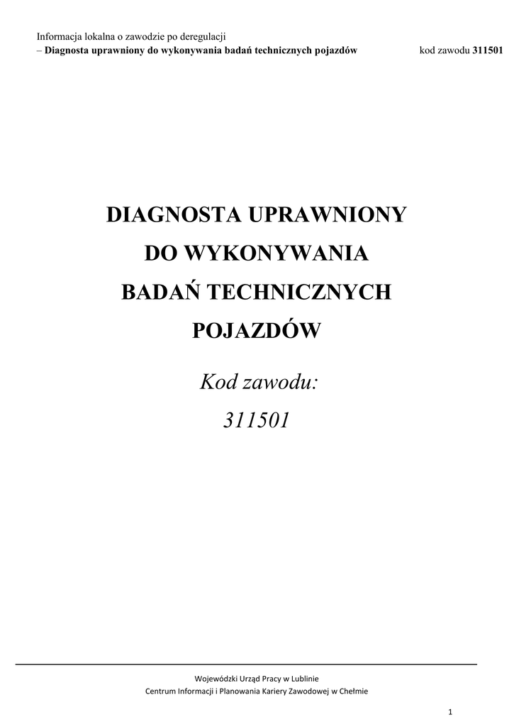 Informacja lokalna o zawodzie po deregulacji – Diagnosta uprawniony do wykonywania badań technicznych pojazdów kod zawodu 311501 DIAGNOSTA UPRAWNIONY DO WYKONYWANIA BADAŃ TECHNICZNYCH POJAZDÓW Kod zawodu: 311501 Wojewódzki Urząd Pracy w Lublinie Centrum Informacji i Planowania Kariery Zawodowej w Chełmie 1 Informacja lokalna o zawodzie po deregulacji – Diagnosta uprawniony do wykonywania badań technicznych pojazdów kod zawodu 311501 1. Zadania zawodowe Osoba na stanowisku diagnosty odpowiada za wykonywanie badań technicznych pojazdów; zajmuje się oceną stanu technicznego pojazdów bez ich demontażu lub z demontażem częściowym bez naruszania podstawowego funkcjonowania połączeń elementów. Do zadań diagnosty uprawnionego do wykonywania badań technicznych pojazdów należy: przeprowadzanie badań technicznych pojazdów przy wykorzystaniu specjalnej aparatury techniczno-pomiarowej i metod badań określonych przez producentów pojazdów samochodowych i ich układów i zespołów; ocenianie stanu technicznego poszczególnych układów i zespołów pojazdów mechanicznych na podstawie analizy wartości parametrów stanu w porównaniu z wartościami parametrów podanych przez producenta w instrukcjach eksploatacji pojazdów; określanie rodzaju i zakresu koniecznych naprawy lub konserwacji pojazdu oraz sprawdzanie stanu technicznego pojazdu po wykonanej naprawie; prowadzenie ewidencji przeprowadzonych badań technicznych pojazdów zgodnie z obowiązującymi przepisami prawa w tym zakresie; dbanie o powierzony sprzęt diagnostyczny, dokonywanie terminowej kontroli stanu technicznego sprzętu oraz jego pomiarów; podejmowanie działań na rzecz budowania dobrego wizerunku stacji kontroli pojazdów; budowanie bazy klientów stacji kontroli pojazdów, aktywna współpraca z serwisem samochodów osobowych i użytkowych. Wojewódzki Urząd Pracy w Lublinie Centrum Informacji i Planowania Kariery Zawodowej w Chełmie 2 Informacja lokalna o zawodzie po deregulacji – Diagnosta uprawniony do wykonywania badań technicznych pojazdów kod zawodu 311501 2. Warunki podjęcia pracy w zawodzie Uprawnienia do wykonywania badań technicznych wydaje starosta właściwy ze względu na miejsce zamieszkania, na podstawie wniosku kandydata. Osoba, która chce zostać diagnostą uprawnionym do wykonywania badań technicznych pojazdów musi (Ustawa z dnia 20 czerwca 1997r. Prawo o ruchu drogowym. Art. 84 (Dz. U. z 2012 r. poz. 1137)): posiadać wymagane wykształcenie techniczne i praktykę; w zależności od posiadanego wykształcenia kandydat jest zobowiązany do odbycia praktyk: z wyższym wykształceniem technicznym o specjalności samochodowej o specjalności samochodowej zobowiązany jest odbyć 6-miesięczną praktykę; ze średnim wykształceniem technicznym zobowiązany jest odbyć roczną praktykę; z wyższym wykształceniem o specjalności innej niż samochodowa zobowiązany jest odbyć roczną praktykę; ze średnim wykształceniem o specjalności innej niż samochodowa zobowiązany jest odbyć 2-letnią praktykę. Po zmianach dotyczących deregulacji zawodów (Ustawa z dnia 9 maja 2014 r. o ułatwieniu dostępu do wykonywania niektórych zawodów regulowanych (Dz. U. z 2014 r. poz. 768)) zakłada się wliczenie do okresu praktyki także praktykę objętą programem studiów, pod warunkiem, że odbywana jest na podstawie umowy między uczelnią a stacją kontroli pojazdów lub innym podmiotem zajmującym się diagnostyką samochodową. odbyć wymagane szkolenie; szkolenia przeprowadzane są w różnych zakresach: szkolenie stopnia podstawowego dotyczące przeprowadzania okresowych badań technicznych pojazdów w zakresie sprawdzenia oraz oceny prawidłowości działania poszczególnych zespołów i układów pojazdu, w szczególności pod względem bezpieczeństwa jazdy i ochrony środowiska; szkolenie specjalistyczne w zakresie badania technicznego autobusu, którego dopuszczalna prędkość na autostradzie i drodze ekspresowej wynosi 100 km/h; szkolenie specjalistyczne w zakresie przeprowadzania badań technicznych pojazdów przeznaczonych do przewozu towarów niebezpiecznych; szkolenie specjalistyczne w zakresie przeprowadzania badań technicznych pojazdów przystosowanych do zasilania gazem; Wojewódzki Urząd Pracy w Lublinie Centrum Informacji i Planowania Kariery Zawodowej w Chełmie 3 Informacja lokalna o zawodzie po deregulacji – Diagnosta uprawniony do wykonywania badań technicznych pojazdów kod zawodu 311501 szkolenie specjalistyczne w zakresie przeprowadzania badań technicznych: związanych z badaniem pojazdów zarejestrowanych po raz pierwszy za granicą lub pojazdów nowego typu wyprodukowanych lub importowanych w ilości jednej sztuki rocznie, pojazdów skierowanych przez organ kontroli ruchu drogowego lub starostę, o ile wymagają specjalistycznego badania, oraz pojazdów, w których dokonano zmian konstrukcyjnych lub wymiany elementów powodujących zmianę danych w dowodzie rejestracyjnym, pojazdów marki "SAM" co do zgodności z warunkami technicznymi. okresowe doszkalania zawodowe diagnostów. zdać z wynikiem pozytywnym egzamin kwalifikacyjny. Egzamin przeprowadza za opłatą komisja powołana przez Dyrektora Transportowego Dozoru Technicznego. http://www.tdt.pl/badania-techniczne-pojazdow/egzaminowanie-diagnostow.html Transportowy Dozór Techniczny Oddział Terenowy w Lublinie ul. Al. Wincentego Witosa 1, 20-315 Lublin (81) 7455213 (81) 5320778 e-mail: [email protected] WAŻNE! W związku z wejściem w życie nowych przepisów deregulacyjnych w zakresie wymagań w stosunku do osób ubiegających się o wydanie uprawnień do wykonywania badań technicznych pojazdów oraz diagnostów uzupełniających swoje uprawnienia, Transportowy Dozór Techniczny nie prowadzi egzaminów. Powodem odwołania egzaminów są prowadzone prace nad nowym rozporządzeniem w sprawie szkolenia i egzaminowania diagnostów oraz wzorów dokumentów z tym związanych. (Dotychcza