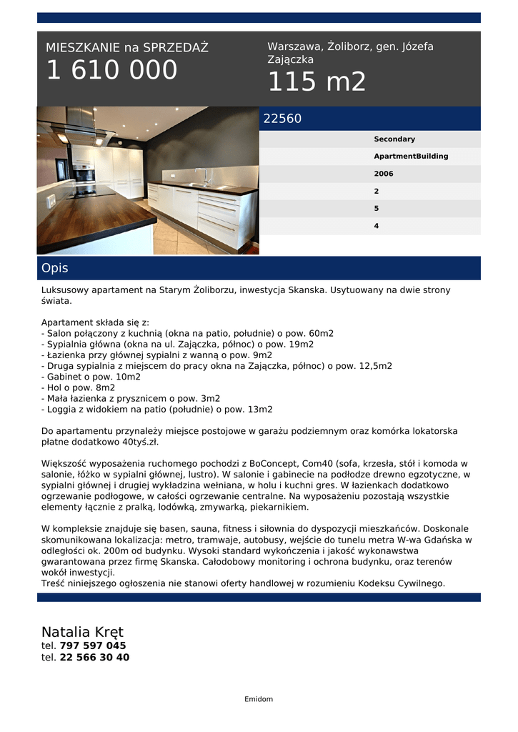 MIESZKANIE na SPRZEDAŻ 1 610 000 Warszawa, Żoliborz, gen. Józefa Zajączka 115 m2 22560 Secondary ApartmentBuilding 2006 2 5 4 Opis Luksusowy apartament na Starym Żoliborzu, inwestycja Skanska. Usytuowany na dwie strony świata. Apartament składa się z: - Salon połączony z kuchnią (okna na patio, południe) o pow. 60m2 - Sypialnia główna (okna na ul. Zajączka, północ) o pow. 19m2 - Łazienka przy głównej sypialni z wanną o pow. 9m2 - Druga sypialnia z miejscem do pracy okna na Zajączka, północ) o pow. 12,5m2 - Gabinet o pow. 10m2 - Hol o pow. 8m2 - Mała łazienka z prysznicem o pow. 3m2 - Loggia z widokiem na patio (południe) o pow. 13m2 Do apartamentu przynależy miejsce postojowe w garażu podziemnym oraz komórka lokatorska płatne dodatkowo 40tyś.zł. Większość wyposażenia ruchomego pochodzi z BoConcept, Com40 (sofa, krzesła, stół i komoda w salonie, łóżko w sypialni głównej, lustro). W salonie i gabinecie na podłodze drewno egzotyczne, w sypialni głównej i drugiej wykładzina wełniana, w holu i kuchni gres. W łazienkach dodatkowo ogrzewanie podłogowe, w całości ogrzewanie centralne. Na wyposażeniu pozostają wszystkie elementy łącznie z pralką, lodówką, zmywarką, piekarnikiem. W kompleksie znajduje się basen, sauna, fitness i siłownia do dyspozycji mieszkańców. Doskonale skomunikowana lokalizacja: metro, tramwaje, autobusy, wejście do tunelu metra W-wa Gdańska w odległości ok. 200m od budynku. Wysoki standard wykończenia i jakość wykonawstwa gwarantowana przez firmę Skanska. Całodobowy monitoring i ochrona budynku, oraz terenów wokół inwestycji. Treść niniejszego ogłoszenia nie stanowi oferty handlowej w rozumieniu Kodeksu Cywilnego. Natalia Kręt tel. 797 597 045 tel. 22 566 30 40 Emidom email: [email protected] Emidom Powered by TCPDF (www.tcpdf.org)