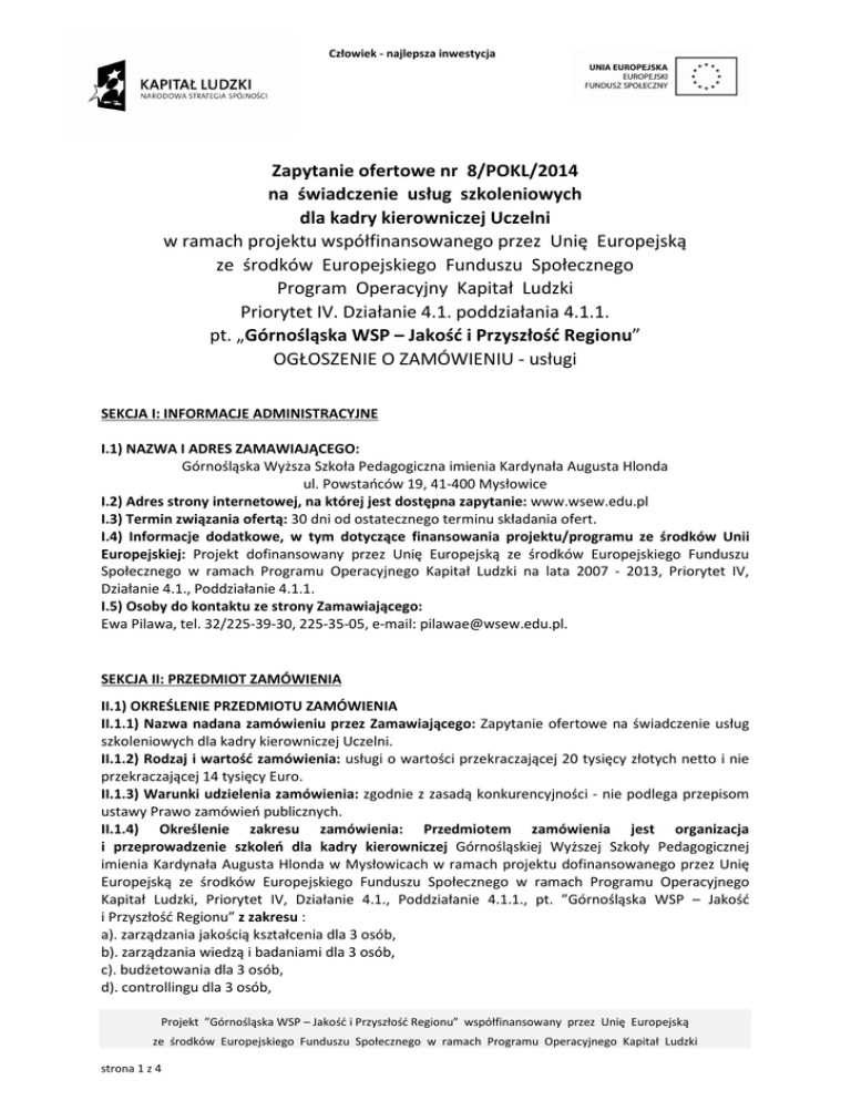 Człowiek - najlepsza inwestycja Zapytanie ofertowe nr 8/POKL/2014 na świadczenie usług szkoleniowych dla kadry kierowniczej Uczelni w ramach projektu współfinansowanego przez Unię Europejską ze środków Europejskiego Funduszu Społecznego Program Operacyjny Kapitał Ludzki Priorytet IV. Działanie 4.1. poddziałania 4.1.1. pt. „Górnośląska WSP – Jakość i Przyszłość Regionu” OGŁOSZENIE O ZAMÓWIENIU - usługi SEKCJA I: INFORMACJE ADMINISTRACYJNE I.1) NAZWA I ADRES ZAMAWIAJĄCEGO: Górnośląska Wyższa Szkoła Pedagogiczna imienia Kardynała Augusta Hlonda ul. Powstańców 19, 41-400 Mysłowice I.2) Adres strony internetowej, na której jest dostępna zapytanie: www.wsew.edu.pl I.3) Termin związania ofertą: 30 dni od ostatecznego terminu składania ofert. I.4) Informacje dodatkowe, w tym dotyczące finansowania projektu/programu ze środków Unii Europejskiej: Projekt dofinansowany przez Unię Europejską ze środków Europejskiego Funduszu Społecznego w ramach Programu Operacyjnego Kapitał Ludzki na lata 2007 - 2013, Priorytet IV, Działanie 4.1., Poddziałanie 4.1.1. I.5) Osoby do kontaktu ze strony Zamawiającego: Ewa Pilawa, tel. 32/225-39-30, 225-35-05, e-mail: [email protected]. SEKCJA II: PRZEDMIOT ZAMÓWIENIA II.1) OKREŚLENIE PRZEDMIOTU ZAMÓWIENIA II.1.1) Nazwa nadana zamówieniu przez Zamawiającego: Zapytanie ofertowe na świadczenie usług szkoleniowych dla kadry kierowniczej Uczelni. II.1.2) Rodzaj i wartość zamówienia: usługi o wartości przekraczającej 20 tysięcy złotych netto i nie przekraczającej 14 tysięcy Euro. II.1.3) Warunki udzielenia zamówienia: zgodnie z zasadą konkurencyjności - nie podlega przepisom ustawy Prawo zamówień publicznych. II.1.4) Określenie zakresu zamówienia: Przedmiotem zamówienia jest organizacja i przeprowadzenie szkoleń dla kadry kierowniczej Górnośląskiej Wyższej Szkoły Pedagogicznej imienia Kardynała Augusta Hlonda w Mysłowicach w ramach projektu dofinansowanego przez Unię Europejską ze środków Europejskiego Funduszu Społecznego w ramach Programu Operacyjnego Kapitał Ludzki, Priorytet IV, Działanie 4.1., Poddziałanie 4.1.1., pt. ”Górnośląska WSP – Jakość i Przyszłość Regionu” z zakresu : a). zarządzania jakością kształcenia dla 3 osób, b). zarządzania wiedzą i badaniami dla 3 osób, c). budżetowania dla 3 osób, d). controllingu dla 3 osób, Projekt ”Górnośląska WSP – Jakość i Przyszłość Regionu” współfinansowany przez Unię Europejską ze środków Europejskiego Funduszu Społecznego w ramach Programu Operacyjnego Kapitał Ludzki strona 1 z 4 Człowiek - najlepsza inwestycja e). „Główny księgowy” dla 1 osoby, f). księgowości i rachunkowości dla 3 osób, g). „Analityk finansowy” dla 1 osoby. Miejsce realizacji zamówienia: województwo śląskie. Szkolenia mogą być realizowane w siedzibie Zamawiającego. Wykonawca zapewni uczestnikom w przypadku organizacji szkolenia w odległości powyżej 50 km od siedziby Zamawiającego nocleg ze śniadaniem. Szczegółowe informacje dot. szkolenia: Wykonawca zapewni: 1. Obsadę trenerską. 2. Salę szkoleniową z zapleczem technicznym (projektor multimedialny, ekran, dostęp do komputera, flipchat). 3. Materiały szkoleniowe dla każdego uczestnika oraz jedna dodatkowa kopia do akt Zamawiającego. 4. Notatnik, długopis dla każdego uczestnika. 5. W każdym dniu szkolenia: − przerwy kawowe (kawa, herbata, z dodatkami tj. mleko, cytryna, cukier, kruche ciasteczka, sok, woda), − lunch. Termin realizacji szkoleń: marzec – sierpień 2014 r. Szkolenie musi zakończyć się wydaniem odpowiednich certyfikatów /zaświadczeń. Certyfikaty, zaświadczenia oraz materiały szkoleniowe muszą posiadać oznakowanie zgodne z wytycznymi dotyczącymi oznaczania projektów w Ramach Programu Operacyjnego Kapitał Ludzki, przedstawionymi na stronie internetowej : http://www.ncbir.pl/gfx/ncbir/userfiles/_public/fundusze_europejskie/monika/wytyczne_04_02.pdf II.1.5) Czy przewiduje się udzielenie zaliczki: nie. II.1.6) Czy przewiduje się udzielenie zamówień uzupełniających: nie. II.1.7) Wspólny Słownik Zamówień (CPV): 80500000-9 usługi szkoleniowe. II.2) CZAS TRWANIA ZAMÓWIENIA LUB TERMIN WYKONANIA: marzec – sierpień 2014 roku. II.3) ZASADY SKŁADANIA OFERT II.3.1) Czy dopuszcza się złożenie oferty częściowej: tak. II.3.2) Czy dopuszcza się złożenie oferty wariantowej: tak. II.3.3) Na ofertę składają się następujące dokumenty: 1. Specyfikacja cenowa, której wzór stanowi Załącznik nr 1 do niniejszego Zapytania ofertowego. 2. Kserokopie odpowiednich dokumentów rejestrowych oferenta (np. wypis z KRS, wypis z ewidencji działalności gospodarczej, w przypadku spółki cywilnej również umowa spółki, REGON, NIP) wystawionych nie wcześniej niż 6 miesięcy przed terminem składania ofert. 3. Formularz oświadczeń, którego wzór stanowi Załącznik nr 2 do niniejszego Zapytania ofertowego. 4. Wykaz usług szkoleniowych zrealizowanych w ciągu ostatnich 2 lat, w tym na rzecz uczelni wyższych, którego wzór stanowi Załącznik nr 3 wraz z minimum 3 referencjami potwierdzającymi należyte wykonanie usług. Projekt ”Górnośląska WSP – Jakość i Przyszłość Regionu” współfinansowany przez Unię Europejską ze środków Europejskiego Funduszu Społecznego w ramach Programu Operacyjnego Kapitał Ludzki strona 2 z 4 Człowiek - najlepsza inwestycja 5. Program i harmonogram szkoleń dla poszczególnych zakresów. Zamawiający zastrzega sobie możliwość negocjowania harmonogramu szkoleń w przypadku pokrywania się terminów szkoleń z zakresu opisanego w punktach II.1.4. a). i b). lub w punktach II.1.4. od c). do g). II.3.4) Strony oferty (w rozumieniu wszystkich dokumentów składanych przez oferenta) powinny być podpisane w wyznaczanych miejscach i parafowane na stronach, na których nie widnieje podpis osoby upoważnionej do reprezentacji. II.3.5) Dokumenty skład