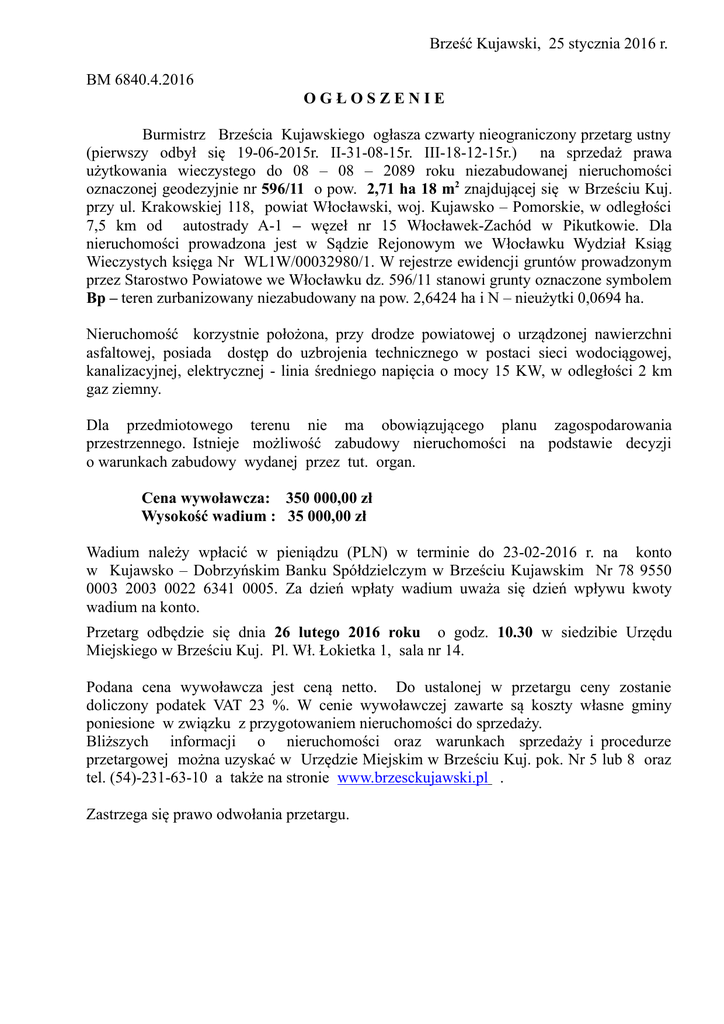 Brześć Kujawski, 25 stycznia 2016 r. BM 6840.4.2016 OGŁOSZENIE Burmistrz Brześcia Kujawskiego ogłasza czwarty nieograniczony przetarg ustny (pierwszy odbył się 19-06-2015r. II-31-08-15r. III-18-12-15r.) na sprzedaż prawa użytkowania wieczystego do 08 – 08 – 2089 roku niezabudowanej nieruchomości oznaczonej geodezyjnie nr 596/11 o pow. 2,71 ha 18 m2 znajdującej się w Brześciu Kuj. przy ul. Krakowskiej 118, powiat Włocławski, woj. Kujawsko – Pomorskie, w odległości 7,5 km od autostrady A-1 – węzeł nr 15 Włocławek-Zachód w Pikutkowie. Dla nieruchomości prowadzona jest w Sądzie Rejonowym we Włocławku Wydział Ksiąg Wieczystych księga Nr WL1W/00032980/1. W rejestrze ewidencji gruntów prowadzonym przez Starostwo Powiatowe we Włocławku dz. 596/11 stanowi grunty oznaczone symbolem Bp – teren zurbanizowany niezabudowany na pow. 2,6424 ha i N – nieużytki 0,0694 ha. Nieruchomość korzystnie położona, przy drodze powiatowej o urządzonej nawierzchni asfaltowej, posiada dostęp do uzbrojenia technicznego w postaci sieci wodociągowej, kanalizacyjnej, elektrycznej - linia średniego napięcia o mocy 15 KW, w odległości 2 km gaz ziemny. Dla przedmiotowego terenu nie ma obowiązującego planu zagospodarowania przestrzennego. Istnieje możliwość zabudowy nieruchomości na podstawie decyzji o warunkach zabudowy wydanej przez tut. organ. Cena wywoławcza: 350 000,00 zł Wysokość wadium : 35 000,00 zł Wadium należy wpłacić w pieniądzu (PLN) w terminie do 23-02-2016 r. na konto w Kujawsko – Dobrzyńskim Banku Spółdzielczym w Brześciu Kujawskim Nr 78 9550 0003 2003 0022 6341 0005. Za dzień wpłaty wadium uważa się dzień wpływu kwoty wadium na konto. Przetarg odbędzie się dnia 26 lutego 2016 roku o godz. 10.30 w siedzibie Urzędu Miejskiego w Brześciu Kuj. Pl. Wł. Łokietka 1, sala nr 14. Podana cena wywoławcza jest ceną netto. Do ustalonej w przetargu ceny zostanie doliczony podatek VAT 23 %. W cenie wywoławczej zawarte są koszty własne gminy poniesione w związku z przygotowaniem nieruchomości do sprzedaży. Bliższych informacji o nieruchomości oraz warunkach sprzedaży i procedurze przetargowej można uzyskać w Urzędzie Miejskim w Brześciu Kuj. pok. Nr 5 lub 8 oraz tel. (54)-231-63-10 a także na stronie www.brzesckujawski.pl . Zastrzega się prawo odwołania przetargu. REGULAMIN PRZETARGU USTNEGO NIEOGRANICZONEGO NA SPRZEDAŻ NIERUCHOMOŚCI NIEZABUDOWANEJ ZNAJDUJĄCEJ SIĘ W BRZEŚCIU KUJ. PRZY ul. KRAKOWSKIEJ 118 1. Przetarg odbywa się w formie ustnej. 2. W przetargu mogą brać udział osoby, które wpłacą w terminie do dnia 23-02-2016 r. wadium w pieniądzu (PLN) w wysokości 35 000,00 zł na konto w Kujawsko – Dobrzyńskim Banku Spółdzielczym w Brześciu Kujawskim Nr 78 9550 0003 2003 0022 6341 0005. Dowód wpłaty wadium winien wskazywać jednoznacznie, kto wpłacił wadium i tym samym uprawniony jest do udziału w przetargu (np. małżonkowie). Za dzień wpłaty wadium uważa się dzień wpływu kwoty wadium na konto. Dowód wniesienia wadium podlega przedłożeniu komisji przetargowej przed otwarciem przetargu. 3. Uczestnicy biorą udział w przetargu osobiście lub przez pełnomocnika. Pełnomocnictwo wymaga formy pisemnej. Małżonkowie biorą udział w przetargu osobiście lub okazując pełnomocnictwo współmałżonka. 4. Postąpienie nie może wynosić mniej niż 1 % ceny wywoławczej z zaokrągleniem w górę do pełnych dziesiątek złotych tj. 3500,00 zł. 5. Przetarg wygrywa osoba, której zaoferowana cena po trzykrotnym wywołaniu nie została przebita. Do ustalonej w przetargu ceny zostanie doliczony podatek VAT 23 %. 6. Wadium wpłacone przez uczestnika, który wygrał przetarg zalicza się na poczet ceny nabycia nieruchomości, natomiast pozostałym uczestnikom zwraca się niezwłocznie po zakończeniu przetargu, jednak nie później niż przed upływem 3 dni od dnia zamknięcia lub odwołania przetargu. 7. Wadium ulega przepadkowi w razie uchylenia się uczestnika, który wygrał przetarg od zawarcia umowy. 8. Nabywca, za działkę nr 596/11 będzie zobowiązany wnosić opłatę roczną na konto Starostwa Powiatowego we Włocławku (opłata za rok 2015 w wysokości 5 507,62 zł). Opłatę roczną wnosi się przez cały okres użytkowania wieczystego w terminie do 31 marca każdego roku, z góry za dany rok. Wysokość opłaty rocznej z tytułu użytkowania wieczystego nieruchomości może być aktualizowana nie częściej niż raz w roku. 9. Termin uiszczenia ceny sprzedaży pomniejszonej o wpłacone wadium upływa w ciągu 21 dni od dnia przeprowadzonego przetargu na konto w Kujawsko– Dobrzyńskim Banku Spółdzielczym w Brześciu Kujawskim Nr 62 9550 0003 2003 0022 6341 0002. 10. Nieruchomość zbywana jest wg. danych ewidencyjnych i w razie potrzeby wznowienia granic obowiązek ten spoczywa na nabywcy 11. Nabywca wyznacza Kancelarię Notarialną oraz ponosi koszty Aktu Notarialnego. 12. Zastrzega się prawo odwołania przetargu. Zatwierdził Burmistrz Brześcia Kujawskiego