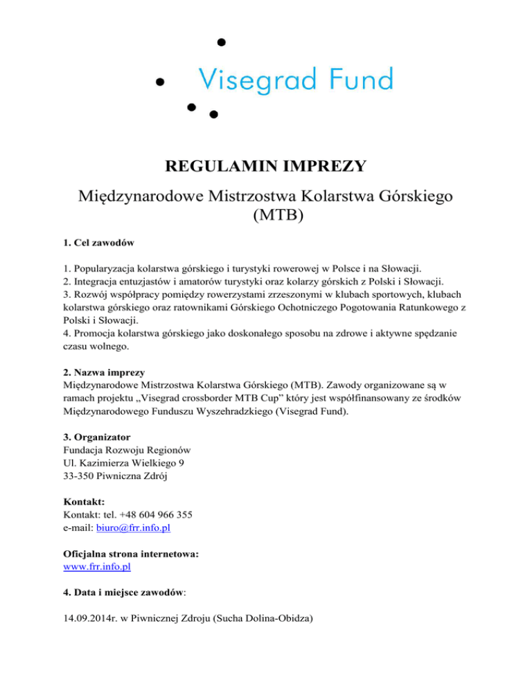 REGULAMIN IMPREZY Międzynarodowe Mistrzostwa Kolarstwa Górskiego (MTB) 1. Cel zawodów 1. Popularyzacja kolarstwa górskiego i turystyki rowerowej w Polsce i na Słowacji. 2. Integracja entuzjastów i amatorów turystyki oraz kolarzy górskich z Polski i Słowacji. 3. Rozwój współpracy pomiędzy rowerzystami zrzeszonymi w klubach sportowych, klubach kolarstwa górskiego oraz ratownikami Górskiego Ochotniczego Pogotowania Ratunkowego z Polski i Słowacji. 4. Promocja kolarstwa górskiego jako doskonałego sposobu na zdrowe i aktywne spędzanie czasu wolnego. 2. Nazwa imprezy Międzynarodowe Mistrzostwa Kolarstwa Górskiego (MTB). Zawody organizowane są w ramach projektu „Visegrad crossborder MTB Cup” który jest współfinansowany ze środków Międzynarodowego Funduszu Wyszehradzkiego (Visegrad Fund). 3. Organizator Fundacja Rozwoju Regionów Ul. Kazimierza Wielkiego 9 33-350 Piwniczna Zdrój Kontakt: Kontakt: tel. +48 604 966 355 e-mail: [email protected] Oficjalna strona internetowa: www.frr.info.pl 4. Data i miejsce zawodów: 14.09.2014r. w Piwnicznej Zdroju (Sucha Dolina-Obidza) 5. Warunki uczestnictwa W zawodach mogą wziąć udział wszyscy entuzjaści i amatorzy turystyki, kolarze górscy zrzeszeni w klubach sportowych i klubach kolarstwa górskiego oraz ratownicy Górskiego Ochotniczego Pogotowia Ratunkowego z Polski i Słowacji. Formalnym warunkiem udziału w zawodach jest wcześniejsza rejestracja za pomocą formularza dostępnego pod adresem: www.frr.info.pl lub pod numerem telefonu +48 604 966 355 najpóźniej do dnia 12.09.2014r. Osoby zgłaszające chęć udziału w zawodach akceptują warunki niniejszego regulaminu oraz poniższą klauzulę: Organizator, wszystkie osoby z nim współpracujące, a także osoby związane z przeprowadzeniem i organizacją zawodów nie ponoszą odpowiedzialności względem uczestników za szkody osobowe, rzeczowe i majątkowe, które wystąpią przed, w trakcie lub po zawodach. Uczestnicy startują na własną odpowiedzialność. Uczestnicy ponoszą odpowiedzialność cywilną i prawną za wszystkie szkody. Przez akceptację niniejszego regulaminu uczestnicy zrzekają się prawa dochodzenia prawnego lub zwrotnego od organizatora lub jego zleceniobiorców w razie wypadku lub szkody związanej z zawodami. Przyjmuję do wiadomości, że w razie wypadku nie mogę wnosić żadnych roszczeń w stosunku do organizatora. Przyjmuję do wiadomości, że należy przestrzegać zarządzeń służb porządkowych oraz warunków regulaminu. Zgadzam się z warunkami uczestnictwa i zgłaszam swoje uczestnictwo w ww. zawodach. 6. Opłaty startowe Udział w zawodach jest bezpłatny. 7. Program zawodów 11.30 – 12.00 – Wydanie numerów startowych (Sucha Dolina, Obidza) 12.00 – Start MTB Cup 14.00 – uroczyste zakończenie MTB Cup – wręczenie dyplomów, medali oraz nagród 15.00 – ognisko integracyjne 8. Dystans 15 kilometrów 9. Opis imprezy Międzynarodowe Mistrzostwa Kolarstwa Górskiego (MTB) przeprowadzone zostaną na trasie Obidza - Litmanova - Przełęcz Rozdziele - Obidza - pętla biegowa - Obidza. Każdy z uczestników otrzyma mapę trasy. Start odbędzie się ze startu wspólnego. Trasa będzie oznakowana, na stałe zabezpieczona przez sędziów i ratowników GOPR. Zawodnicy podczas wyścigu zobowiązani są do przestrzegania niniejszego regulaminu oraz odnoszenia się z należytym szacunkiem do innych uczestników zawodów, sędziów, organizatorów, służb porządkowych oraz medycznych na trasie zawodów. Zawodnicy zobowiązani są do zachowania kultury osobistej (w szczególności do nie używania wulgaryzmów), przestrzegania zasad fair play, poszanowania środowiska naturalnego. 10. Rezygnacja z udziału w zawodach Zawodnicy rezygnujący z udziału w zawodach niezależnie od przyczyny wycofania się, zobowiązani są do niezwłocznego poinformowania o tym fakcie organizatora dzwoniąc pod numer telefonu +48 604 966 355. 11. Świadczenia dla zawodników W ramach zawodów uczestnicy otrzymają: » oznakowaną trasę Międzynarodowych Mistrzostw Kolarstwa Górskiego (MTB) » pomiar czasu » zabezpieczenie medyczne przez GOPR » numer startowy i mapka trasy » prawo do korzystania z bufetu na starcie (napój izotoniczny, woda, baton, banan) » posiłek regeneracyjny po zawodach w postaci dań z grilla oraz napojów » nagrody symboliczne dla każdego uczestnika oraz dyplomy » puchary i nagrody główne dla zwycięzców 12. Kategorie nagród głównych -Kategoria najlepsi mężczyźni 1 miejsce 2 miejsce 3 miejsce -Kategoria najlepsze kobiety 1 miejsce 2 miejsce 3 miejsce -Kategoria dzieci i młodzież 1 miejsce 2 miejsce 3 miejsce 13. Kary Komisja Sędziowska w porozumieniu z Organizatorem może zasądzić następujące kary: » Upomnienie. » Kara Czasowa » Dyskwalifikacja. 14. Protesty Protesty do Sędziego Głównego zawodów można składać w formie pisemnej w czasie trwania zawodów. Decyzja ostateczna należy do Sędziego Głównego. 15. Informacje dodatkowe Organizator nie ponosi odpowiedzialności za wypadki losowe zaistniałe podczas dojazdu uczestników na zawody i powrotu z nich. Każdy uczestnik bierze udział w zawodach na własną odpowiedzialność. Organizator nie ponosi odpowiedzialności materialnej za rzeczy zaginione w trakcie trwania zawodów. Organizator nie ponosi odpowiedzialności za ewentualne kolizje i wypadki na trasie. Brak znajomości regulaminu nie będzie uznawany jako wytłumaczenie. Osoby bez numerów startowych poruszające się na rowerach po trasie zawodów będą usuwane z trasy przez obsługę techniczną. Na trasie zawodów występują strome podjazdy i niebezpieczne zjazdy. Organizator zastrzega sobie prawo do odwołania imprezy w związku z wystąpieniem klęsk żywiołowych lub innych uznawanych za działanie "siły wyższej". Organizator z Sędzią Głównym, zastrzega sobie prawo do interpretacji niniejszego regulaminu oraz do jego zmian. Prezes Zarządu Fundacja Rozwoju Regionów