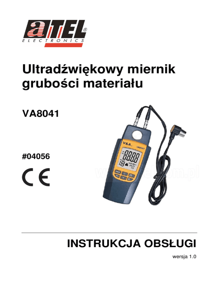 Ultradźwiękowy miernik grubości materiału VA8041 #04056 INSTRUKCJA OBSŁUGI wersja 1.0 VA8041 SPIS TREŚCI Wstęp .................................................................................................. 3 Bezpieczeństwo uŜytkowania ............................................................. 3 1. Zawartość opakowania ................................................................... 3 2. Zasady bezpieczeństwa ................................................................... 3 3. Środowisko pracy ........................................................................... 4 4. Budowa urządzenia ......................................................................... 4 4.1. Opis urządzenia........................................................................ 4 4.2. Zasilanie ................................................................................... 4 4.3 Tabela zaprogramowanych materiałów .................................... 5 4.4 Programowanie własnych wartości........................................... 5 5. Wykonywanie pomiarów ................................................................ 5 6. Kalibracja ........................................................................................ 6 7. Bezpieczna wymiana i usuwanie baterii ......................................... 6 8. Składowanie zuŜytego sprzętu ........................................................ 7 9. Specyfikacja techniczna .................................................................. 8 2 VA8041 Wstęp Korzystając z miernika VA8041 moŜna w łatwy sposób zmierzyć grubość między innymi metalowych, szklanych, plastikowych elementów, np. ścianek zbiorników, rur. Szczególnie przydatny przy pomiarach grubości elementów podatnych na korozję. Bezpieczeństwo uŜytkowania Przed uruchomieniem przyrządu lub wykonaniem pomiaru naleŜy zapoznać się dokładnie z instrukcją obsługi. Urządzenie zostało poddane obowiązkowej ocenie zgodności, spełnia zasadnicze wymagania zawarte w europejskich Dyrektywach Nowego Podejścia i posiada oznakowanie CE. 1. Zawartość opakowania - miernik VA8041 - etui, - tubka z Ŝelem, - angielska wersja instrukcji obsługi, - niniejsza wersja instrukcji obsługi. Podczas dostawy naleŜy upewnić się, Ŝe opakowanie nie jest uszkodzone. W przypadku stwierdzonych uszkodzeń naleŜy niezwłocznie skontaktować się z dostawcą. Prosimy równieŜ o sprawdzenie zgodności zawartości opakowania z powyŜej zamieszczoną listą. 2. Zasady bezpieczeństwa Urządzenie zostało zaprojektowane i wyprodukowane z najwyŜsza starannością o bezpieczeństwo osób instalujących i uŜytkujących. Dla zapewnienia bezpieczeństwa pracy, naleŜy stosować się do wszelkich wskazań zawartych w tej instrukcji. Urządzenie jest zgodne z przepisami w zakresie bezpieczeństwa uŜytkowania urządzeń elektrycznych. W celu zapewnienia podstawowych wymogów bezpieczeństwa obsługi przyrządu naleŜy stosować się do poniŜszych zasad: − Przyrząd naleŜy zabezpieczyć przed dostępem dzieci i osób niepowołanych. − JeŜeli przyrząd zostanie przeniesiony z miejsca o niŜszej temperaturze do miejsca o wyŜszej temperaturze, wówczas wewnątrz przyrządu moŜe się skroplić para wodna uniemoŜliwiając jego prawidłowe funkcjonowanie i dlatego naleŜy odczekać, aŜ wilgoć odparuje. − Przed przystąpieniem do konserwacji przyrządu i montaŜu elementów wymienialnych przyrządu takich jak: baterie, bezpieczniki i inne, naleŜy bezwzględnie odłączyć od przyrządu wszystkie przewody łączące z innymi urządzeniami. − Zabrania się uŜywania przyrządu w obszarach duŜej wilgotności, zasolenia, działania oparów toksycznych, łatwopalnych lub Ŝrących. − Nie uŜywać przyrządu przy widocznych uszkodzeniach lub, gdy przewody są uszkodzone lub zuŜyte. Przewody pomiarowe naleŜy wymienić na nowe o takich samych parametrach przekroju i izolacji, a przyrząd naleŜy oddać do autoryzowanego serwisu. − Jeśli wartość pomiaru jest nieznana, pomiar naleŜy rozpocząć od największego zakresu pomiarowego. Symbole i oznaczenia związane z bezpieczeństwem uŜytkowania znajdujące się na obudowie urządzenia: 3 VA8041 OSTRZEśENIE: Przed uruchomieniem przyrządu lub wykonaniem pomiaru naleŜy zapoznać się dokładnie z instrukcją obsługi. Nie zastosowanie się do tego polecenia moŜe spowodować uszkodzenie lub zniszczenie urządzenia. Zgodność z dyrektywami Unii Europejskiej. Podwójna izolacja (II klasa bezpieczeństwa). Uziemienie 3. Środowisko pracy Miernik nie jest urządzeniem wodoszczelnym. UŜywanie go w pomieszczeniach o duŜej wilgotności powietrza lub zanurzenie w cieczy moŜe spowodować jego uszkodzenie. Dokonanie przez uŜytkownika jakichkolwiek własnych zmian w urządzeniu moŜe spowodować utratę moŜliwości jego legalnego uŜytkowania. 4. Budowa urządzenia 4.1. Opis urządzenia 1) sonda pomiarowa 2) płytka kalibracyjna 3) wyświetlacz LCD 4) przyciski funkcyjne 4.2. Zasilanie Miernik zasilany jest trzema bateriami 1,5V AAA. W trakcie wymiany baterii urządzenie powinno być wyłączone. 4 VA8041 4.3 Tabela zaprogramowanych materiałów Zaprogramowany numer 1 2 3 4 5 6 7 8 9 10 11 12 13-17 Rodzaj materiału śelazo, stal Aluminium Miedź Mosiądz Złoto Srebro Cynk Cyna Szkło Plastik Ceramika Woda (20˚C) Materiały zdefiniowane przez uŜytkownika. Prędkość rozchodzenia się fali w ośrodku (m/s) 5900 6320 4700 4430 3240 3600 4170 3320 5850 2250 5580 1480 1000-9999 4.4 Programowanie własnych wartości Istnieje moŜliwość zaprogramowania 5 własnych prędkości rozchodzenia się fali dźwiękowej w danych ośrodkach. W tym celu naleŜy przyciskiem „Select” wybrać jeden z materiałów oznaczonych numerami 13-17, po czym wciskając przyciski „▲”, „▼” ustawić poŜądaną wartość. JeŜeli prędkość rozchodzenia się fali w badanym ośrodku nie jest znana moŜna ją w łatwy sposób us