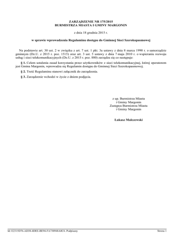 ZARZĄDZENIE NR 175/2015 BURMISTRZA MIASTA I GMINY MARGONIN z dnia 18 grudnia 2015 r. w sprawie wprowadzenia Regulaminu dostępu do Gminnej Sieci Szerokopasmowej Na podstawie art. 30 ust. 2 w związku z art. 7 ust. 1 pkt. 3a ustawy z dnia 8 marca 1990 r. o samorządzie gminnym (Dz.U. z 2015 r. poz. 1515) oraz art. 3 ust. 5 ustawy z dnia 7 maja 2010 r. o wspieraniu rozwoju usług i sieci telekomunikacyjnych (Dz.U. z 2015 r. poz. 880) zarządza się co następuje: § 1. Celem ustalenia zasad korzystania przez użytkowników z sieci telekomunikacyjnej, której operatorem jest Gmina Margonin, wprowadza się Regulamin dostępu do Gminnej Sieci Szerokopasmowej. § 2. Treść Regulaminu stanowi załącznik do zarządzenia. § 3. Zarządzenie wchodzi w życie z dniem podjęcia. z up. Burmistrza Miasta i Gminy Margonin Zastępca Burmistrza Miasta i Gminy Margonin Łukasz Malczewski Id: E2315D76-AD38-4DEE-BE94-FA730948A0C6. Podpisany Strona 1 Załącznik do Zarządzenia Nr 175/2015 Burmistrza Miasta i Gminy Margonin z dnia 18 grudnia 2015 r. Regulamin dostępu do Gminnej Sieci Szerokopasmowej 1. Dostęp do Gminnej Sieci Szerokopasmowej jest realizowany z wykorzystaniem infrastruktury sieciowej wybudowanej w ramach projektu pn. „Przeciwdziałanie wykluczeniu cyfrowemu w Gminie Margonin”, zwanego dalej Projektem. 2. Dostęp do Gminnej Sieci Szerokopasmowej nie ma charakteru komercyjnego. 3. Operatorem Gminnej Sieci Szerokopasmowej jest Gmina Margonin, ul. Kościuszki 13, 64-830 Margonin. 4. Z dostępu do Gminnej Sieci Szerokopasmowej mogą korzystać beneficjenci ostateczni Projektu oraz wybrane jednostki podległe Gminie Margonin biorące udział w Projekcie. 5. Do podłączenia urządzeń do sieci bezprzewodowej wymagane jest posiadanie urządzeń radiowych WiFi, pracujących w paśmie uwolnionym 5GHz, których szczegółowe parametry określa projekt sieci bezprzewodowej. 6. Do podłączenia urządzeń do sieci światłowodowej wymagane jest posiadanie odpowiedniego urządzenia nadawczo-odbiorczego oraz doprowadzenie do budynku właściwej liczby włókien światłowodowych. Szczegółowe parametry urządzeń określa projekt sieci światłowodowej. 7. Prędkości maksymalne przesyłania danych w Gminnej Sieci Szerokopasmowej wynoszą: a) pobieranie do 2,5 Mbit/s, wysyłanie do 0,5 Mbit/s – w sieci bezprzewodowej dla beneficjentów ostatecznych Projektu, b) pobieranie do 10 Mbit/s, wysyłanie do 10 Mbit/s – w sieci bezprzewodowej dla jednostek podległych gminie Margonin, c) pobieranie do 10 Mbit/s, wysyłanie do 10 Mbit/s – w sieci światłowodowej dla jednostek podległych gminie Margonin. 8. Rzeczywista prędkość przesyłania danych zależy od szeregu czynników takich jak m.in. obciążenie stacji bazowej, rodzaj technologii wspieranej przez urządzenie końcowe, siły odbieranego sygnału, ukształtowania terenu oraz warunków atmosferycznych. 9. Operator nie prowadzi bezpośredniego wsparcia dla użytkowników sieci w zakresie konfiguracji sprzętu, jak również nie ponosi odpowiedzialności za kompatybilność urządzeń użytkownika z infrastrukturą Gminnej Sieci Szerokopasmowej. 10. Ruch w Gminnej Sieci Szerokopasmowej jest na bieżąco monitorowany i archiwizowany, zgodnie z obowiązującymi przepisami prawa. 11. Użytkownik ponosi pełną odpowiedzialność za wszelkie w szczególności naruszenia prawa i związane z tym konsekwencje. działania podejmowane w sieci, 12. Ze względów bezpieczeństwa nie jest gwarantowana dostępność do wszystkich usług sieciowych. 13. Użytkownik z chwilą uzyskania dostępu do Gminnej Sieci Szerokopasmowej zobowiązuje się do: a) korzystania z sieci wyłącznie zgodnie z aktualnie obowiązującymi przepisami prawa oraz treścią niniejszego Regulaminu, b) nie wykorzystywania sieci do działań niezgodnych z prawem, c) nie przesyłania i nie udostępniania treści, które są niezgodne z prawem lub są przedmiotem ochrony własności intelektualnej nie należącym do użytkownika, w szczególności za pośrednictwem sieci typy P2P, Id: E2315D76-AD38-4DEE-BE94-FA730948A0C6. Podpisany Strona 1 d) nie przesyłania i nie udostępniania treści mogących naruszyć czyjekolwiek dobra osobiste, e) nie wykorzystywania dostępu do sieci w celu masowego rozsyłania nie zamówionych przez odbiorców treści o charakterze reklamowym (tzw. SPAM), f) nie wykonywania działań zagrażających bezpieczeństwu sieci, w szczególności: - prób uzyskiwania dostępu do wszelkich zasobów sieciowych, do których użytkownik nie jest uprawniony, - prób destabilizacji działania sieci lub usług sieciowych, - rozpowszechniania wirusów komputerowych i innych programów mogących uszkodzić komputery innych użytkowników Internetu. 14. Użytkownik może zostać czasowo lub na stałe odłączony od Gminnej Sieci Szerokopasmowej za nieprzestrzeganie niniejszego Regulaminu, działania niezgodne z prawem lub zagrażające bezpieczeństwu sieci. W przypadku stwierdzenia takich działań z użytkownikiem może zostać rozwiązana umowa uczestnictwa w projekcie oraz użyczenia sprzętu komputerowego. W szczególności zabronione jest: a) usiłowanie uzyskania dostępu do wszelkich zasobów sieciowych, do których użytkownik nie jest uprawniony, b) próby ominięcia zabezpieczeń stosowanych w Gminnej Sieci Szerokopasmowej (tj. zmiana adresu IP nadanego przez operatora, stosowanie tuneli, proxy itp.), c) udostępnianie oraz pobieranie z sieci materiałów chronionych prawami autorskimi (oprogramowanie, filmy, muzyka itp.), pornograficznych i innych, niezgodnych z powszechnie obowiązującymi przepisami prawa, d) udostępnianie osobom trzecim sygnału umożliwiającego dostęp do Gminnej Sieci Szerokopasmowej, w szczególności poprzez stosowanie repeaterów, routerów i innych urządzeń, e) wszelkie inne, niezgodne z prawem działania użytkownika, które mogą zostać uznane za niebezpieczne dla funkcjonowania sieci i bezpieczeństwa innych użytkowników. 15.