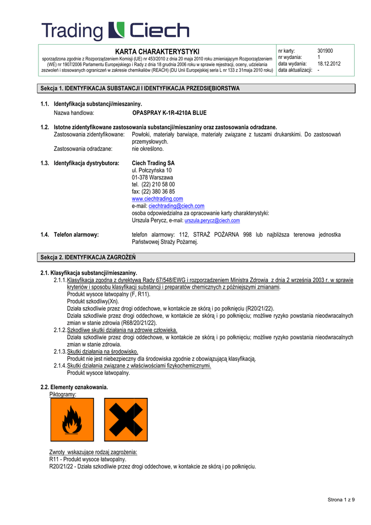 KARTA CHARAKTERYSTYKI sporządzona zgodnie z Rozporządzeniem Komisji (UE) nr 453/2010 z dnia 20 maja 2010 roku zmieniającym Rozporządzeniem (WE) nr 1907/2006 Parlamentu Europejskiego i Rady z dnia 18 grudnia 2006 roku w sprawie rejestracji, oceny, udzielania zezwoleń i stosowanych ograniczeń w zakresie chemikaliów (REACH) (DU Unii Europejskiej seria L nr 133 z 31maja 2010 roku) nr karty: nr wydania: data wydania: data aktualizacji: 301900 1 18.12.2012 - Sekcja 1. IDENTYFIKACJA SUBSTANCJI I IDENTYFIKACJA PRZEDSIĘBIORSTWA 1.1. Identyfikacja substancji/mieszaniny /mieszaniny. Nazwa handlowa: OPASPRAY K-1R-4210A BLUE 1.2. Istotne zidentyfikowane zastosowania substancji/mieszaniny substancji oraz zastosowania odradzane. odradzane Zastosowania zidentyfikowane: Powłoki, materiały barwiące, materiały związane z tuszami drukarskimi. drukarskimi Do zastosowań przemysłowych. Zastosowania odradzane: nie określono. określono 1.3. Identyfikacja dystrybutora: Ciech Trading SA ul. Połczyńska 10 01 01-378 Warszawa tel. (22) 210 58 00 fax: (22) 380 36 85 www.ciechtrading.com e e-mail: [email protected] osoba odpowiedzialna odpowiedzialna za opracowanie karty charakterystyki: Urszula Perycz, ee mail: [email protected] 1.4. Telefon alarmowy: telefon alarmowy: 112, STRAŻ POŻARNA 998 lub najbliższa terenowa jednostka Państwowej Straży Pożarnej. Pożarnej Sekcja 2. IDENTYFIKACJA ZAGROŻEŃ 2.1. Klasyfikacja substancji/mieszaniny /mieszaniny. 2.1.1. Klasyfikacja zgodna z dyrektywą Rady 67/548/EWG i rozporządzeniem Ministra Zdrowia z dnia 2 września 2003 r. w sprawie kryteriów i sposobu klasyfikacji substancji i preparatów chemicznych z późniejszymi zmianami. zmianami Produkt wysoce łatwopalny (F, R11). R11) Produkt szkodliwy(Xn). Działa szkodliwie przez drogi oddechowe, w kontakcie kon ze skórą i po połknięciu (R20/21/22 /22). Działa szkodliwie przez drogi oddechowe, w kontakcie ze skórą i po połknięciu; możliwe ryzyko powstania nieodwracalnych nieodwr zmian w stanie ie zdrowia (R68/20/21/22). 2.1.2. Szkodliwe skutki działania na zdrowie człowieka. Działa szkodliwie przez drogi oddechowe, w kontakcie ze skórą i po połknięciu; możliwe ryzyko powstania nieodwracalnych nieodwr zmian w stanie zdrowia. 2.1.3. Skutki działania na środowisko. Produkt nie jest niebezpieczny dla środowiska zgodnie z obowiązującą klasyfikacją. 2.1.4. Skutki działania związane z właściwościami fizykochemicznymi. Produkt wysoce łatwopalny. 2.2. Elementy oznakowania. Piktogramy: Zwroty wskazujące rodzaj zagrożenia: R11 - Produkt wysoce łatwopalny. kon ze skórą i po połknięciu. R20/21/22 - Działa szkodliwie przez drogi oddechowe, w kontakcie Strona 1 z 9 nr karty: nr wydania: data wydania: data aktualizacji: KARTA CHARAKTERYSTYKI OPASPRAY K-1R-4210A BLUE 301900 1 18.12.2012 - R68/20/21/22 - Działa szkodliwie przez drogi oddechowe, w kontakcie ze skórą i po połknięciu; możliwe ryzyko powstania nieodwracalnych zmian w stanie zdrowia. Zwroty wskazujące środki ostrożności: S36/37 - Nosić odpowiednią odzież ochronną i odpowiednie rękawice ochronne. 2.3. Inne zagrożenia. Brak informacji na temat spełnienia kryteriów PBT lub vPvB zgodnie z załącznikiem XIII rozporządzenia REACH. Sekcja 3. SKŁAD / INFORMACJA O SKŁADNIKACH Numery identyfikujące Nazwa Klasyfikacja Zakres stężeń Numer indeksowy: Numer CAS: 8013-52-3 Numer WE: 202-983-3 Numer REACH:- INDUSTRIAL METHYLATED SPIRIT 74 OP F, R11; Xn R20/21/22, R68/20/21/22 50 <= x % < 70 Numer indeksowy: Numer CAS: 13463-67-7 Numer WE: 236-675-5 Numer REACH:- ditlenek tytanu brak klasyfikacji. 30 <= x % < 50 klasyfikacja zgodnie z dyrektywą 67/548/EWG Pełen tekst zwrotów R przytoczony został w sekcji 16 karty. Sekcja 4. ŚRODKI PIERWSZEJ POMOCY 4.1. Opis środków pierwszej pomocy. Wdychanie: Wyprowadzić lub wynieść poszkodowanego z miejsca narażenia, ułożyć w wygodnej pozycji półleżącej lub siedzącej, zapewnić spokój, chronić przed utratą ciepła. Zdjąć zanieczyszczoną odzież. Jeżeli istnieje ryzyko, że w miejscu, w którym znajdują się ratownicy i poszkodowany obecne są w powietrzu pary produktu, należy wyposażyć się w maski pochłaniające lub aparaty oddechowe z niezależnym obiegiem powietrza. W przypadku utraty przytomności ułożyć poszkodowanego w pozycji bocznej ustalonej i wezwać pomoc medyczną. W przypadku zatrzymania oddechu, oddechu przerywanego, nieefektywnego oddychania, należy rozluźnić wszystkie elementy odzieży, które mogą blokować swobodne oddychanie i należy rozpocząć resuscytację oraz natychmiast wezwać pomoc medyczną. Należy przebywać w dobrze wentylowanym pomieszczeniu. W przypadku wystąpienia lub utrzymywania się niepokojących objawów należy zasięgnąć pomocy lekarza. W przypadku wdychania produktów rozkładu podczas pożaru objawy mogą być opóźnione, dlatego należy pozostawić poszkodowanego na obserwacji medycznej przez 48 godzin. Kontakt ze skórą: Należy zdjąć zanieczyszczoną odzież i obuwie pod prysznicem lub strumieniem wody lub robić to w rękawiczkach, pozostać pod wodą przez około 10 min i zasięgnąć porady lekarza. Kontakt z oczami: Usunąć szkła kontaktowe jeśli są i nie sprawia to żadnych trudności. Natychmiast płukać dużą ilością letniej wody, najlepiej bieżącej, przez co najmniej 15 min. Podnosić raz jedną raz drugą powiekę raz na jakiś czas. Następnie płukać jeszcze przez 10 min. Unikać silnego strumienia wody ze względu na ryzyko mechanicznego uszkodzenia rogówki. Skonsultować się z lekarzemokulistą. Przewód pokarmowy: Jeżeli nastąpi połknięcie, wypłukać usta wodą, nie prowokować wymiotów, chyba że powiadomione jednostki medyczne zalecą inaczej. Natychmiast skonsultować się z lekarzem – pokazać etykietę. Nigdy nie podawać niczego doustnie osobie nieprzytomnej. Jeśli poszkodowany jest nieprzytomny, należy ułożyć go w pozycji bezpiecznej i wezwa