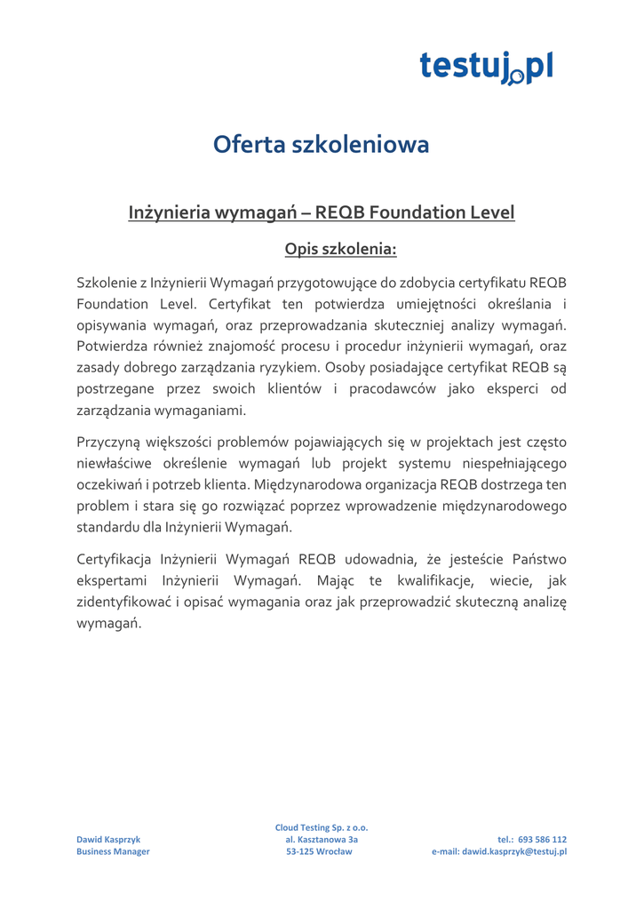 Oferta szkoleniowa Inżynieria wymagań – REQB Foundation Level Opis szkolenia: Szkolenie z Inżynierii Wymagań przygotowujące do zdobycia certyfikatu REQB Foundation Level. Certyfikat ten potwierdza umiejętności określania i opisywania wymagań, oraz przeprowadzania skuteczniej analizy wymagań. Potwierdza również znajomość procesu i procedur inżynierii wymagań, oraz zasady dobrego zarządzania ryzykiem. Osoby posiadające certyfikat REQB są postrzegane przez swoich klientów i pracodawców jako eksperci od zarządzania wymaganiami. Przyczyną większości problemów pojawiających się w projektach jest często niewłaściwe określenie wymagań lub projekt systemu niespełniającego oczekiwań i potrzeb klienta. Międzynarodowa organizacja REQB dostrzega ten problem i stara się go rozwiązać poprzez wprowadzenie międzynarodowego standardu dla Inżynierii Wymagań. Certyfikacja Inżynierii Wymagań REQB udowadnia, że jesteście Państwo ekspertami Inżynierii Wymagań. Mając te kwalifikacje, wiecie, jak zidentyfikować i opisać wymagania oraz jak przeprowadzić skuteczną analizę wymagań. Dawid Kasprzyk Business Manager Cloud Testing Sp. z o.o. al. Kasztanowa 3a 53-125 Wrocław tel.: 693 586 112 e-mail: [email protected] SZCZEGÓŁY SZKOLENIA Liczba miejsc Max. 12 osób Czas trwania 2 dni (16h) Lokalizacja do ustalenia Własny komputer NIE Możliwość zdawania egzaminu po Egzamin szkoleniu REQB FL Podczas szkolenia zapewniamy przerwy kawowe i lunch, komfortową Uwagi dodatkowe salę szkoleniową i profesjonalnego trenera Harmonogram szkolenia: Podstawy testowania oprogramowania Podstawy Procesy i procedury Zarządzanie projektem i ryzykiem Odpowiedzialności i role Identyfikacja wymagań Specyfikacja wymagań Analiza wymagań Śledzenie wymagań Zapewnianie jakości Narzędzia Dawid Kasprzyk Business Manager Cloud Testing Sp. z o.o. al. Kasztanowa 3a 53-125 Wrocław tel.: 693 586 112 e-mail: [email protected] Dedykowany trener: Karolina Zmitrowicz Doświadczony wykładowca, trener i praktyk z zakresu zarządzania jakością i analizy biznesowej oraz systemowej. Brała udział w pracach nad programami certyfikacji inżynierów wymagań REQB (Requirements Engineering Qualification Board), analityków biznesowych IQBBA (International Qualification Board for Business Analysis), inżynierów użyteczności IBUQ (International Board for Usability Qualification) oraz pisarzy technicznych ITCQF (International Technical Communication Qualifications Foundation). Obecnie czynnie działa w pracach ISTQB (International Software Testing Qualification Board) oraz działaniach TMMi (Test Maturity Model integration). Jest redaktorem naczelnym magazynu Quale o tematyce jakościowej oraz członkiem Stowarzyszenia Jakości Systemów Informatycznych. Autorka wielu publikacji z obszaru jakości oprogramowania i analiz oraz książek: Inżynieria wymagań – teoria i praktyka (PWN), Analityk systemów (PWN), Tester oprogramowania (PWN). Absolwentka kierunku Inżynieria Produkcji na Wydziale Informatyki Zachodniopomorskiego Uniwersytetu Technicznego. Dyplom audytora systemu zarządzania jakością na kierunku Menedżer i audytor systemu zarządzania jakością. Posiada certyfikaty: ISTQB Certified Tester, ISTQB Certified Test Manager, REQB Certified Professional for Requirements Engineering, REQB Certified Requirements Manager, REQB CRM, IQBBA Certified Business Analyst , IBUQ Professional for Usability Engineering, Audytor ISO 9001:2008. Dawid Kasprzyk Business Manager Cloud Testing Sp. z o.o. al. Kasztanowa 3a 53-125 Wrocław tel.: 693 586 112 e-mail: [email protected] Zapraszamy do kontaktu: Dawid Kasprzyk Business Manager Cloud Testing Sp. z o.o. al. Kasztanowa 3a 53-125 Wrocław Tel. 693 586 112 e-mail: [email protected] Potrzebujesz więcej szkoleń, odwiedź: Dawid Kasprzyk Business Manager Cloud Testing Sp. z o.o. al. Kasztanowa 3a 53-125 Wrocław tel.: 693 586 112 e-mail: [email protected]