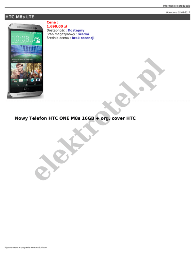 Informacje o produkcie Utworzono 02-03-2017 HTC M8s LTE Cena : 1.699,00 zł te l.p l Dostępność : Dostępny Stan magazynowy : średni Średnia ocena : brak recenzji el ek tr o Nowy Telefon HTC ONE M8s 16GB + org. cover HTC Wygenerowano w programie www.oscGold.com l.p l te tr o ek informacje ogólne: Do zaoferowania mamy Państwu nowy model telefon HTC ONE M8s 16GB Gwarancja na telefon - 24 miesiące, według producenta HTC Polska, realizowana na terenie całego kraju oraz UE. el Telefon fabrycznie nie posiada blokady simlock. Kolor telefonu - Grey - grafitowy Telefon pochodzi z polskiej dystrybucji HTC Polska Nie posiadają logo operatora na obudowie. Bez Brandu operatora/Czysty Soft, Do każdego telefonu dołączany jest dowód zakupu w postaci paragonu fiskalnego lub na życzenie Faktura VAT 23% vat oraz karta gwarancyjna HTC na 24 miesiące. Zestaw zawiera: Informacje o produkcie ■ telefon HTC M8s ■ oryginalne pudełko HTC ONE M8s ■ oryginalna ładowarka sieciowa ■ kabel USB ■ oryginalny zestaw słuchawkowy HTC STEREO ■ instrukcja w j.polskim ■ dowód ■ ■ zakupu FV lub paragon karta gwarancyjna HTC POLSKA na 2 lata oryginalne etui cover HTC - szary ek tr o te l.p l Opis produktu: el ZAKUPY NA RATY W SYGMA BANK MOŻLIWOŚĆ ZAPŁATY KARTĄ KREDYTOWĄ ElektroTEL Rzeszów 2016 Wygenerowano w programie www.oscGold.com