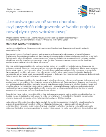 Stefan Schwarz Inicjatywa Mobilności Pracy „Lekarstwo gorsze niż sama choroba, czyli przyszłość delegowania w świetle projektu nowej dyrektywy wdrożeniowej” I Ogólnopolska Konferencja „Koordynacja systemów zabezpieczenia społecznego” Sesja plenarna, Uniwersytet Ekonomiczny w Krakowie, 11 kwietnia 2013 r. Nowy duch dyrektywy wdrożeniowej Jestem przedsiębiorcą. Dlatego w mojej wypowiedzi będę starał się przedstawić punkt widzenia przedsiębiorców. Zacznę od naszych frustracji – one są ważne, ponieważ wszyscy je odczuwamy w kontekście prac Parlamentu Europejskiego nad nową dyrektywą wdrożeniową dot. delegowania pracowników w ramach świadczenia usług. Określenia „nowa dyrektywa” używam świadomie, ponieważ moim zdaniem projekt dyrektywy wdrożeniowej zaproponowany przez Komisję Europejską wykracza poza zapisy dyrektywy podstawowej, całkowicie zmieniając jej „ducha”. Dla nas, polskich przedsiębiorców wolny rynek jest polem gry, na którym funkcjonujemy stosując się do ustalonych reguł. Dla mnie rynek wewnętrzny oznacza, że gdy pójdę do najbliższego sklepu spożywczego, będę mógł kupić w nim francuskie wino. Z drugiej strony, gdy francuski plantator poszukuje pracowników tymczasowych na zbiory winogron, to może on skorzystać z usług mojej agencji zatrudnienia równie swobodnie, jak ja mogę kupić jego produkt w sklepie w Krakowie. Bez nadmiernych barier ani dyskryminacji. Taka sytuacja dla mnie jest naturalna i sprawiedliwa. Dla nas, polskich przedsiębiorców świadczących usługi na obszarze rynku wewnętrznego, delegowanie jest podstawowym narzędziem. Bez niego nie możemy funkcjonować. Zastanawiałem się przed konferencją, czy istnieją jakieś usługi, które można świadczyć bez delegowania. Na pewno tak. Przykładem mogą być choćby zdalne tłumaczenia, które można realizować i przesyłać drogą e-mailową. Jednak absolutna większość usług wymaga fizycznej obecności pracownika w miejscu realizacji zlecenia. Nawet usługi programistyczne zawsze kończą się wdrożeniem u klienta. Prawda jest taka, że bez narzędzia, którym jest delegowanie, prawie żadne polskie przedsiębiorstwo nie będzie mogło świadczyć swoich usług na rynku wewnętrznym. A chcielibyśmy to robić, tak samo jak chcemy kupować francuskie wina, holenderskie kwiaty czy fińskie masełka. Jako ekonomista czuję się w obowiązku dodać, że wymienione przeze mnie kwiaty, wina i masełka to przykłady ograniczonych zasobów, które występują ekskluzywnie w poszczególnych państwach członkowskich. Holendrzy mają kwiaty, Francuzi wina i sery, a Polska ma dobrą, wykwalifikowaną siłę roboczą. Każdy kraj ma inne ograniczone zasoby, które oferuje na rynku wewnętrznym. Sprawiedliwe jest, gdy państwa członkowskie mogą je oferować na równych warunkach bez dyskryminacji. Tak funkcjonujący rynek wewnętrzny przynosi korzyści i prowadzi do rozwoju wszystkich państw Unii Europejskiej. Czytając dyrektywę podstawową (96/71/WE) miałem odczucie, że jest ona bardzo pozytywna i prorozwojowa. Co prawda, wprowadza pewne ograniczenia w mobilności pracowników, ale jej „ducha” i intencję ustawodawcy można odczytać choćby przytaczając używane w niej czasowniki: „ułatwianie korzystania ze swobody”, „przezwyciężanie przeszkód”, „stymulowanie przenikania gospodarczego”, „unikanie utrudnień” czy „propagowanie mobilności pracowników i bezrobotnych”. Pozwolę sobie zacytować jeden punkt z dyrektywy podstawowej: „celem delegowania jest uniknięcie przez pracowników, pracodawców i instytucje problemów i utrudnień, które powstałyby w skutek zastosowania zasady ogólnej.” Otóż delegowanie służy do tego, by było mniej problemów! Nie tylko dla nas, przedsiębiorców, ale również dla instytucji zabezpieczenia społecznego i przede wszystkim dla samych pracowników. Oczywiście, delegowanie jest wyjątkiem od zasady ogólnej. Jednak dla nas ten wyjątek jest bardzo istotny, ponieważ warunkuje nasze istnienie na rynku wewnętrznym. Duch dyrektywy wdrożeniowej, formalnie jedynie doprecyzowującej dyrektywę podstawową, to zupełnie nowy, inny duch. Opisują go czasowniki, które dominują w jej treści: „zwalczać”, „zniechęcać”, „nie dopuszczać”, „uniemożliwiać”, „odstraszać”. Czytając projekt przygotowany przez Komisję Europejską wyraźnie czujemy, że kryzys zupełnie zmienił priorytety i nastroje polityczne w Europie. Te czasowniki pokazują realny zamiar, jaki towarzyszy wprowadzeniu tej dyrektywy. Ten zamiar jest dla nas – polskich przedsiębiorców – przerażający. Patologia, czyli nowa definicja delegowania Odnoszę wrażenie, że w świadomości wielu polityków, związków zawodowych czy instytucji zabezpieczenia społecznego zaczęła funkcjonować nieoficjalnie alternatywna definicja delegowania, która brzmi: „Delegowanie to patologia polegająca na wykorzystywaniu luk prawnych do obchodzenia przepisów i nadużyć przez przedsiębiorstwa, powodująca naruszanie praw pracowniczych i nieuczciwą konkurencję na rynku wewnętrznym.” Jako polski przedsiębiorca zadaję sobie pytanie, czy to nasza wina? Nasza, czyli małych i mikroprzedsiębiorstw, których w Polsce jest najwięcej? Wydaje mi się, że nie. Wyroki Europejskiego Trybunału Sprawiedliwości, które przytaczane są jako przyczyna podjęcia walki z patologiami w delegowaniu nie dotyczyły małych i mikroprzedsiębiorstw. Gdy poszukamy w przeszłości głośnych przypadków łamania praw pracowników delegowanych, to okaże się, że przytłaczająca większość dotyczyła pracowników zatrudnianych na czarno lub delegowanych przez spółki-skrzynki kontaktowe, zakładane w Polsce przez średnie i duże zagraniczne firmy. Nadużycia ze strony polskich przedsiębiorstw delegujących trudno znaleźć. Winni nadużyć będą ukarani? Faktem jest, że nadużycia występu