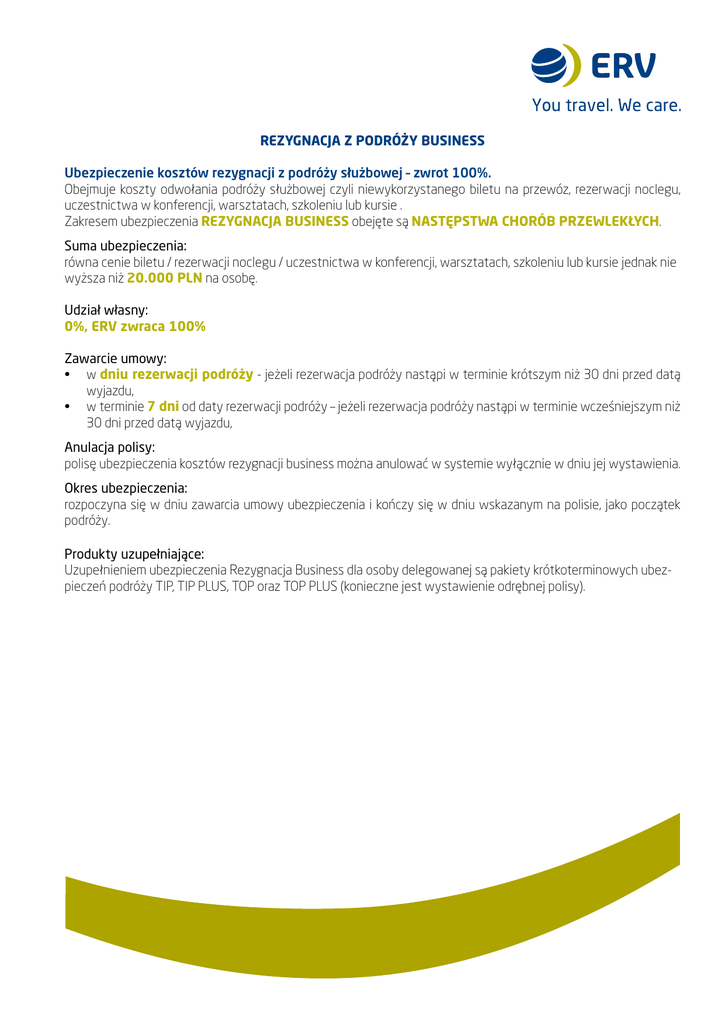 REZYGNACJA Z PODRÓŻY BUSINESS Ubezpieczenie kosztów rezygnacji z podróży służbowej – zwrot 100%. Obejmuje koszty odwołania podróży służbowej czyli niewykorzystanego biletu na przewóz, rezerwacji noclegu, uczestnictwa w konferencji, warsztatach, szkoleniu lub kursie . Zakresem ubezpieczenia REZYGNACJA BUSINESS obejęte są NASTĘPSTWA CHORÓB PRZEWLEKŁYCH. Suma ubezpieczenia: równa cenie biletu / rezerwacji noclegu / uczestnictwa w konferencji, warsztatach, szkoleniu lub kursie jednak nie wyższa niż 20.000 PLN na osobę. Udział własny: 0%, ERV zwraca 100% Zawarcie umowy: • w dniu rezerwacji podróży - jeżeli rezerwacja podróży nastąpi w terminie krótszym niż 30 dni przed datą wyjazdu, • w terminie 7 dni od daty rezerwacji podróży – jeżeli rezerwacja podróży nastąpi w terminie wcześniejszym niż 30 dni przed datą wyjazdu, Anulacja polisy: polisę ubezpieczenia kosztów rezygnacji business można anulować w systemie wyłącznie w dniu jej wystawienia. Okres ubezpieczenia: rozpoczyna się w dniu zawarcia umowy ubezpieczenia i kończy się w dniu wskazanym na polisie, jako początek podróży. Produkty uzupełniające: Uzupełnieniem ubezpieczenia Rezygnacja Business dla osoby delegowanej są pakiety krótkoterminowych ubezpieczeń podróży TIP, TIP PLUS, TOP oraz TOP PLUS (konieczne jest wystawienie odrębnej polisy). PRZEDMIOT UBEZPIECZENIA - REZYGNACJA BUSINESS Koszty rezygnacji z podróży służbowej - to przewidziane w umowie przewozu, rezerwacji noclegu lub umowie uczestnictwa w konferencji, warsztatach, szkoleniu lub kursie, koszty poniesione przez Ubezpieczonego (Pracodawcę) w związku z odwołaniem podróży służbowej osoby delegowanej przed jej rozpoczęciem. ERV zwraca te koszty pod warunkiem, że osoba delegowana nie może odbyć podróży zgodnie z planem i jeżeli przyczyną rezygnacji jest: 1) śmierć osoby delegowanej, 2) ś mierć najbliższego krewnego osoby delegowanej, która nastąpiła w ciągu 30 dni bezpośrednio poprzedzających datę wyjazdu, 3) n ieszczęśliwy wypadek lub nagłe zachorowanie osoby delegowanej, pod warunkiem, że istnieją przeciwwskazania medyczne do odbycia podróży, potwierdzone stosownym zaświadczeniem lekarskim, 4) n ieszczęśliwy wypadek lub nagłe zachorowanie najbliższego krewnego osoby delegowanej, skutkujące hospitalizacją lub powodujące konieczność sprawowania nad nim opieki, potwierdzoną stosownym zaświadczeniem lekarskim i nie rokujące poprawy stanu zdrowia do rozpoczęcia podróży służbowej, 5) c iąża lub jej powikłania, o ile w momencie zawarcia umowy przewozu, umowy rezerwacji noclegu lub umowy (formularza zgłoszenia uczestnictwa w konferencji, warsztatach, szkoleniu lub kursie osoba delegowana była przed 20 tygodniemciąży, 6) w yznaczenie daty transplantacji tkanki żywej bądź narządów osobie delegowanej lub najbliższemu krewnemu osoby delegowanej, na co najwyżej 30 dni przed datą podróży służbowej, pod warunkiem, że termin transplantacji nie był znany w momencie zawarcia umowy przewozu, umowy rezerwacji noclegu lub umowy (formularza) zgłoszenia uczestnictwa w konferencji, warsztatach, szkoleniu lub kursie, 7) s zkoda w mieniu osoby delegowanej, powstała wskutek ryzyka elementarnego lub przestępstwa (np. kradzież z włamaniem), która wystąpiła w okresie 30 dni bezpośrednio poprzedzających datę podróży służbowej i powodowała konieczność dokonania czynności prawnych i administracyjnych oraz obecności osoby delegowanej w kraju zamieszkania w czasie planowanej podróży służbowej, 8) s zkoda w mieniu Ubezpieczonego powstała wskutek ryzyka elementarnego lub będąca następstwem przestępstwa (np. kradzież z włamaniem), która wystąpiła w okresie 7 dni bezpośrednio poprzedzających datę podróży służbowej i powodowała konieczność dokonania czynności prawnych i administracyjnych oraz obecności osoby delegowanej w kraju zamieszkania w czasie planowanej podróży służbowej, 9) z wolnienie osoby delegowanej z pracy przez Ubezpieczonego lub wypowiedzenie stosunku pracy przez osobę delegowaną, pod warunkiem, że w dniu zawarcia umowy ubezpieczenia osoba delegowana była zatrudniona na podstawie umowy o pracę zawartej na czas nieokreślony albo pracowała przez okres co najmniej 6 miesięcy na podstawie umowy o pracę na czas określony; ERV ponosi odpowiedzialność w przypadku dyscyplinarnego zwolnienia z pracy (bez zastosowania okresu wypowiedzenia) lub rozwiązania umowy za porozumieniem stron, 10) k radzież dokumentów osoby delegowanej, których brak uniemożliwia odbycie podróży zagranicznej (np. paszport, dowód osobisty, wiza), pod warunkiem, że kradzież miała miejsce w okresie 14 dni bezpośrednio poprzedzających datę wyjazdu i została zgłoszona policji, 11) w yznaczenie osobie delegowanej daty egzaminu poprawkowego w szkole lub na uczelni wyższej, którego zaliczenie/ zdanie jest niezbędne do kontynuowania nauki, pod warunkiem, że data egzaminu poprawkowego przypada na czas podróży służbowej i nie była znana w momencie zawarcia umowy przewozu, umowy rezerwacji noclegu lub umowy (formularza) zgłoszenia uczestnictwa w konferencji, warsztatach, szkoleniu lub kursie. 12) udokumentowanych przyczyn związanych między innymi z: a. nieobecnością innego pracownika Ubezpieczonego spowodowaną nagłym zachorowaniem, nieszczęśliwym wypadkiem bądź urlopem na żądanie, wiążącym się z koniecznością zastąpienia go przez osobę delegowaną, b. kontrolą z US, ZUS lub innej instytucji państwowej, która została wyznaczona na czas podróży służbowej i wymagana jest obecność osoby delegowanej w czasie kontroli, c. odwołaniem spotkania biznesowego przez Ubezpieczonego lub kontrahenta Ubezpieczonego.