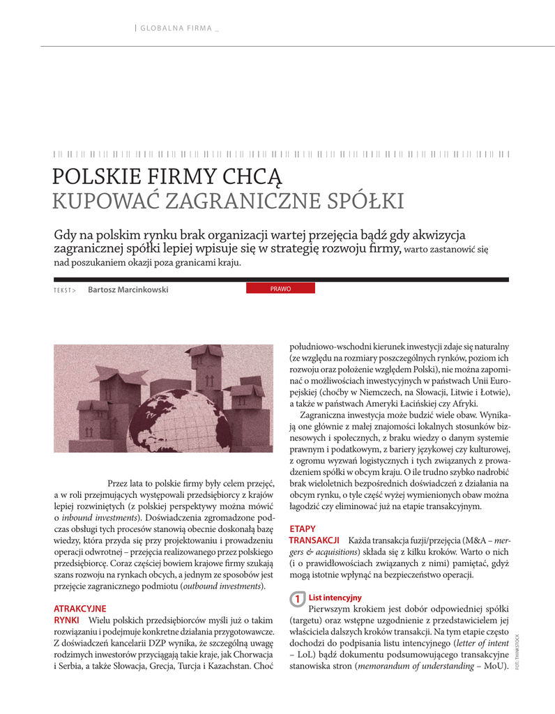 G LO B A L N A F I R MA _ POLSKIE FIRMY CHCĄ KUPOWAĆ ZAGRANICZNE SPÓŁKI Gdy na polskim rynku brak organizacji wartej przejęcia bądź gdy akwizycja zagranicznej spółki lepiej wpisuje się w strategię rozwoju firmy, warto zastanowić się nad poszukaniem okazji poza granicami kraju. Bartosz Marcinkowski PRAWO Przez lata to polskie firmy były celem przejęć, a w roli przejmujących występowali przedsiębiorcy z krajów lepiej rozwiniętych (z polskiej perspektywy można mówić o inbound investments). Doświadczenia zgromadzone podczas obsługi tych procesów stanowią obecnie doskonałą bazę wiedzy, która przyda się przy projektowaniu i prowadzeniu operacji odwrotnej – przejęcia realizowanego przez polskiego przedsiębiorcę. Coraz częściej bowiem krajowe firmy szukają szans rozwoju na rynkach obcych, a jednym ze sposobów jest przejęcie zagranicznego podmiotu (outbound investments). ATRAKCYJNE RYNKI Wielu polskich przedsiębiorców myśli już o takim rozwiązaniu i podejmuje konkretne działania przygotowawcze. Z doświadczeń kancelarii DZP wynika, że szczególną uwagę rodzimych inwestorów przyciągają takie kraje, jak Chorwacja i Serbia, a także Słowacja, Grecja, Turcja i Kazachstan. Choć południowo-wschodni kierunek inwestycji zdaje się naturalny (ze względu na rozmiary poszczególnych rynków, poziom ich rozwoju oraz położenie względem Polski), nie można zapominać o możliwościach inwestycyjnych w państwach Unii Europejskiej (choćby w Niemczech, na Słowacji, Litwie i Łotwie), a także w państwach Ameryki Łacińskiej czy Afryki. Zagraniczna inwestycja może budzić wiele obaw. Wynikają one głównie z małej znajomości lokalnych stosunków biznesowych i społecznych, z braku wiedzy o danym systemie prawnym i podatkowym, z bariery językowej czy kulturowej, z ogromu wyzwań logistycznych i tych związanych z prowadzeniem spółki w obcym kraju. O ile trudno szybko nadrobić brak wieloletnich bezpośrednich doświadczeń z działania na obcym rynku, o tyle część wyżej wymienionych obaw można łagodzić czy eliminować już na etapie transakcyjnym. ETAPY TRANSAKCJI Każda transakcja fuzji/przejęcia (M&A – mergers & acquisitions) składa się z kilku kroków. Warto o nich (i o prawidłowościach związanych z nimi) pamiętać, gdyż mogą istotnie wpłynąć na bezpieczeństwo operacji. 1 List intencyjny Pierwszym krokiem jest dobór odpowiedniej spółki (targetu) oraz wstępne uzgodnienie z przedstawicielem jej właściciela dalszych kroków transakcji. Na tym etapie często dochodzi do podpisania listu intencyjnego (letter of intent – LoL) bądź dokumentu podsumowującego transakcyjne stanowiska stron (memorandum of understanding – MoU). FOT.: THINKSTOCK TEKST> 70 _ 71 FIRMA Pożądane jest, aby LoL zawierał klauzulę wyłączności negocjacyjnej. Dzięki temu polski inwestor zyskuje komfort, iż w czasie trwania wyłączności będzie jedynym podmiotem uczestniczącym w procesie. 2 GŁÓWNA MYŚL: .Analiza dynamiki rozwoju polskich firm pozwala sądzić, że coraz częściej będą one dokonywać zagranicznych fuzji i przejęć. .Zagraniczna inwestycja może budzić obawy, dlatego dobrze ją przygotować z udziałem kancelarii prawnych i doradców podatkowych znających regulacje państwa, w którym działa przejmowana spółka. Badanie spółki Kolejnym etapem jest zazwyczaj złożone badanie due diligence (DD), obejmujące poszczególne sfery dotyczące funkcjonowania firmy, w tym zwłaszcza aspekty prawne, podatkowe i księgowo-finansowe. Wynikiem badania jest raport DD, którego wnioski są następnie przenoszone do umowy nabycia udziałów w spółce (share deal) lub jej składników (asset deal). Wybór konkretnego modelu transakcji, w tym nierzadko z wykorzystaniem spółki utworzonej wyłącznie w celu jej realizacji (special purpose vehicle – SPV), w znacznej mierze zależy od rekomendacji doradcy podatkowego. Badanie due diligence stanowi zatem kluczowy element przedsięwzięcia, zwykle też najbardziej czasochłonny. Technicznie coraz częściej realizowane jest przy wykorzystaniu platformy internetowej (virtual data room). Zaletą takiego rozwiązania jest zdalny dostęp do dokumentacji spółki przejmowanej, zgromadzonej w elektronicznym „pokoju danych”, co może znacząco przyspieszyć badanie. Oczywiście, biorąc pod uwagę zagraniczny aspekt transakcji, w badaniu muszą uczestniczyć specjaliści (zwłaszcza prawnicy i doradcy podatkowi) znający regulacje obowiązujące w państwie, z którego pochodzi przejmowana spółka. Jednak rola polskich ekspertów nadal pozostaje znacząca –podejmują bowiem wysiłki koordynujące, odpowiadając za terminarz i przebieg operacji wobec polskiego inwestora. Ponadto sprawdzają wyniki pracy zagranicznych doradców, wyjaśniając poszczególne kwestie, „zderzając” je z doświadczeniami wyniesionymi z innych projektów oraz regulacjami polskimi czy unijnymi. Tym sposobem polscy prawnicy czy doradcy podatkowi stanowią rodzaj pierwszego sita czy pasa transmisyjnego i ułatwiają polskiemu W W W. M T T P. P L 19 _ 2013 inwestorowi zrozumienie oraz ocenę ewentualnych niuansów obcych regulacji i sytuacji spółki. 3 Umowa Wyniki due diligence istotnie oddziałują na treść konkretnej umowy – określmy ją mianem share purchase agrement (SPA). Zważywszy na międzynarodowy charakter transakcji, konieczne jest uzgodnienie prawa rządzącego umową SPA. Rzecz w tym, że strony mogą wybrać, jakiemu reżimowi prawnemu (ustawodawstwu którego państwa) będzie ona podlegać. Zasadniczo opcje są trzy: prawo polskie (rozwiązanie optymalne dla polskiego inwestora), prawo właściwe z uwagi na lokalizację spółki przejmowanej (opcja zwykle preferowana przez sprzedającego) oraz prawo „neutralne” z punktu widzenia uczestników transakcji, czyli prawo innego państwa 12% Taki procent wszystkich transakcji na polskim rynku fuzji i przejęć w pierwszej połow