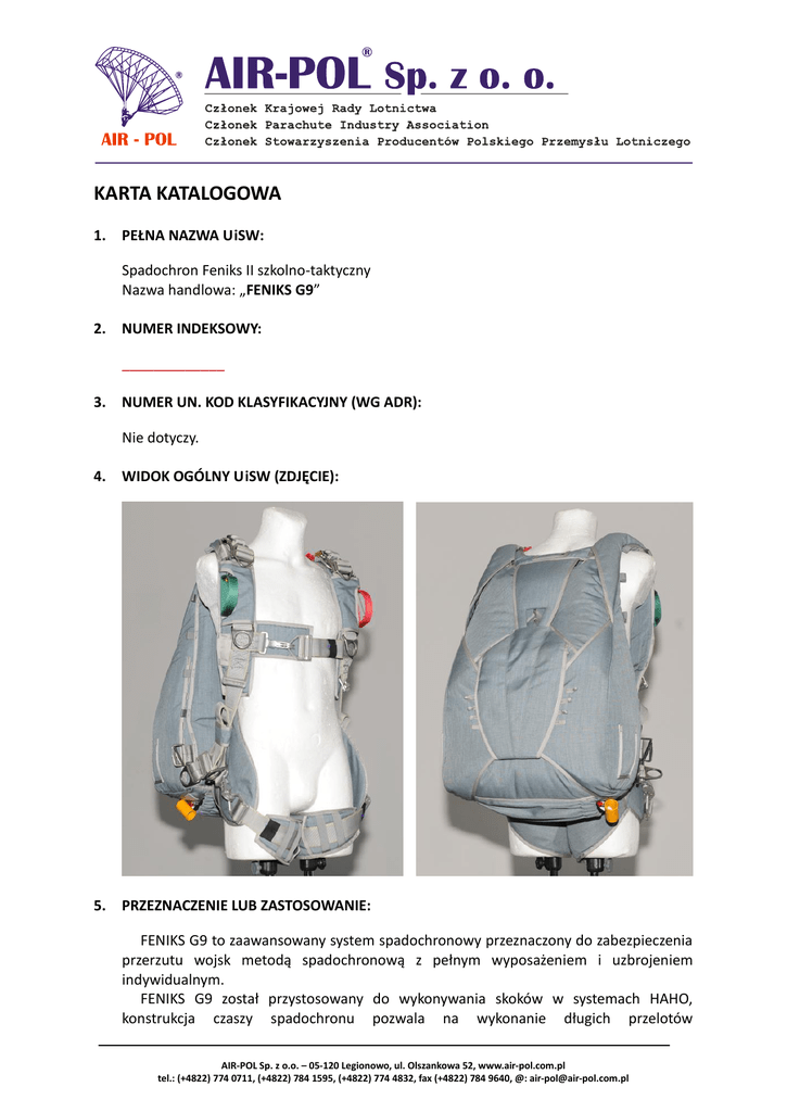 KARTA KATALOGOWA 1. PEŁNA NAZWA UiSW: Spadochron Feniks II szkolno-taktyczny Nazwa handlowa: „FENIKS G9” 2. NUMER INDEKSOWY: _____________ 3. NUMER UN. KOD KLASYFIKACYJNY (WG ADR): Nie dotyczy. 4. WIDOK OGÓLNY UiSW (ZDJĘCIE): 5. PRZEZNACZENIE LUB ZASTOSOWANIE: FENIKS G9 to zaawansowany system spadochronowy przeznaczony do zabezpieczenia przerzutu wojsk metodą spadochronową z pełnym wyposażeniem i uzbrojeniem indywidualnym. FENIKS G9 został przystosowany do wykonywania skoków w systemach HAHO, konstrukcja czaszy spadochronu pozwala na wykonanie długich przelotów AIR-POL Sp. z o.o. – 05-120 Legionowo, ul. Olszankowa 52, www.air-pol.com.pl tel.: (+4822) 774 0711, (+4822) 784 1595, (+4822) 774 4832, fax (+4822) 784 9640, @: [email protected] Karta katalogowa: FENIKS G9. z zamontowaną aparaturą tlenową i dużym komfortem skoczka, regulacja uprzęży pozwala na idealne dopasowanie systemu do wzrostu i wagi skoczka. System podczepiania zasobnika pozwala na wykonywanie skoków z ciężkimi zasobnikami o dużych gabarytach. Lądowanie może odbywad się bez odpinania zasobnika lub metodą zrzucenia go na linie desantowej. System pomimo swojego zaawansowania może służyd do prowadzenia szkolenia skoczków rozpoczynających wykonywanie przelotów w grupach wieloosobowych na spadochronach typu skrzydło. Dzięki występującym w systemie opcjom otwarcia spadochronu głównego, spadochron może byd użyty do każdej operacji z wykorzystaniem przerzutu metodą spadochronową. Doskonałe właściwości lotne czaszy głównej pozwalają na wykonywanie przelotów na dużych odległościach i lądowanie z dużym obciążeniem w rejonach górskich na wysokości powyżej 3500 m n.p.m. 6. OPIS UiSW I JEGO WYPOSAŻENIE: System spadochronowy FENIKS G9 wykonany jest w klasycznym układzie plecy-plecy ze zintegrowaną uprzężą, przedział spadochronu zapasowego znajduje się w górnej części pokrowca i wykonany jest z podwójnej warstwy tkaniny. Zamykany jest jedną zawleczką i pętlą zamykającą przechodzącą kolejno przez dwa wewnętrzne wyłogi, spadochron wyciągający i cztery zewnętrzne wyłogi. Wyłóg/klapa przykrywająca zawleczkę posiada wizjer do łatwej kontroli jej położenia (opcja, wyłóg może byd bez wizjera). Pokrowiec posiada trzy niezależne systemy otwarcia przedziału spadochronu zapasowego: uchwyt wyzwalający, system RSL (Reserve Static Line), automat typu AAD do którego zamontowania jest przygotowany. Przedział spadochronu głównego znajduje się w dolnej części pokrowca i wykonany jest z podwójnej warstwy tkaniny. Posiada cztery wyłogi z oczkami i zamykany jest dzięki wymiennej pętli zamykającej umieszczanej w dolnym wyłogu przedziału. Pomiędzy dolną ścianą przedziału spadochronu zapasowego a górnym wyłogiem przedziału spadochronu głównego znajduje się taśma z klamrą-pierścieniem do mocowania taśmy łączącej spadochronu oporowego przy pomocy trójpierścieniowego zamka drugiego stopnia otwarcia spadochronu głównego. Na taśmie tej zamocowane są dwa węże osłaniające linki uchwytów wyzwalających. Jeden wykorzystywany jest w przypadku przygotowania spadochronu z wewnętrznym, sprężynowym spadochronem wyciągającym i poprowadzony jest do centralnej części wejścia elastycznej kieszeni miękkiego spadochronu wyciągającego na dolnej ścianie pokrowca. Drugi wąż używany jest w przypadku wykorzystania spadochronu oporowego do blokowania zamka pierwszego stopnia systemu otwarcia i kooczy się w części piersiowej, przy uchwycie wyczepiającym czaszę główną. Na bocznych wyłogach znajdują się pętle na pierścienie gumowe, służące do wplatania liny wyciągającej i mocowania kieszeni spadochronu oporowego. Po bokach pokrowca znajdują się kieszenie, które służą do umieszczenia karabioczyka liny wyciągającej. Na bokach pokrowca znajdują się także mocowania kieszeni oraz pętle montażowe na wyposażenie dodatkowe (butle z tlenem, radiostacja, instalacja tlenowa). Uprząż jest zintegrowana z pokrowcem. Jej częśd plecowa i ramieniowa znajduje się wewnątrz pokrowca. Uprząż posiada możliwośd podłączenia zasobnika towarowego AIR-POL Sp. z o.o. – 05-120 Legionowo, ul. Olszankowa 52, www.air-pol.com.pl tel.: (+4822) 774 0711, (+4822) 784 1595, (+4822) 774 4832, fax (+4822) 784 9640, @: [email protected] Karta katalogowa: FENIKS G9. dzięki klamrom wszytym w pionowe, boczne oraz udowe taśmy uprzęży. W części ramieniowo-piersiowej znajdują się miejsca na uchwyty: wyczepiający czaszę główną zewnętrzny taśmowy z prawej strony i wyzwalający spadochron zapasowy zewnętrzny taśmowy z lewej strony. Elementy metalowe uprzęży wykonane są ze stali powlekanej lub opcjonalnie ze stali nierdzewnej w zależności od zamówienia. Zapinanie uprzęży może byd wykonywane klamrami typu: B-12. Quick Ejector – opcja. Thread Thru (taśmy przeplatane na klamrach O) – opcja. Zestaw standardowo wykonany jest w kolorze czarnym, może jako opcja występowad w innych kolorach. ELEMENTY SYSTEMU SPADOCHRONOWEGO FENIKS G9 Lina wyciągająca. Kieszeo spadochronu oporowego – opcja. Uchwyt wyzwalający spadochron oporowy – opcja. Taśma łącząca spadochronu oporowego (częśd do spadochronu oporowego) – opcja. Taśma łącząca spadochronu oporowego (częśd z zamkiem) – opcja. Linka kill-line spadochronu oporowego – opcja. Taśma łącząca zawleczki spadochronu oporowego – opcja. Zawleczka z pętlą – opcja. Uchwyt wyzwalający sprężynowy spadochron wyciągający (spadochron główny) opcja Sprężynowy spadochron wyciągający spadochronu głównego – opcja. Taśma łącząca sprężynowego spadochronu wyciągającego (spadochron główny) opcja Miękki spadochron wyciągający spadochronu głównego. Taśma łącząca miękkiego spadochronu wyciągającego. Osłona czaszy spadochronu głównego. Łącznik czaszy głównej. Czasza spadochronu głównego wraz z linkami i „slide