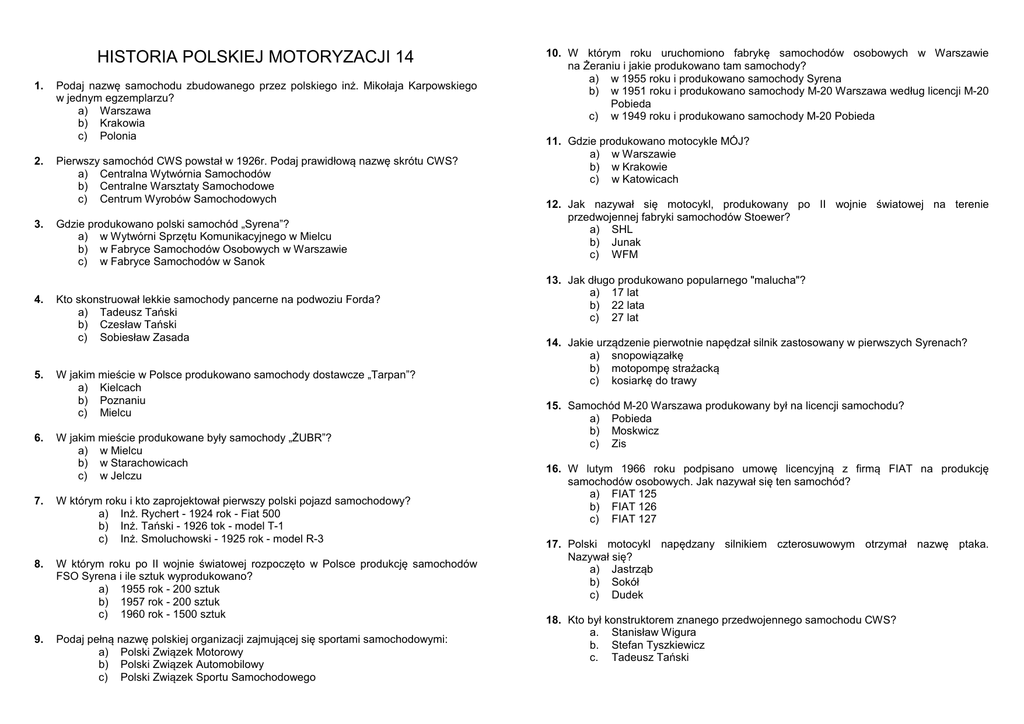 HISTORIA POLSKIEJ MOTORYZACJI 14 1. 2. 3. 4. 5. 6. 7. 8. 9. Podaj nazwę samochodu zbudowanego przez polskiego inż. Mikołaja Karpowskiego w jednym egzemplarzu? a) Warszawa b) Krakowia c) Polonia Pierwszy samochód CWS powstał w 1926r. Podaj prawidłową nazwę skrótu CWS? a) Centralna Wytwórnia Samochodów b) Centralne Warsztaty Samochodowe c) Centrum Wyrobów Samochodowych Gdzie produkowano polski samochód „Syrena”? a) w Wytwórni Sprzętu Komunikacyjnego w Mielcu b) w Fabryce Samochodów Osobowych w Warszawie c) w Fabryce Samochodów w Sanok Kto skonstruował lekkie samochody pancerne na podwoziu Forda? a) Tadeusz Tański b) Czesław Tański c) Sobiesław Zasada W jakim mieście w Polsce produkowano samochody dostawcze „Tarpan”? a) Kielcach b) Poznaniu c) Mielcu W jakim mieście produkowane były samochody „ŻUBR”? a) w Mielcu b) w Starachowicach c) w Jelczu W którym roku i kto zaprojektował pierwszy polski pojazd samochodowy? a) Inż. Rychert - 1924 rok - Fiat 500 b) Inż. Tański - 1926 tok - model T-1 c) Inż. Smoluchowski - 1925 rok - model R-3 W którym roku po II wojnie światowej rozpoczęto w Polsce produkcję samochodów FSO Syrena i ile sztuk wyprodukowano? a) 1955 rok - 200 sztuk b) 1957 rok - 200 sztuk c) 1960 rok - 1500 sztuk Podaj pełną nazwę polskiej organizacji zajmującej się sportami samochodowymi: a) Polski Związek Motorowy b) Polski Związek Automobilowy c) Polski Związek Sportu Samochodowego 10. W którym roku uruchomiono fabrykę samochodów osobowych w Warszawie na Żeraniu i jakie produkowano tam samochody? a) w 1955 roku i produkowano samochody Syrena b) w 1951 roku i produkowano samochody M-20 Warszawa według licencji M-20 Pobieda c) w 1949 roku i produkowano samochody M-20 Pobieda 11. Gdzie produkowano motocykle MÓJ? a) w Warszawie b) w Krakowie c) w Katowicach 12. Jak nazywał się motocykl, produkowany po II wojnie światowej na terenie przedwojennej fabryki samochodów Stoewer? a) SHL b) Junak c) WFM 13. Jak długo produkowano popularnego "malucha"? a) 17 lat b) 22 lata c) 27 lat 14. Jakie urządzenie pierwotnie napędzał silnik zastosowany w pierwszych Syrenach? a) snopowiązałkę b) motopompę strażacką c) kosiarkę do trawy 15. Samochód M-20 Warszawa produkowany był na licencji samochodu? a) Pobieda b) Moskwicz c) Zis 16. W lutym 1966 roku podpisano umowę licencyjną z firmą FIAT na produkcję samochodów osobowych. Jak nazywał się ten samochód? a) FIAT 125 b) FIAT 126 c) FIAT 127 17. Polski motocykl napędzany silnikiem czterosuwowym otrzymał nazwę ptaka. Nazywał się? a) Jastrząb b) Sokół c) Dudek 18. Kto był konstruktorem znanego przedwojennego samochodu CWS? a. Stanisław Wigura b. Stefan Tyszkiewicz c. Tadeusz Tański 19. Samochód ciężarowy Lublin 51 produkowany był na licencji samochodu? a. FIAT b. Chevrolet c. GAZ 29. Pojemność skokowa silnika samochodu Syrena 101 wynosiła? 3 a) 600 cm 3 b) 750 cm 3 c) 850 cm 20. AS to nazwa? a. popularnego motocykla produkowanego w latach trzydziestych w Łodzi b. samochodu osobowego produkowanego w latach dwudziestych w Warszawie c. rekordowego samochodu inż. Rychtera 30. Pierwszy prototyp samochodu Star 20 zaprezentowano w roku? a. 1947 b. 1948 c. 1949 21. Jak się nazywała wytwórnia, w której przed II wojną światową produkowano samochody CWS? 31. Do zapędu motocykla SHL M-02 (pierwszego z powojennej produkcji) użyto silnika o pojemności skokowej? 3 a. 98 cm 3 b. 123 cm 3 c. 150 cm a. b. c. Centralna Wytwórnia Samochodowa Centralne Warsztaty Samochodowe Centrum Wyrobów Samochodowych 22. Galicyjski Klub Automobilowy na początku XX wieku działał w? a. Warszawie b. Krakowie c. Przemyślu 23. Jakim silnikiem napędzany był samochód Mikrus, produkowany w Mielcu? a) dwucylindrowym silnikiem dwusuwowym b) jednocylindrowym silnikiem czterosuwowym c) dwucylindrowym silnikiem czterosuwowym 24. Gdzie produkowano popularne motocykle WSK? a. w Kielcach b. w Mielcu c. Świdniku 25. W którym roku rozpoczął oficjalną działalność Automobilklub Polski? a. 1919 b. 1921 c. 1923 26. W którym roku zjechał z linii pierwszy egzemplarz samochodu FSO Polonez? a. 1975 b. 1977 c. 1978 27. Jak nazywał się motorower produkowany w Zakrzowie k./ Wrocławia? a. Osa b. Ryś c. Fafis 28. Gdzie produkowano polskie samochody małolitrażowe Syrena typ 105? a. w Warszawie b. Bielsku-Białej c. Lublinie 32. Produkcję samochodu Polski Fiat 125p 1500 rozpoczęto w roku? a. 1965 b. 1968 c. 1969 33. Produkcję samochodu FSO Warszawa zakończono w roku? a. 1969 b. 1971 c. 1973 34. Pierwszy prototyp samochodu Syrena 100 zaprezentowano w roku? a. 1955 b. 1957 c. 1959 35. W ciągu 26 lat produkcji samochodów Syrena wyprodukowano? a. 478 513 sztuk pojazdów b. 521 311 sztuk pojazdów c. 663 487 sztuk pojazdów 36. Seryjną produkcję jednośladów w Polce zakończono w roku? a. 1985 b. 1989 c. 1991 37. W pojeździe nazwanym „Autofura” zastosowano silnik pochodzący z samochodu? a. FSC Żuk b. FSO Polonez 1500 c. Polski Fiat 126p 650 38. W 1924 roku Zakłady Mechaniczne Ursus SA uruchomiły produkcję? a. samochodów osobowych b. ciągników rolniczych c. samochodów ciężarowych 39. Samochód Warszawa wywodził się od samochodu M 20 Pobieda wzorowanym na? a. b. c. samochodzie Chevrolet samochodzie Dodge samochodzie Ford 40. Trzecie tylne drzwi miała odmiana Fiata 126p? a. Specjal b. Lux c. Bis 41. Do zapędu motocykla WSK M-21 Perkoz użyto silnika o pojemności skokowej? a. 125 b. 150 c. 175 42. Ile lat produkowano w Polsce samochód osobowy Warszawa? a. 26 lat b. 33 lata c. 22 lata 43. W którym roku została zakończona ostatecznie produkcja samochodu ciężarowego Lublin 51? a. 1954r. b. 1957r. c. 1959r. 44. Ile mocy posiadał trzy cylindrowy dwusuwowy silnik samochodu osobowego Syrena 104? a. 40 kW, b. 30 kW c. 60 kW 45. W którym roku w FSO rozpoczęto produkcję samochodu osobowego Polonez? a. 1973 r. b. 1975 r. c. 1978 r. 46. W ciągu 22 lat wyprodukowano w Pol