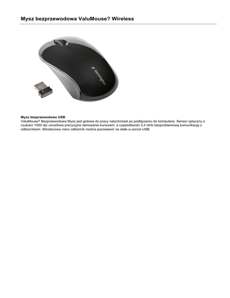 Mysz bezprzewodowa ValuMouse? Wireless Mysz bezprzewodowa USB ValuMouse? Bezprzewodowa Mysz jest gotowa do pracy natychmiast po podłączeniu do komputera. Sensor optyczny o czułości 1000 dpi umożliwia precyzyjne sterowanie kursorem, a częstotliwość 2,4 GHz bezproblemową komunikację z odbiornikiem. Miniaturowy nano odbiornik można pozostawić na stałe w porcie USB.
