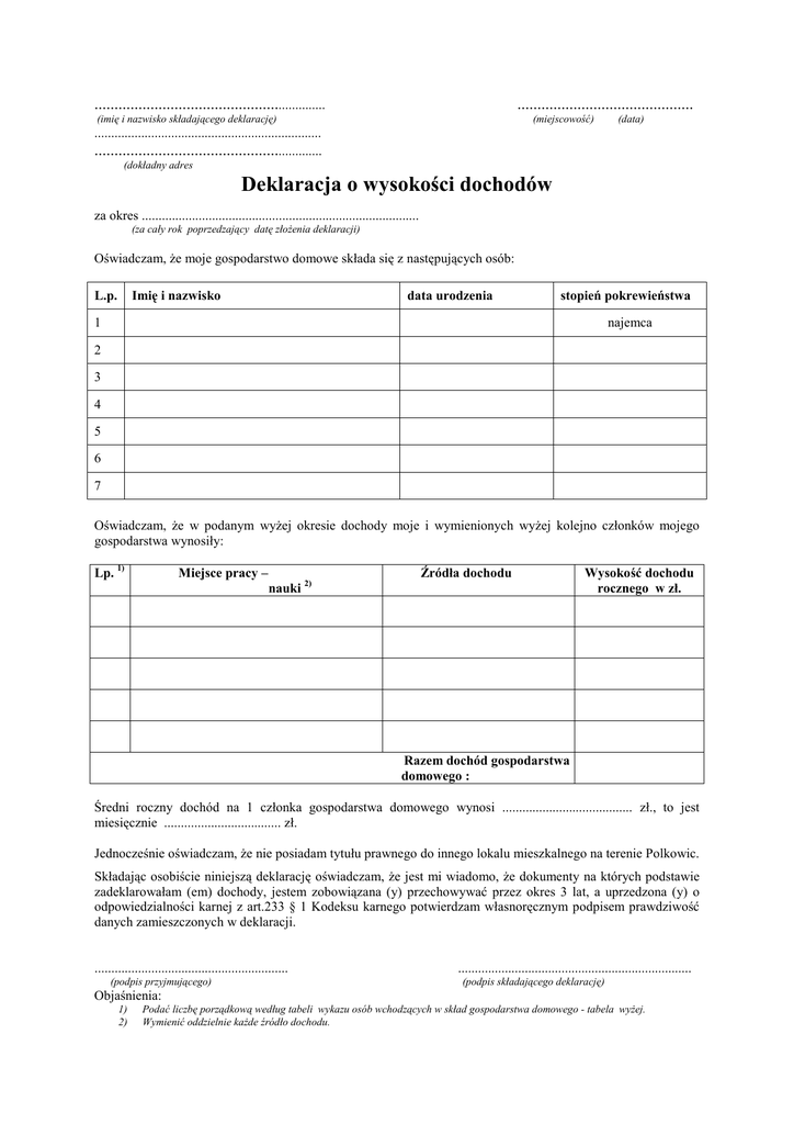 ............................................................ ............................................ (imię i nazwisko składającego deklarację) (miejscowość) (data) .................................................................... ........................................................... (dokładny adres Deklaracja o wysokości dochodów za okres ................................................................................... (za cały rok poprzedzający datę złożenia deklaracji) Oświadczam, że moje gospodarstwo domowe składa się z następujących osób: L.p. Imię i nazwisko data urodzenia stopień pokrewieństwa 1 najemca 2 3 4 5 6 7 Oświadczam, że w podanym wyżej okresie dochody moje i wymienionych wyżej kolejno członków mojego gospodarstwa wynosiły: Lp. 1) Miejsce pracy – Źródła dochodu nauki 2) Wysokość dochodu rocznego w zł. Razem dochód gospodarstwa domowego : Średni roczny dochód na 1 członka gospodarstwa domowego wynosi ....................................... zł., to jest miesięcznie ................................... zł. Jednocześnie oświadczam, że nie posiadam tytułu prawnego do innego lokalu mieszkalnego na terenie Polkowic. Składając osobiście niniejszą deklarację oświadczam, że jest mi wiadomo, że dokumenty na których podstawie zadeklarowałam (em) dochody, jestem zobowiązana (y) przechowywać przez okres 3 lat, a uprzedzona (y) o odpowiedzialności karnej z art.233 § 1 Kodeksu karnego potwierdzam własnoręcznym podpisem prawdziwość danych zamieszczonych w deklaracji. .......................................................... (podpis przyjmującego) ...................................................................... (podpis składającego deklarację) Objaśnienia: 1) 2) Podać liczbę porządkową według tabeli wykazu osób wchodzących w skład gospodarstwa domowego - tabela wyżej. Wymienić oddzielnie każde źródło dochodu. OBJAŚNIENIA Za dochód uważa się wszelkie przychody po odliczeniu kosztów ich uzyskania oraz po odliczeniu składek na ubezpieczenie emerytalne i rentowe oraz na ubezpieczenie chorobowe, określonych w przepisach o systemie ubezpieczeń społecznych, chyba że zostały już zaliczone do kosztów uzyskania przychodu. Do dochodu nie wlicza się świadczeń pomocy materialnej dla uczniów, dodatków dla sierot zupełnych, jednorazowych zapomóg z tytułu urodzenia się dziecka, dodatku z tytułu urodzenia dziecka, pomocy w zakresie dożywiania, zasiłków pielęgnacyjnych, zasiłków okresowych z pomocy społecznej, jednorazowych świadczeń pieniężnych i świadczeń w naturze z pomocy społecznej, dodatku mieszkaniowego oraz zapomogi pieniężnej, o której mowa w przepisach o zapomodze pieniężnej dla niektórych emerytów, rencistów i osób pobierających świadczenie przedemerytalne albo zasiłek przedemerytalny w 2007 r. Dochód z prowadzenia gospodarstwa rolnego ustala się na podstawie powierzchni gruntów w hektarach przeliczeniowych i przeciętnego dochodu z 1 hektara przeliczeniowego, ostatnio ogłaszanego przez Prezesa Głównego Urzędu Statystycznego, na podstawie art. 18 ustawy z dnia 15 listopada 1984 r. o podatku rolnym (Dz. U. z 1993 r. Nr 94, poz. 431, z późn. zm.). Przez gospodarstwo domowe rozumie się gospodarstwo jednoosobowe prowadzone przez jedną osobę, samodzielnie zajmującą lokal albo gospodarstwo wieloosobowe prowadzone przez osobę wspólnie z małżonkiem i innymi osobami stale z nią zamieszkującymi i gospodarującymi, które swoje prawa do zamieszkiwania w lokalu wywodzą z prawa tej osoby. Uwaga: Zgodnie z art. 30 ustawy o niektórych formach popierania budownictwa mieszkaniowego: „Ust. 5. W razie: 1) złożenia przez najemcę w deklaracji oświadczeń niezgodnych z prawdą, towarzystwo wypowiada mu umowę najmu bez zachowania terminu wypowiedzenia; po rozwiązaniu umowy osoba zajmująca lokal bez tytułu prawnego jest obowiązana płacić towarzystwu miesięczne odszkodowanie za korzystanie z lokalu w wysokości 200 % czynszu miesięcznego, jaki płaciłaby, gdyby umowa nie została rozwiązana, 2) gdy najemca nie złoży deklaracji w terminie, o którym mowa w ust. 3, lub wykaże w deklaracji dochody przekraczające wysokość określoną w ust. 1 pkt 2, towarzystwo może wypowiedzieć umowę najmu w części dotyczącej czynszu; w takich przypadkach nie stosuje się art. 28 ust. 2. Ust. 6. Przepis ust. 5 pkt 2 stosuje się odpowiednio, gdy najemca uzyskał tytuł prawny do innego lokalu mieszkalnego w tej samej miejscowości.”