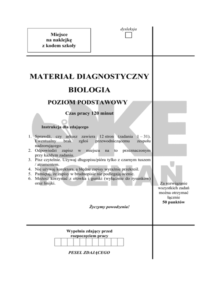 dysleksja Miejsce na naklejkę z kodem szkoły MATERIAŁ DIAGNOSTYCZNY BIOLOGIA POZIOM PODSTAWOWY Czas pracy 120 minut Instrukcja dla zdającego 1. Sprawdź, czy arkusz zawiera 12 stron (zadania 1 – 31). Ewentualny brak zgłoś przewodniczącemu zespołu nadzorującego. 2. Odpowiedzi zapisz w miejscu na to przeznaczonym przy każdym zadaniu. 3. Pisz czytelnie. Używaj długopisu/pióra tylko z czarnym tuszem / atramentem. 4. Nie używaj korektora, a błędne zapisy wyraźnie przekreśl. 5. Pamiętaj, że zapisy w brudnopisie nie podlegają ocenie. 6. Możesz korzystać z ołówka i gumki (wyłącznie do rysunków) oraz linijki. Życzymy powodzenia! Wypełnia zdający przed rozpoczęciem pracy PESEL ZDAJĄCEGO Za rozwiązanie wszystkich zadań można otrzymać łącznie 50 punktów Materiał diagnostyczny z biologii Poziom podstawowy 2 Zadanie 1. (2 pkt) Mitochondria to organelle komórkowe, w których zachodzą reakcje oddychania tlenowego. Podaj nazwę elementu budowy mitochondrium oznaczonego jako X i określ funkcję tego elementu w procesie oddychania tlenowego. ....................................................................................................................................................... ....................................................................................................................................................... Zadanie 2. (2 pkt) Na schemacie przedstawiono zależność funkcjonowania komórki organizmu człowieka od układu pokarmowego, wydalniczego oraz oddechowego. UKŁAD WYDALNICZY UKŁAD POKARMOWY 1 KOMÓRKA 2 4 3 UKŁAD ODDECHOWY Wpisz do tabeli po jednym przykładzie substancji transportowanych do i z komórki, oznaczonych na schemacie 1-4. 1 - ……………………………..…….. 2 - ………………………………….. 3 - ………………………..………….. 4 - ……………………..……..…….. Zadanie 3. (1 pkt) O efektywności i skuteczności wymiany gazowej w dużym stopniu decyduje całkowita powierzchnia wymiany gazowej płuc. U człowieka wynosi ona około 80 m2. Podaj jedną cechę budowy płuc warunkującą wielkość ich powierzchni wymiany gazowej. ....................................................................................................................................................... ....................................................................................................................................................... Materiał diagnostyczny z biologii Poziom podstawowy 3 Zadanie 4. (2 pkt) Na schemacie przedstawiono krążenie płucne w organizmie człowieka. a) Podaj nazwę naczynia krwionośnego oznaczonego X. …………………………..……… b) Określ, czy znajduje się w nim krew utlenowana czy odtlenowana. …………..………. Zadanie 5. (1 pkt) Na rysunkach przedstawiono reakcje krwinek czerwonych dawcy krwi z przeciwciałami biorcy krwi, po przeprowadzeniu transfuzji krwi. Określ, w którym przypadku (A czy B) występuje brak zgodności grup krwi między dawcą i biorcą. Podaj jeden argument uzasadniający wybór. ....................................................................................................................................................... ....................................................................................................................................................... Zadanie 6. (1 pkt) Na rysunku przedstawiono czerwone krwinki człowieka. Podaj jedną cechę budowy krwinek, która jest przyczyną ich dwuwklęsłego kształtu. ......................................................................................................... Materiał diagnostyczny z biologii Poziom podstawowy 4 Zadanie 7. (1 pkt) Krzepnięcie krwi ma znaczenie biologiczne jako mechanizm chroniący organizm przed utratą krwi. Uporządkuj wymienione procesy związane z krzepnięciem krwi zgodnie z kolejnością ich przebiegu. A. Enzymy wydostają się z uszkodzonych płytek krwi do osocza. B. Fibrynogen pod wpływem enzymów i jonów wapnia przechodzi w fibrynę. C. Uszkodzenie naczynia krwionośnego. D. Powstaje skrzep zatykający uszkodzone naczynie krwionośne. E. Fibryna wytrąca się z osocza w postaci włókienek tworzących sieć, w której oczkach unieruchamiane są erytrocyty. F. Płytki krwi (trombocyty) gromadzą się miejscu uszkodzenia naczynia krwionośnego. ………………………………………………………………………………………………. Zadanie 8. (1 pkt) Organizm człowieka ma zdolność do utrzymywania stałej temperatury ciała mimo zmieniającej się temperatury otoczenia. Spośród zdań A–E zaznacz te trzy, które opisują zmiany w organizmie człowieka w momencie odczuwania zimna. A. B. C. D. E. Rozszerzenie naczyń krwionośnych w skórze. Zwężenie naczyń krwionośnych w skórze. Pobudzenie drżenia mięśni. Pobudzenie pracy gruczołów potowych. Zahamowanie pracy gruczołów potowych. Zadanie 9. (2 pkt) Choroba nadciśnieniowa jest jedną z najczęściej spotykanych chorób układu krwionośnego. Podwyższone ciśnienie krwi powoduje większe obciążenie dla mięśnia sercowego oraz zwiększa ryzyko pęknięcia naczyń krwionośnych w mózgu. Zaproponuj dwa przykłady działań profilaktycznych, jakie mógłby podjąć 30-letni niepalący i niepijący alkoholu informatyk, którego ojciec i dziadek chorowali na nadciśnienie, aby zmniejszyć ryzyko wystąpienia objawów tej choroby. 1)................................................................................................................................................... ..................................................................................................................................................... 2)................................................................................................................................................... ...................................