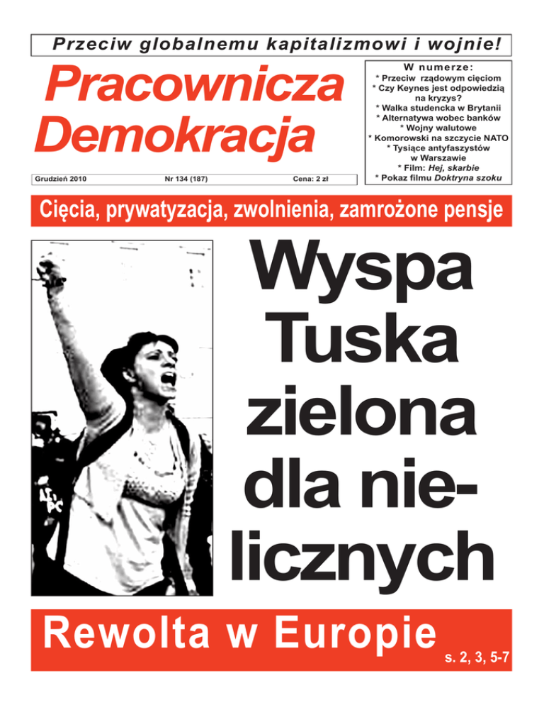 Przeciw globalnemu kapitalizmowi i wojnie! Pracownicza Demokracja Grudzień 2010 Nr 134 (187) Cena: 2 zł W num e r ze : * Przeciw rządowym cięciom * Czy Keynes jest odpowiedzią na kryzys? * Walka studencka w Brytanii * Alternatywa wobec banków * Wojny walutowe * Komorowski na szczycie NATO * Tysiące antyfaszystów w Warszawie * Film: Hej, skarbie * Pokaz filmu Doktryna szoku Cięcia, prywatyzacja, zwolnienia, zamrożone pensje Wyspa Tuska zielona dla nielicznych Rewolta w Europie s. 2, 3, 5-7 * Naszym zdaniem * Naszym zdaniem * Naszym zdaniem * Cięcia, prywatyzacja, zwolnienia, zamrożone pensje Wyspa Tuska zielona tylko dla nielicznych Wybory samorządowe Wybory samorządowe nie stanowiły dla partii sejmowych wielkiego zaskoczenia. Najbardziej zadowolone było Polskie Stronnictwo Ludowe zdobywając trzecie miejsce w wyborach do sejmików wojewódzkich i rad powiatów. Platforma się cieszy, bo PiS nie będzie miał władzy nawet w dwóch sejmikach, gdzie wygrał. Będzie tam rządzić koalicja PO, PSL i SLD. PiS obawiał się jednak, że będzie miał znaczne gorsze wyniki po odejściu grupy “Polska jest najważniejsza”. SLD jest nieco zdołowana brakiem postępu po udanej kampanii prezydenckiej Napieralskiego, ale partia ta wydaje się cieszyć, jeśli tylko nie znajduje się na samym dnie. Ważniejsze dla dzisiejszej walki jest fakt, że lewica na lewo od SLD osiągnęła pewne sukcesy. Polska Partia Pracy – “Sierpień 80“ zdobyła 6 mandatów. Młodzi Socjaliści - jeden. Zieloni 2004, którzy kandydowali z list SLD, ale są w rzeczywistości bardziej lewicowi, zdobyli pięć mandatów. Nasuwa się oczywisty wniosek z tych wyników. Czy nie byłoby lepiej, gdyby takie organizacje, które od lat biorą aktywny udział w różnych protes- Cięcia Tuska Rząd Tuska raczej nie będzie poprzestawał na istniejących cięciach. Bardzo słaba opozycja parlamentarna, zarówno jeśli chodzi o jej siłę liczebną, jak i alternatywną politykę wobec zamiarów rządu, oznacza, że tach, skupiły się pod jednym szyldem do przyszłorocznych wyborów? Pracownicza Demokracja chętnie włączyłaby się do takiej koalicji. Bronimy publicznej służby zdrowia Inicjatywa PPP – “Sierpień 80”, by wszcząć kampanię “Bronimy publicznej służby zdrowia” jest bardzo dobrym pomysłem. Taka kampania może łączyć w działaniu wielu przeciwników rządowych cięć. Dobrze byłoby, gdyby wraz z kampanią powstała szeroka koalicja jako polityczny wyraz tego sprzeciwu. Warto zauważyć, że w oświadczeniu dotyczącym kampanii czytamy: “Polska Partia Pracy – “Sierpień 80″ uważa za konieczne budowanie szerokiego przymierza antyliberalnego, które przeciwstawi się polityce prywatyzacji usług publicznych, w tym przede wszystkim ochrony zdrowia lansowanej przez Platformę Obywatelską zarówno na poziomie krajowym jak i samorządowym “. Czas więc działać. Pracownicy, studenci i inni muszą walczyć tu i teraz walka na zewnątrz parlamentu jest najważniejsza. Ta walka powinna jednak też mieć swój wyraz w przyszłorocznych wyborach parlamentarnych. Szeroka koalicja wyborcza pozaeseldowskiej lewicy - i kampania, żeby ją stworzyć - przyczyni się do wzmocnienia dzisiejszej walki. ataki Tuska prawdopodobnie zostaną wzmożone – nawet w obliczu przyszłorocznych wyborów parlamentarnych. Rząd stosuje środki, które są korzystne tylko dla jednej grupy społecznej – posiadaczy kapitału oraz szefów firm i banków, którzy decydują o dysponowaniu tym kapitałem. Stąd decyzje Dlaczego u nas nie ma masowej walki? Żyjemy w czasach raptownych zmian W obliczu masowych protestów w różnych europejskich krajach wiele osób zadaje sobie pytanie: “Dlaczego u nas nie ma takiej masowej walki?” Jednak wydarzenia w tych krajach same dają nam odpowiedź – pokazują, jak szybko sytuacja w każdym kraju może się zmienić. Pamiętamy wszyscy, jak nie tak dawno temu Platforma Obywatelska bez przerwy obiecywała budowę “drugiej Irlandii”. Było to zaledwie w 2007 roku. Irlandia była nazywana „celtyckim tygrysem”, chwalona jako jedna z najskuteczniejszych gospodarek świata i przykład dla innych do naśladowania. Receptę sukcesu irlandzkiego miała stanowić polityka, która dawała wolną rękę środowiskom biznesowym. Wprowadzono bardzo niskie podatki dla wielkich korporacji i najbogatszych obywateli, w błyskawicznym tempie rozszerzała się różnica między bogatymi a reszą społeczeństwa. Dziś Irlandia znajduje się w głębokim kryzysie. Od roku 2007 jej gospodarka skurczyła się o 20 procent. Co więcej, kryzys Irlandii nie jest ogranirządu podjęte w ostatnim czasie - i stąd mamy inną rzeczywistość niż pokazuje ludziom rządowy przekaz medialny. Ochrona zdrowia Wiele szpitali już teraz wyczerpało swoje “limity” i nie mogą przyjmować pacjentów na ważne operacje. Podajemy tylko jeden z licznych przykładów z gazety Polska - Dziennik Łódzki: “Pani Halina z Łodzi za kilka lat całkowicie straci wzrok. 70-latka już nie widzi na jedno oko. Wprawdzie istnieje lek, który mógłby uratować, a nawet częściowo przywrócić wzrok, ale taka kuracja kosztuje co najmniej sześć tysięcy złotych. Pani Halina nie ma tylu pieniędzy, a szpitalne limity na takie zabiegi dawno się wyczerpały.” Zamiast większych nakładów na ochronę zdrowia, rząd zmusza ekonomicznym szantażem zadłużone szpitale do przekształcenia się w spółki – inaczej długi nie zostaną spłacone. Już dziś w znacznym stopniu mamy dobre leczenie tylko dla zamożnych. Strategia Tuska “najpierw komercjalizacja (czyli spółki) potem prywatyzacja” - tworzy coraz gorszą sytuację dla pracowników i pacjentów służby zdrowia. 09.11.10. Demonstracja ZNP przed Sejmem. Pracownicy wyższych uczelni się radykalizują. Przemawia dr Filip Ilkowski z Uniwersytetu Warszawskiego. (Patrz s. 9) czony jedynie do granic tego państwa. Jak pisze jeden z cz
