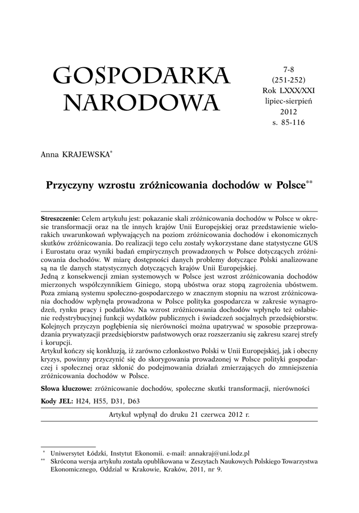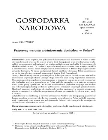 GOSPODARKA NARODOWA 7-8 (251-252) Rok LXXX/XXI lipiec-sierpień 2012 s. 85-116 Anna KRAJEWSKA* Przyczyny wzrostu zróżnicowania dochodów w Polsce** Streszczenie: Celem artykułu jest: pokazanie skali zróżnicowania dochodów w Polsce w okresie transformacji oraz na tle innych krajów Unii Europejskiej oraz przedstawienie wielorakich uwarunkowań wpływających na poziom zróżnicowania dochodów i ekonomicznych skutków zróżnicowania. Do realizacji tego celu zostały wykorzystane dane statystyczne GUS i Eurostatu oraz wyniki badań empirycznych prowadzonych w Polsce dotyczących zróżnicowania dochodów. W miarę dostępności danych problemy dotyczące Polski analizowane są na tle danych statystycznych dotyczących krajów Unii Europejskiej. Jedną z konsekwencji zmian systemowych w Polsce jest wzrost zróżnicowania dochodów mierzonych współczynnikiem Giniego, stopą ubóstwa oraz stopą zagrożenia ubóstwem. Poza zmianą systemu społeczno-gospodarczego w znacznym stopniu na wzrost zróżnicowania dochodów wpłynęła prowadzona w Polsce polityka gospodarcza w zakresie wynagrodzeń, rynku pracy i podatków. Na wzrost zróżnicowania dochodów wpłynęło też osłabienie redystrybucyjnej funkcji wydatków publicznych i świadczeń socjalnych przedsiębiorstw. Kolejnych przyczyn pogłębienia się nierówności można upatrywać w sposobie przeprowadzania prywatyzacji przedsiębiorstw państwowych oraz rozszerzaniu się zakresu szarej strefy i korupcji. Artykuł kończy się konkluzją, iż zarówno członkostwo Polski w Unii Europejskiej, jak i obecny kryzys, powinny przyczynić się do skorygowania prowadzonej w Polsce polityki gospodarczej i społecznej oraz skłonić do podejmowania działań zmierzających do zmniejszenia zróżnicowania dochodów w Polsce. Słowa kluczowe: zróżnicowanie dochodów, społeczne skutki transformacji, nierówności Kody JEL: H24, H55, D31, D63 Artykuł wpłynął do druku 21 czerwca 2012 r. * ** Uniwersytet Łódzki, Instytut Ekonomii. e-mail: [email protected] Skrócona wersja artykułu została opublikowana w Zeszytach Naukowych Polskiego Towarzystwa Ekonomicznego, Oddział w Krakowie, Kraków, 2011, nr 9. 86 GOSPODARKA NARODOWA Nr 7-8/2012 Wprowadzenie Jedną z konsekwencji zmian systemowych w Polsce jest rosnące zróżnicowanie dochodów. Przy dokonywaniu oceny efektów transformacji problem ten jest jednak z reguły pomijany. Ekonomiści podkreślają głównie pozytywne skutki urynkowienia gospodarki: wzrost gospodarczy, prywatyzację i restrukturyzację przedsiębiorstw, wzrost efektywności gospodarowania, rozwój rynku kapitałowego i sektora bankowego. Wyraźnie zauważa to Kowalik [2002, s. 55-56], podkreślając iż: „...Polską »wyobraźnię ekonomiczną« cechują dwie słabości. Jedną jest zlekceważenie problematyki podziału... konflikty i problematyka podziału były domeną zainteresowania marksizmu, a wszystko, co choćby pośrednio przypomina marksizm, jest w krajach postkomunistycznych objęte intelektualnym embargo... Drugą słabością jest traktowane jako oczywiste przekonanie, że jedną z przyczyn nieuchronnego wzrostu nierówności w Polsce jest nadmierny egalitaryzm panujący w czasach PRL”. Prawie bez zastrzeżeń przyjmowana jest teoria Kuznetsa [1989], iż wzrost nierówności jest charakterystyczną cechą początkowego okresu przeobrażeń gospodarczych i szybkiego wzrostu gospodarczego. Po pewnym czasie następuje stabilizacja, a dopiero później nierówności materialne ulegają zmniejszeniu. Nie są natomiast upowszechniane badania Banku Światowego [Denniger, Squire, 1996, s. 17], które nie potwierdzają prawa Kuznetsa oraz wskazują, że wysoki stopień nierówności ma negatywny wpływ na tempo wzrostu gospodarczego. Zróżnicowaniem dochodów i społecznymi konsekwencjami transformacji zajmują się w Polsce głównie politycy społeczni i socjologowie. Analizują oni wybrane aspekty życia, takie jak bezrobocie, ubóstwo, wykluczenie, funkcjonowanie w szarej strefie, korupcja itp. oraz zwracają uwagę na społeczne i polityczne konsekwencje tych zjawisk. Brakuje jednak w miarę kompleksowej analizy ekonomicznych przyczyn i skutków rosnącego zróżnicowania dochodów w Polsce, a także publicznej dyskusji nad drogami wyjścia z tej sytuacji i kształtem przyszłej polityki gospodarczej i społecznej. Celem artykułu jest: pokazanie skali zróżnicowania dochodów w Polsce w okresie transformacji oraz na tle innych krajów UE oraz przedstawienie wielorakich uwarunkowań wpływających na poziom zróżnicowania dochodów. Do realizacji tego celu zostały wykorzystane dane statystyczne GUS i Eurostatu oraz wyniki badań empirycznych prowadzonych w Polsce dotyczących zróżnicowania dochodów. W miarę dostępności danych problemy dotyczące Polski analizowane są na tle danych statystycznych dotyczących krajów UE. Artykuł kończy się konkluzją, iż zarówno członkostwo Polski w Unii Europejskiej, jak i obecny kryzys, powinny przyczynić się do skorygowania prowadzonej w Polsce polityki gospodarczej i społecznej oraz skłonić do podejmowania działań zmierzających do zmniejszenia zróżnicowania dochodów w Polsce. Zróżnicowanie dochodów w Polsce i innych krajach Unii Europejskiej Na przestrzeni ostatnich kilkunastu lat w całej Unii Europejskiej rośnie zróżnicowanie dochodów. W krajach Europy Zachodniej proces ten dokonuje się jednak 87 Anna Krajewska, Przyczyny wzrostu zróżnicowania dochodów w Polsce znacznie wolniej niż w transformujących się gospodarkach. Wyraźnie wskazują na to dane zamieszczone w tablicy 1 pokazujące zmiany wskaźnika Giniego między 1980 r. i 2008 r. Warto zauważyć, że wbrew ogólnie przyjętym opiniom w Polsce już u progu transformacji (1990 r.) zróżnicowanie dochodów w Polsce było względnie wysokie. Wskaźnik Giniego w Polsce (0,28) był wyższy niż w innych krajach Europy Środkowo-Wschodniej i niż w niektórych krajach 