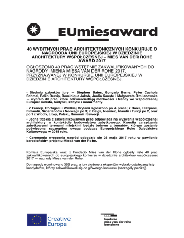 40 WYBITNYCH PRAC ARCHITEKTONICZNYCH KONKURUJE O NAGROODA UNII EUROPEJSKIEJ W DZIEDZINIE ARCHITEKTURY WSPÓŁCZESNEJ – MIES VAN DER ROHE AWARD 2017 OGŁOSZONO 40 PRAC WSTĘPNIE ZAKWALIFIKOWANYCH DO NAGRODY IMIENIA MIESA VAN DER ROHE 2017, PRZYZNAWANEJ W KONKURSIE UNII EUROPEJSKIEJ W DZIEDZINIE ARCHITEKTURY WSPÓŁCZESNEJ. • Siedmiu członków jury — Stephen Bates, Gonçalo Byrne, Peter Cachola Schmal, Pelin Derviş, Dominique Jakob, Juulia Kauste i Małgorzata Omilanowska — wybrało 40 prac, które odzwierciedlają możliwości i trendy we współczesnej Europie: miasta, budynki, zabytki i monumenty. • Z Francji, Portugalii i Wielkiej Brytanii zgłoszono po 4 prace; z Danii, Hiszpanii, Finlandii, Niderlandów i Norwegii po 3; z Belgii, Niemiec, Irlandii i Turcji po 2, oraz po 1 z Włoch, Litwy, Polski, Rumunii i Szwecji. • Jedna trzecia z zakwalifikowanych prac odpowiada na wyzwania współczesnej architektury w kontekście budownictwa zabytkowego. Kwestia zarządzania zabytkowymi terenami miejskimi będzie jednym z tematów, którym zostanie poświęcona szczególna uwaga podczas Europejskiego Roku Dziedzictwa Kulturowego w 2018 roku. • Ceremonia wręczenia nagród odbędzie się 26 maja 2017 roku w pawilonie barcelońskim projektu Miesa van der Rohe. Komisja Europejska wraz z Fundació Mies van der Rohe ogłosiły listę 40 prac zakwalifikowanych do europejskiego konkursu w dziedzinie architektury współczesnej 2017 — nagrody Miesa van der Rohe. Do nagrody nominowano 355 prac, a jury złożone z ekspertów wybrało ostateczną listę kandydatów, którzy zakwalifikowali się do głównego konkursu (szczegóły poniżej). Do 40 zakwalifikowanych prac należą: Bruksela, Belgia Spa, Belgia Lubeka, Niemcy Fergitz, Niemcy Ribe, Dania Kopenhaga, Dania Skjern, Dania Madryt, Hiszpania Granollers, Hiszpania Barcelona, Hiszpania Espoo, Finlandia Espoo, Finlandia Jyväskylä, Finlandia Poigny-la-Forêt, Francja Miluza, Górny Ren, Francja Rivesaltes, Francja Nicea, Francja Dublin, Irlandia Dublin, Irlandia Mediolan, Włochy Wilno, Litwa Nieuw-Bergen, Niderlandy Rotterdam, Niderlandy Amsterdam, Niderlandy Herøy, Norwegia Trondheim, Norwegia Averøy, Norwegia Warszawa, Polska Oeiras, Portugalia Lizbona, Portugalia Lizbona, Portugalia Chaves, Portugalia Góry Fogaraskie, Rumunia Sztokholm, Szwecja Bademli, Dikili, Izmir, Turcja Stambuł, Turcja NAVEZ - 5 social units as Northern entrance of Brussels Polyvalent Infrastructure European Hansemuseum Barn Kannikegården Kvæsthus Pier Skjern River Pump Stations Museum of the Royal Collections House 1014 Collective housing for elderly people and civic and health centre Suvela Chapel Opinmäki School Puukuokka Housing Block (house 1) Community Workshop 59 Dwellings, Neppert Gardens Social Housing THE RIVESALTES MEMORIAL MUSEUM Ariane futsal sports complex Model School Inchicore Merrion Cricket Pavilion Fondazione Prada Rasu Houses Landmark Nieuw-Bergen Timmerhuis deFlat Kleiburg Weekend House at Sildegarnsholmen Moholt 50I50 - Timber Towers Eldhusøya Tourist Route Project Katyn Museum House in Oeiras Museum of Art, Architecture and Technology EDP Headquarters Nadir Afonso Museum for Contemporary Art Take a(l)titude Östermalm's Temporary Market Hall Angelos Organic Olive Oil Mill Beyazıt State Library Renovation Londyn, Wielka Brytania Londyn, Wielka Brytania Londyn, Wielka Brytania Liverpool, Wielka Brytania Holmes Road Studios Shepherdess Walk Housing Ely Court Granby Four Streets Więcej informacji o tych pracach znajdziesz na tej stronie: http://miesarch.com/archive?editions=16&classification=2 W skład jury wchodzą: Stephen Bates, przewodniczący jury, architekt, urodzony w 1964 r. Dyrektor Sergios Bates architects, Londyn – Zurych Gonçalo Byrne, architekt, urodzony w 1941 r. Dyrektor Gonçalo Byrne Arquitectos Peter Cachola Schmal, architekt, urodzony w 1960 r. Dyrektor Muzeum Architektury Niemieckiej (DAM) we Frankfurcie nad Menem Pelin Derviş, architekt, urodzona w 1967 r. Niezależny pracownik naukowy, redaktor i kustosz Dominique Jakob, architekt, urodzony w 1966 r. Dyrektor Jakob+MacFarlane Juulia Kauste, socjolog, urodzona w 1967 r. Dyrektor Muzeum Architektury Fińskiej w Helsinkach Małgorzata Omilanowska, historyk sztuki i polityk, urodzona w 1960 r. Profesor Uniwersytetu Gdańskiego Więcej informacji o członkach jury znajdziesz na tej stronie: http://miesarch.com/edition/2017/jury W ostatnich latach znacząco wzrósł udział nowo powstałych biur architektonicznych oraz młodych architektów w wielkich projektach. Jedna czwarta zakwalifikowanych projektów została wybudowana przez zespoły architektów w wieku poniżej 40 lat lub przez biura architektoniczne liczące mniej niż 10 lat. Spośród 40 prac 24 (60%) zostało wybudowanych w centrach miast, 9 w środowisku naturalnym (23%), a 7 na peryferiach miast (17%). 4 projekty znajdują się we Francji (Poigny-la-Foret, Mulhouse, Haut-Rhin, Rivesaltes i Nicei); 4 w Portugalii (2 w Lizbonie, 1 w Chaves i 1 w Oeiras); 4 w Wielkiej Brytanii (3 w Londynie i 1 w Liverpoolu); 3 w Dania (Ribe, Skjern a Kopenhaga); 3 w Hiszpanii (Barcelona, Madryt i Granollers); 3 w Finlandia (2 w Espoo i 1 w Jyväskylä); 3 w Holandia (Amsterdam, Rotterdam i Nieuw-Bergen) oraz 3 w Norwegii (Averoy, Herøy i Trondheim); 2 w Belgii (Schaarbeek i SPA); 2 w Niemcy (Lübeck i Fergitz); 2 w Irlandia (Dublin) i 2 w Turcji (Istanbul i Bademli). 1 we Włoszech (Mediolan), 1 na Litwie (Wilno), 1 w Polsce (Warszawa), 1 w Rumunii (Góry Fogaraskie) i 1 w Szwecji (Sztokholm). Miasta, z których pochodzi najwięcej prac, to: Londyn (3), Lizbona (2), Dublin (2) i Espoo (2). „Chciałbym, aby zakwalifikowane prace wykazywały zainteresowanie w kierunku tworzenia przestrzeni, badania konwencjonalnych i znanych typologii, czerpania radości z codziennego użytkowania poprzez przykładanie uwagi do szczegółów oraz milczący opór w stosunku do aktualnej tendencji dążącej do architektury autorefer