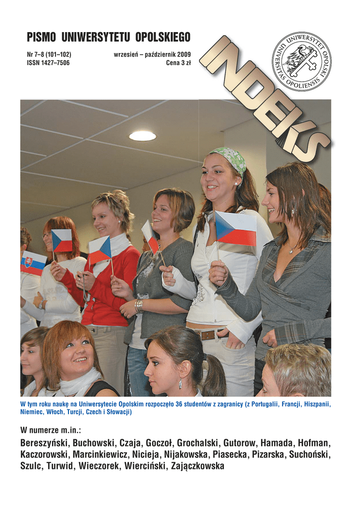 PISMO UNIWERSYTETU OPOLSKIEGO Nr 7–8 (101–102) ISSN 1427–7506 wrzesień – październik 2009 Cena 3 z³ W tym roku naukę na Uniwersytecie Opolskim rozpoczęło 36 studentów z zagranicy (z Portugalii, Francji, Hiszpanii, Niemiec, Włoch, Turcji, Czech i Słowacji) W numerze m.in.: Bereszyński, Buchowski, Czaja, Goczoł, Grochalski, Gutorow, Hamada, Hofman, Kaczorowski, Marcinkiewicz, Nicieja, Nijakowska, Piasecka, Pizarska, Suchoński, Szulc, Turwid, Wieczorek, Wierciński, Zajączkowska 2 INDEKS nr 7–8 (101–102) Spis treści Kronika uniwersytecka ............................................................... 3 Inauguracja roku akademickiego 2009–2010 ........................... 10 Sprostamy społecznej misji uniwersytetu (wystąpienie rektor UO prof. Krystyny Czai podczas inauguracji) ............. 14 Prof. Stanisław S. Nicieja Opolaninem 20-lecia ........................ 20 Rekrutacja 2009 ....................................................................... 20 Ks. prof. Andrzej Czaja biskupem diecezjalnym........................ 23 Abp Alfons Nossol – świetny uczeń Demostenesa (Stanisław S. Nicieja) ........................................................... 24 Wiersze Jana Goczoła .............................................................. 28 Poezja jako urwany ślad (wykład inauguracyjny dra hab. Jacka Gutorowa) .................................................... 30 Żeby obcy stał się bliski (rozmowa z dr hab. Lilianą Piasecką) .............................................................................. 33 Dzień, w którym skończyło się babie lato (wiersz Pawła Marcinkiewicza) ............................................. 35 Samba (wiersz Roberta Pinsky’ego w tłum. Pawła Marcinkiewicza) ................................................................... 36 Plotka jest stara jak świat (Janina Hajduk-Nijakowska) ............ 37 Piosenka dla Pawła Kukiza (wiersz Mariana Buchowskiego)..................................................................... 41 Ogień w mieście (Urszula Zajączkowska) ................................. 42 Opolskie chronogramy (Andrzej Hamada)................................ 47 Zagadkowa kamienica (Krzysztof Kołwzan) .............................. 50 Dokopać się do prawdy (Magdalena Przysiężna-Pizarska) ....... 51 Chora polityka (Włodzimierz Kaczorowski) .............................. 54 Polityczne przepowiednie Jana Pawła II (Adam Suchoński) ..... 58 Instytut Śląski w Opolu w dokumentach SB (Zbigniew Bereszyński) ........................................................ 60 Studia – czas chmurny, durny, najlepszy (Krystyna Turwid) .... 66 Kącik dla wolnych chwil ........................................................... 70 Śląski selfmademan (Stanisław S. Nicieja) ............................... 71 Za szybkie pisanie – 8 (Adam Wierciński) ................................ 74 Miniatury na niepogodę (Małgorzata Andrzejak-Nowara) ......... 77 Świat starych fotografii: Uniwersytet w Getyndze (Halina Nicieja) ..................................................................... 78 Dwa jubileusze (Wita Szulc) ..................................................... 80 Jerzy Giedroyc w odsłonach Magdaleny Grochowskiej (Iwona Hofman) ................................................................... 82 Opolskie święto nauki – po raz siódmy (Piotr P. Wieczorek, A. Poliwoda) ......................................................................... 84 Zakupy w Opolu, portfel w Strasburgu (rozmowa z dr inż. Kariną Bedrunką) .................................................... 87 Z wizytą w Biełgorodzie (Piotr P. Wieczorek) ........................... 89 Odeszli: prof. dr hab. Teresa Borowska (Zenon Jasiński)......... 91 Opolskie Dni Kresowe (Jerzy Duda) ......................................... 93 Gerontopedagodzy promują swoją specjalność (Patrycja Kniejska) ............................................................... 96 Opolski Chór Kameralny na festiwalu im. I. Reimanna (Marian Biliński) ................................................................... 98 Germanistyka opolska w regionie i dla regionu (Gabriela Jelitto-Piechulik) ................................................... 99 Zbigniew Bujak gościem studentów historii (Barbara Kubis) ... 99 Mobilność studentów jedną z form współczesnego studiowania (Stefan M. Grochalski, Piotr P. Wieczorek)..... 100 Z prac Senatu UO ................................................................... 105 Nauczycielskie czasopisma na Opolszczyźnie (Jerzy Duda) ... 109 Nowości wydawnicze ............................................................. 112 Na dziedzińcu Collegium Maius UO staraniem kustosza Collegium Maius prof. dra hab. Stanisława S. Nicieji pojawił się kolejny pomnik – tym razem obelisk. Upamiętnia on śmierć starosty Hildebrandta, który (według legendy) podczas polowania w lesie k. Jastrzębia pod Namysłowem został śmiertelnie raniony przez dzika. Było to w styczniu 1819 r. Żona starosty zmarła kilka miesięcy po nim. Na froncie obelisku widnieje płaskorzeźba, która przedstawia dwa anioły otoczone wężem pożerającym swój ogon, co symbolizuje nieskończoność, nieśmiertelność. Poniżej płaskorzeźby wykuto inskrypcję, której tłumaczenia podjął się opolski poeta Jan Goczoł: Ich zysk dla jednych – Ich strata dla drugich – I szala żadna nie przeważa! (ad) Indeks. Pismo UO Wydawca: Uniwersytet Opolski, 45-040 Opole, pl. Kopernika 11, Collegium Maius, pok. 217, tel. 775416017, e-mail: [email protected], www.indeks.uni.opole.pl Zespół redakcyjny: Barbara Stankiewicz-Buchowska (redaktor naczelna), Anna Drobina-Sawicka. Zdjęcia: Jerzy Mokrzycki, Tadeusz Parcej. Opieka merytoryczna: prof. Stanisław S. Nicieja Fotografia na okładce: Tadeusz Parcej, Skład komputerowy: Henryk Kobiela, Druk: Drukarnia Cyfrowa TOTEM 3 wrzesień–październik 2009 Kronika uniwersytecka ■ 26 maja. Rek