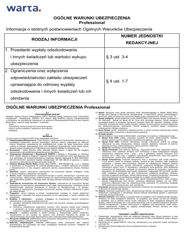 OGÓLNE WARUNKI UBEZPIECZENIA Professional Informacja o istotnych postanowieniach Ogólnych Warunków Ubezpieczenia NUMER JEDNOSTKI RODZAJ INFORMACJI REDAKCYJNEJ 1. Przesłanki wypłaty odszkodowania i innych świadczeń lub wartości wykupu § 3 ust. 3-4 ubezpieczenia 2. Ograniczenia oraz wyłączenia odpowiedzialności zakładu ubezpieczeń § 4 ust. 1-7 uprawniające do odmowy wypłaty odszkodowania i innych świadczeń lub ich obniżenia OGÓLNE WARUNKI UBEZPIECZENIA Professional §1 POSTANOWIENIA OGÓLNE Niniejsze Ogólne Warunki Ubezpieczenia (OWU) określają zasady udzielania przez Towarzystwo Ubezpieczeń i Reasekuracji „WARTA” S.A. (zwane dalej WARTA) ochrony ubezpieczeniowej w odniesieniu do przedmiotów zakupionych na terytorium Rzeczpospolitej Polskiej w sieci sklepów Media Markt, zwanych dalej „Sprzętem”, w zakresie: awarii, uszkodzenia mechanicznego lub zniszczenia sprzętu, utraty w wyniku kradzieży z włamaniem oraz rabunku, przepięcia. §2 DEFINICJE Terminy użyte w niniejszych OWU mają następujące znaczenie: 1) Ubezpieczający/Ubezpieczony: osoba fizyczna, osoba prawna lub jednostka organizacyjna nie posiadająca osobowości prawnej, posiadająca zdolność prawną wykonująca we własnym imieniu działalność gospodarczą (za przedsiębiorców uznaje się także wspólników spółki cywilnej w zakresie wykonywanej przez nich działalności gospodarczej), która nabyła Sprzęt, zawarła umowę ubezpieczenia Professional oraz zapłaciła składkę za ubezpieczenie. 2) Konsument - osoba fizyczna, która dokonała zakupu towaru, a zakup nie był związany bezpośrednio z jej działalnością gospodarczą lub zawodową, 3) Towarzystwo Ubezpieczeń i Reasekuracji WARTA z siedzibą w Warszawie, ul. Chmielna 85/87, Spółka wpisana w Krajowym rejestrze Sądowym prowadzonym przez Sąd Rejonowy dla m.st. Warszawy, XII Wydział Gospodarczy Krajowego Rejestru Sądowego Nr KRS 000016432, NIP 521-04-20-047, wysokość kapitału zakładowego 187 938 580,00 zł opłacony w całości, oznaczony w dokumencie ubezpieczenia jako Warta G+. 4) Centrum Obsługi Klienta Warty (zwane dalej COKW) – SPB POLSKA Sp. z o.o. z siedzibą w Warszawie, ul. Grzybowska 45, podmiot współpracujący z WARTA wskazany do kontaktu z Ubezpieczonymi w celu przyjęcia zgłoszenia szkody, przeprowadzenia procesu likwidacji szkody. 5) Zdarzenie: awaria, uszkodzenie mechaniczne lub zniszczenie Sprzętu, przepięcie, utrata w wyniku kradzieży z włamaniem lub rabunku. 6) Awaria: nagłe i nieprzewidziane uszkodzenie Sprzętu w wyniku wewnętrznych czynników typu mechanicznego, elektrycznego, elektronicznego lub elektromechanicznego powstałe podczas jego użytkowania zgodnie z instrukcją, które wymaga naprawy uszkodzonych części lub całego Sprzętu. 7) Uszkodzenie mechaniczne lub zniszczenie Sprzętu: uszkodzenie lub zniszczenie Sprzętu (zewnętrzne lub wewnętrzne) spowodowane przez nagłe, nieprzewidywalne i niezależne od woli Ubezpieczonego zdarzenie zewnętrzne, w stosunku do Ubezpieczonego i do Sprzętu, niemożliwe do zapobieżenia, powodujące konieczność naprawy, wymiany uszkodzonych części lub całego Sprzętu. 8) Przepięcie: wzrost napięcia w liniach energetycznych powstały na skutek wyładowań elektrycznych z atmosfery lub spięcia przewodów na linii przesyłowej, w wyniku działania siły zewnętrznej. 9) Kradzież z włamaniem – działanie polegające na bezprawnym zaborze przedmiotu ubezpieczenia w celu jego przywłaszczenia po: a) usunięciu istniejących zabezpieczeń przy użyciu siły fizycznej, narzędzi, pozostawiającym ślady włamania, b) otworzeniu zabezpieczeń oryginalnym kluczem, który sprawca zdobył przez kradzież z włamaniem do innego pomieszczenia zabezpieczonego lub w wyniku rabunku, o ile otwarcie to nastąpiło niezwłocznie po zdobyciu kluczy w sposób opisany powyżej. 10) Rabunek – działanie powstałe w wyniku rozboju, tj. bezprawnego zaboru przedmiotu ubezpieczenia w ten sposób, że sprawca użył przemocy fizycznej lub groźby jej natychmiastowego użycia bądź doprowadził do stanu nieprzytomności bądź bezbronności. 11) Akcesoria dodatkowe: zdefiniowane przez producenta doposażenie nie stanowiące kompletu eksploatacyjnego z ubezpieczonym Sprzętem. 12) Materiały eksploatacyjne: materiały zdefiniowane przez producenta jako materiał eksploatacyjny lub zużywająca się część, podlegająca okresowej wymianie, niezbędne do funkcjonowania Sprzętu. 13) Sprzęt: fabrycznie nowy sprzęt zakupiony przez Ubezpieczającego w sklepie Media Markt, którego dane figurują w dokumencie ubezpieczenia i w dokumencie zakupu potwierdzającym dokonanie opłaty za sprzęt oraz uiszczenie składki za jego ubezpieczenie, określony w pkt 16. 14) Sprzęt zastępczy: sprzęt dostarczony przez WARTA jeżeli czas naprawy sprzętu przekracza 5 dni roboczych , jednak nie dłużej niż do 10-go dnia roboczego naprawy. Sprzęt zastępczy przysługuje jedynie w przypadku wybranych sprzętów takich jak: telewizor, drukarka, pralka, zmywarka, suszarka do ubrań, pralko-suszarka, lodówka, kuchnia gazowa, kuchnia elektryczna lub elektryczno-gazowa, zamrażarka. Sprzęt zastępczy posiadać będzie podstawowe funkcjonalności danego urządzenia. 15) Nowy Sprzęt: sprzęt dostarczony Ubezpieczonemu w wyniku wymiany zakupionego sprzętu dokonanego przez producenta w okresie trwania gwarancji. 16) Rodzaje sprzętu: Sprzęt dostępny w sieci sklepów Media Markt, zawierający się w jednej z następujących grup: a) Sprzęt duże AGD: pralka, zmywarka, suszarka do ubrań, pralko-suszarka, lodówka, kuchnia gazowa, kuchnia elektryczna lub elektryczno-gazowa, zamrażarka, itp. b) Sprzęt małe AGD: kuchenki mikrofalowe, wyciągi, odkurzacze, polerki do podłogi, odkurzacze na parę, klimatyzatory, żelazka, suszarki, depilatory, maszynki do golenia, ekspresy do kawy, czajniki elektryczne, roboty kuchenne, tostery itp. c) Sprzęt TV: wszelkiego rodzaju tel