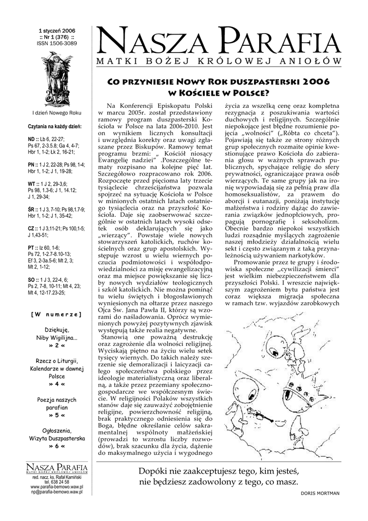 1 styczeń 2006 :: Nr 1 (376) :: ISSN 1506-3089 Co przyniesie Nowy Rok duszpasterski 2006 w Kościele w Polsce? I dzień Nowego Roku Czytania na każdy dzień: ND :: Lb 6, 22-27; Ps 67, 2-3.5.8; Ga 4, 4-7; Hbr 1, 1-2; Łk 2, 16-21; PN :: 1 J 2, 22-28; Ps 98, 1-4; Hbr 1, 1-2; J 1, 19-28; WT :: 1 J 2, 29-3,6; Ps 98, 1.3-6; J 1, 14.12; J 1, 29-34; ŚR :: 1 J 3, 7-10; Ps 98,1.7-9; Hbr 1, 1-2; J 1, 35-42; CZ :: 1 J 3,11-21; Ps 100,1-5; J 1,43-51; PT :: Iz 60, 1-6; Ps 72, 1-2.7-8.10-13; Ef 3, 2-3a.5-6; Mt 2, 3; Mt 2, 1-12; SO :: 1 J 3, 22-4, 6; Ps 2, 7-8, 10-11; Mt 4, 23; Mt 4, 12-17.23-25; [W numerze] Dziękuję, Niby Wigilijna... » 2 « Rzecz o Liturgii, Kalendarze w dawnej Polsce » 4 « Poezja naszych parafian » 5 « Ogłoszenia, Wizyta Duszpasterska » 6 « red. nacz. ks. Rafał Kamiński tel. 638 24 58 www.parafia-bemowo.waw.pl [email protected] Na Konferencji Episkopatu Polski w marcu 2005r. został przedstawiony ramowy program duszpasterski Ko‐ ścioła w Polsce na lata 2006‐2010. Jest on wynikiem licznych konsultacji i uwzględnia korekty oraz uwagi zgła‐ szane przez Biskupów. Ramowy temat programu brzmi: „ Kościół niosący Ewangelię nadziei” .Poszczególne te‐ maty rozpisano na kolejne pięć lat. Szczegółowo rozpracowano rok 2006. Rozpoczęte przed pięcioma laty trzecie tysiąclecie chrześcijaństwa pozwala spojrzeć na sytuację Kościoła w Polsce w minionych ostatnich latach ostatnie‐ go tysiąclecia oraz na przyszłość Ko‐ ścioła. Daje się zaobserwować szcze‐ gólnie w ostatnich latach wysoki odse‐ tek osób deklarujących się jako „wierzący”. Powstaje wiele nowych stowarzyszeń katolickich, ruchów ko‐ ścielnych oraz grup apostolskich. Wy‐ stępuje wzrost u wielu wiernych po‐ czucia podmiotowości i współodpo‐ wiedzialności za misję ewangelizacyjną oraz ma miejsce powiększanie się licz‐ by nowych wydziałów teologicznych i szkół katolickich. Nie można pominąć tu wielu świętych i błogosławionych wyniesionych na ołtarze przez naszego Ojca Św. Jana Pawła II, którzy są wzo‐ rami do naśladowania. Oprócz wymie‐ nionych powyżej pozytywnych zjawisk występują także realia negatywne. Stanowią one poważną destrukcję oraz zagrożenie dla wolności religijnej. Wyciskają piętno na życiu wielu setek tysięcy wiernych. Do takich należy sze‐ rzenie się demoralizacji i laicyzacji ca‐ łego społeczeństwa polskiego przez ideologie materialistyczną oraz liberal‐ ną, a także przez przemiany społeczno‐ gospodarcze we współczesnym świe‐ cie. W religijności Polaków wszystkich stanów daje się zauważyć zobojętnienie religijne, powierzchowność religijną, brak praktycznego odniesienia się do Boga, błędne określanie celów sakra‐ mentalnej wspólnoty małżeńskiej (prowadzi to wzrostu liczby rozwo‐ dów), brak szacunku dla życia, dążenie do maksymalnego użycia i wygodnego życia za wszelką cenę oraz kompletna rezygnacja z poszukiwania wartości duchowych i religijnych. Szczególnie niepokojące jest błędne rozumienie po‐ jęcia „wolności” („Róbta co chceta”). Pojawiają się także ze strony różnych grup społecznych rozmaite opinie kwe‐ stionujące prawo Kościoła do zabiera‐ nia głosu w ważnych sprawach pu‐ blicznych, spychające religię do sfery prywatności, ograniczające prawa osób wierzących. Te same grupy jak na iro‐ nię wypowiadają się za pełnią praw dla homoseksualistów, za prawem do aborcji i eutanazji, poniżają instytucję małżeństwa i rodziny dążąc do zawie‐ rania związków jednopłciowych, pro‐ pagują pornografię i seksoholizm. Obecnie bardzo niepokoi wszystkich ludzi rozsądnie myślących zagrożenie naszej młodzieży działalnością wielu sekt i często związanym z taką przyna‐ leżnością używaniem narkotyków. Promowanie przez te grupy i środo‐ wiska społeczne ,,cywilizacji śmierci” jest wielkim niebezpieczeństwem dla przyszłości Polski. I wreszcie najwięk‐ szym zagrożeniem bytu państwa jest coraz większa migracja społeczna w ramach tzw. wyjazdów zarobkowych Dopóki nie zaakceptujesz tego, kim jesteś, nie będziesz zadowolony z tego, co masz. DORIS MORTMAN 2 do Europy Zachodniej wielu naj‐ zdolniejszych naszych Rodaków. Program duszpasterski na 2006 r. ma za zadanie rozpo‐ wszechniać i realizować hasło: „Przywracajmy nadzieję ubo‐ gim” w sensie zarówno material‐ nym jak też i duchowym. Słowa Chrystusa: „Wszystko co uczyni‐ liście jednemu z tych braci mo‐ ich najmniejszych Mnieście uczynili” ( Mt 25,40 ) są najlep‐ szą wskazówką oraz zachętą na drodze naszej aktywności dusz‐ pasterskiej i ewangelizacyjnej na rzecz ubogich w 2006 roku. Dziękuję Kiedyś usłyszałem, że każdą spowiedź warto zaczynać od dziękczynienia za to, co zdarzyło się dobrego. Myśl tą chciałbym przenieść na początek Nowego Roku ‐ warto rozpocząć nowy rok dziękczynieniem… Mówi się, górnolotnie czasem, że odejście starego roku to czas refleksji, czas dobrych postano‐ wień, podejmowania nowych de‐ cyzji. Owszem. Ale uważam, że powinien być to przede wszyst‐ kim czas, w którym podziękujesz Bogu za miniony rok. Podzięku‐ jesz szczerze, w cichości. I nie ważne, że wielu (może nawet ty) uważa ten rok za stracony, prze‐ grany i pełen porażek. Pamiętasz mocne i mądre słowa świętego Pawła z Pierwszego Listu do Te‐ saloniczan: „W każdym położe‐ niu dziękujcie”? A przecież masz za co dziękować… Chodzi o to, by w chwili spoko‐ ju, przed rozpoczęciem kolejnego etapu życia, uświadomić sobie cią‐ głą obecność Boga przy mnie ‐ nie‐ widoczną, a przez to cichą i pomija‐ ną. I Jego ogromną hojność i łaska‐ wość i troskliwość, z jaką mną się zajmuje. Nie mogę być przecież nie‐ wdzięczny. Nikt nie lubi nie‐ wdzięcznych ludzi. Chodzi o to, bym dostrzegł szczegóły ‐ c