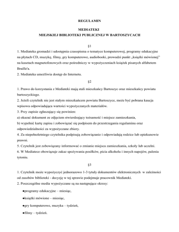REGULAMIN MEDIATEKI MIEJSKIEJ BIBLIOTEKI PUBLICZNEJ W BARTOSZYCACH §1 1. Mediateka gromadzi i udostępnia czasopisma o tematyce komputerowej, programy edukacyjne na płytach CD, muzykę, filmy, gry komputerowe, audiobooki, prowadzi punkt „książki mówionej” na kasetach magnetofonowych oraz pośredniczy w wypożyczeniach książek pisanych alfabetem Braille'a. 2. Mediateka umożliwia dostęp do Internetu. §2 1. Prawo do korzystania z Mediateki mają stali mieszkańcy Bartoszyc oraz mieszkańcy powiatu bartoszyckiego. 2. Jeżeli czytelnik nie jest stałym mieszkańcem powiatu Bartoszyce, może być pobrana kaucja wpisowa odpowiadająca wartości wypożyczanych materiałów. 3. Przy zapisie zgłaszający się powinien: a) okazać dokument ze zdjęciem stwierdzający tożsamość i miejsce zamieszkania, b) wypełnić kartę zapisu i zobowiązać się podpisem do przestrzegania regulaminu oraz odpowiedzialności za wypożyczane zbiory. 4. Za niepełnoletniego czytelnika podpisują zobowiązanie i odpowiadają rodzice lub opiekunowie prawni. 5. Czytelnik jest zobowiązany informować o zmianie miejsca zamieszkania, szkoły lub uczelni. 6. W Mediatece obowiązuje zakaz spożywania posiłków, picia alkoholu i innych napojów, palenia tytoniu. §3 1. Czytelnik może wypożyczyć jednorazowo 1-3 tytuły dokumentów elektronicznych w zależności od zasobów biblioteki - decyzję w tej sprawie podejmuje pracownik Mediateki. 2. Poszczególne media wypożyczane są na następujące okresy: programy książki gry edukacyjne – miesiąc, mówione – miesiąc, komputerowe, muzyka – tydzień, filmy – tydzień. 3. Bibliotekarz może skrócić okres wypożyczenia mediów, na które istnieje duże zapotrzebowanie czytelników. Na prośbę czytelnika jest możliwe przedłużenie terminu zwrotu materiałów, o ile nie ma na nie dużego zapotrzebowania. 5. Czytelnik może wypożyczać media dla innej osoby - tylko za jej pisemnym upoważnieniem. 6. Po wejściu do biblioteki czytelnik powinien zgłosić się do bibliotekarza, podać swe nazwisko, zwrócić wypożyczone materiały. §4 1. Czytelnik ma prawo korzystać z komputera samodzielnie lub z pomocą bibliotekarza. 2. Udostępnianie komputera poprzedzone jest dokonanym przez bibliotekarza wpisem użytkownika do rejestru czytelników na podstawie dokumentu tożsamości (wpis obejmuje: imię i nazwisko, miejsce zamieszkania, nr telefonu). 3. Przy stanowisku komputerowym może znajdować się 1osoba (w wyjątkowych sytuacjach, za zgodą bibliotekarza 2 osoby). Komputer może być użytkowany przez 1 godzinę. Dopuszczalne jest dłuższe korzystanie z komputera, o ile nie ma innych chętnych osób. 4. Wszelkie uszkodzenia lub nieprawidłowości w pracy komputera należy zgłaszać bibliotekarzowi. 5.Korzystanie z Internetu dozwolone jest do celów naukowych, edukacyjnych, dydaktycznych. Zabrania się przeglądania stron uznanych przez ogół za przekazujące treści szkodliwe. 6. Pracownicy biblioteki mają prawo kontrolować czynności wykonywane przez użytkownika przy komputerze. 7. Zabrania się: - działania na szkodę innych Użytkowników lub Operatorów sieci z komputerów znajdujących się w Mediatece, - samodzielnej konfiguracji stacji roboczych i kasowania danych, - instalowania oprogramowania bez zgody bibliotekarza, - drukowania z własnych nośników elektronicznych (płyt, dyskietek, pendrive itp.) bez uprzedniego uzgodnienia z pracownikiem Mediateki, - nagrywania bądź kopiowania muzyki lub filmów. 8. W razie nieprzestrzegania zasad wyszczególnionych w § 4 pkt 7, bibliotekarz ma prawo poprosić użytkownika o opuszczenie stanowiska komputerowego. 9. Koszty korzystania z usług komputerowych reguluje cennik Mediateki, stanowiący załącznik do niniejszego regulaminu. §5 1. Bibliotekarz udziela informacji o zbiorach, pomaga w ich doborze oraz korzystaniu z internetu, itp. 2. Czytelnik jest zobowiązany do poszanowania zbiorów będących własnością społeczną. Powinien też zwrócić uwagę na stan nośnika przed jego wypożyczeniem. Zauważone uszkodzenia należy zgłosić bibliotekarzowi. 3. Za szkody wynikłe z zagubienia lub zniszczenia nośnika odpowiada czytelnik; a) w wypadku zagubienia lub zniszczenia nośnika czytelnik zobowiązuje się do odkupienia tego samego tytułu, b) może odkupić inny - przydatny bibliotece tytuł (po uzgodnieniu z bibliotekarzem). §6 1. Za przetrzymywanie zbiorów ponad termin określony w § 3 pkt 2 biblioteka pobiera opłaty. 2. Czytelnik pokrywa koszty wysłanych upomnień oraz rozmów telefonicznych dotyczących zwrotu wypożyczonych materiałów. 3. Jeżeli czytelnik, mimo upomnień wysyłanych przez bibliotekę, odmawia zwrotu zbiorów lub uiszczenia należnych opłat, biblioteka dochodzi swych roszczeń zgodnie z przepisami prawa. §7 W Mediatece obowiązuje zachowanie porządku. Bibliotekarz może odmówić obsługi czytelnika będącego w stanie wskazującym na spożycie alkoholu, środków odurzających, zachowującego się głośno i agresywnie oraz nie przestrzegającego podstawowych zasad higieny. §8 Wszelkie uwagi dotyczące funkcjonowania Mediateki czytelnicy mogą wpisywać do „Zeszytu skarg i wniosków”. §9 Czytelnik nie stosujący się do przepisów niniejszego Regulaminu może czasowo, a w szczególnie drastycznych przypadkach na stałe, być pozbawiony prawa do korzystania z Mediateki. Decyzję w tej sprawie podejmuje pracownik Mediateki. Czytelnikowi przysługuje prawo odwołania się do dyrektora Miejskiej Biblioteki Publicznej w Bartoszycach.