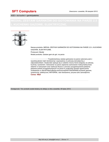 SFT Computers Utworzono: czwartek, 09 sierpień 2012 AGD > do kuchni > garnki/patelnie MEDIAL ZESTAW GARNKÓW DO GOTOWANIA NA PARZE 2,5 L KUCHENKI GAZOWE, ELEKTRYCZNE, Nazwa produktu: MEDIAL ZESTAW GARNKÓW DO GOTOWANIA NA PARZE 2,5 L KUCHENKI GAZOWE, ELEKTRYCZNE, Producent: Medial Model produktu: Zestaw garn.do got. na parze Trzyelementowy zestaw gotowana na parze wykonany jest z wysokiej jakości stali nierdzewnej i wyposażony w pokrywę żaroodporną z odpowietrznikiem. Doskonale wpisuje się w ostatnio mocny trend związany ze zdrową kuchnią i żywieniem. Gotowanie na parze zapewnia zachowanie maksymalnej ilości witamin w warzywach oraz wyklucza tłuszcz z procesu przygotowywania jedzenia. jedzenie potraw przygotowywanych na parze to znakomity sposób ograniczenia cholestreolu w diecie!!!Specyfikacja technicznaZASTOSOWANIE:kuchenki gazowe, ceramiczne, elektryczne, MATERIAŁ: stal nierdzewna, porywa szko żaroodporne Cena: 48zł Dostępność: Ten produkt został dodany do sklepu w dniu czwartek, 05 lipiec 2012 http://sft.net.pl | [email protected] | | Strona 1/1