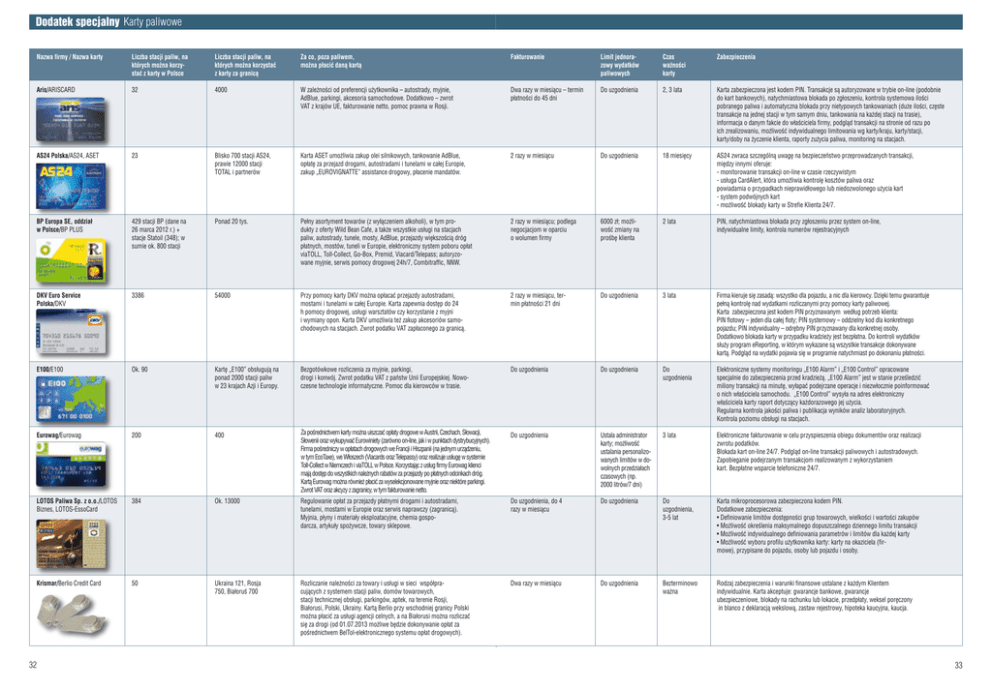 Dodatek specjalny Karty paliwowe Nazwa firmy / Nazwa karty Liczba stacji paliw, na których można korzystać z karty w Polsce Liczba stacji paliw, na których można korzystać z karty za granicą Za co, poza paliwem, można płacić daną kartą Fakturowanie Limit jednorazowy wydatków paliwowych Czas ważności karty Zabezpieczenia Aris/ARISCARD 32 4000 W zależności od preferencji użytkownika – autostrady, myjnie, AdBlue, parkingi, akcesoria samochodowe. Dodatkowo – zwrot VAT z krajów UE, fakturowanie netto, pomoc prawna w Rosji. Dwa razy w miesiącu – termin płatności do 45 dni Do uzgodnienia 2, 3 lata Karta zabezpieczona jest kodem PIN. Transakcje są autoryzowane w trybie on-line (podobnie do kart bankowych), natychmiastowa blokada po zgłoszeniu, kontrola systemowa ilości pobranego paliwa i automatyczna blokada przy nietypowych tankowaniach (duże ilości, częste transakcje na jednej stacji w tym samym dniu, tankowania na każdej stacji na trasie), informacja o danym fakcie do właściciela firmy, podgląd transakcji na stronie od razu po ich zrealizowaniu, możliwość indywidualnego limitowania wg karty/kraju, karty/stacji, karty/doby na życzenie klienta, raporty zużycia paliwa, monitoring na stacjach. AS24 Polska/AS24, ASET 23 Blisko 700 stacji AS24, prawie 12000 stacji TOTAL i partnerów Karta ASET umożliwia zakup olei silnikowych, tankowanie AdBlue, opłatę za przejazd drogami, autostradami i tunelami w całej Europie, zakup „EUROVIGNATTE” assistance drogowy, płacenie mandatów. 2 razy w miesiącu Do uzgodnienia 18 miesięcy AS24 zwraca szczególną uwagę na bezpieczeństwo przeprowadzanych transakcji, między innymi oferuje: - monitorowanie transakcji on-line w czasie rzeczywistym - usługa CardAlert, która umożliwia kontrolę kosztów paliwa oraz powiadamia o przypadkach nieprawidłowego lub niedozwolonego użycia kart - system podwójnych kart - możliwość blokady karty w Strefie Klienta 24/7. BP Europa SE, oddział w Polsce/BP PLUS 429 stacji BP (dane na 26 marca 2012 r.) + stacje Statoil (348); w sumie ok. 800 stacji Ponad 20 tys. Pełny asortyment towarów (z wyłączeniem alkoholi), w tym produkty z oferty Wild Bean Cafe, a także wszystkie usługi na stacjach paliw, autostrady, tunele, mosty, AdBlue, przejazdy większością dróg płatnych, mostów, tuneli w Europie, elektroniczny system poboru opłat viaTOLL, Toll-Collect, Go-Box, Premid, Viacard/Telepass; autoryzowane myjnie, serwis pomocy drogowej 24h/7, Combitraffic, NNW. 2 razy w miesiącu; podlega negocjacjom w oparciu o wolumen firmy 6000 zł; możliwość zmiany na prośbę klienta 2 lata PIN, natychmiastowa blokada przy zgłoszeniu przez system on-line, indywidualne limity, kontrola numerów rejestracyjnych DKV Euro Service Polska/DKV 3386 54000 Przy pomocy karty DKV można opłacać przejazdy autostradami, mostami i tunelami w całej Europie. Karta zapewnia dostęp do 24 h pomocy drogowej, usługi warsztatów czy korzystanie z myjni i wymiany opon. Karta DKV umożliwia też zakup akcesoriów samochodowych na stacjach. Zwrot podatku VAT zapłaconego za granicą. 2 razy w miesiącu, termin płatności 21 dni Do uzgodnienia 3 lata Firma kieruje się zasadą: wszystko dla pojazdu, a nic dla kierowcy. Dzięki temu gwarantuje gwarantują pełną kontrolę nad wydatkami rozliczanymi przy pomocy karty paliwowej. Karta zabezpieczona jest kodem PIN przyznawanym według potrzeb klienta: PIN flotowy – jeden dla całej floty; PIN systemowy – oddzielny kod dla konkretnego pojazdu; PIN indywidualny – odrębny PIN przyznawany dla konkretnej osoby. Dodatkowo blokada karty w przypadku kradzieży jest bezpłatna. Do kontroli wydatków służy program eReporting, w którym wykazane są wszystkie transakcje dokonywane kartą. Podgląd na wydatki pojawia się w programie natychmiast po dokonaniu płatności. E100/E100 Ok. 90 Kartę „E100” obsługują na ponad 2000 stacji paliw w 23 krajach Azji i Europy. Bezgotówkowe rozliczenia za myjnie, parkingi, drogi i konwój. Zwrot podatku VAT z państw Unii Europejskiej. Nowoczesne technologie informatyczne. Pomoc dla kierowców w trasie. Do uzgodnienia Do uzgodnienia Do uzgodnienia Elektroniczne systemy monitoringu „E100 Alarm” i „E100 Control” opracowane specjalnie do zabezpieczenia przed kradzieżą. „E100 Alarm” jest w stanie prześledzić miliony transakcji na minutę, wyłapać podejrzane operacje i niezwłocznie poinformować o nich właściciela samochodu. „E100 Control” wysyła na adres elektroniczny właściciela karty raport dotyczący każdorazowego jej użycia. Regularna kontrola jakości paliwa i publikacja wyników analiz laboratoryjnych. wyniki analiz laboratoryjnych. Kontrola poziomu obsługi na stacjach. stacjach Eurowag/Eurowag 200 400 Za pośrednictwem karty można uiszczać opłaty drogowe w Austrii, Czechach, Słowacji, Słowenii oraz wykupywać Eurowiniety (zarówno on-line, jak i w punktach dystrybucyjnych). Firma pośredniczy w opłatach drogowych we Francji i Hiszpanii (na jednym urządzeniu, w tym EcoTaxe), we Włoszech (Viacards oraz Telepassy) oraz realizuje usługę w systemie Toll-Collect w Niemczech i viaTOLL w Polsce. Korzystając z usług firmy Eurowag klienci mają dostęp do wszystkich należnych rabatów za przejazdy po płatnych odcinkach dróg. Kartą Eurowag można również płacić za wyselekcjonowane myjnie oraz niektóre parkingi. Zwrot VAT oraz akcyzy z zagranicy, w tym fakturowanie netto. Do uzgodnienia Ustala administrator karty; możliwość ustalania personalizowanych limitów w dowolnych przedziałach czasowych (np. 2000 litrów/7 dni) 3 lata Elektroniczne fakturowanie w celu przyspieszenia obiegu dokumentów oraz realizacji zwrotu podatków. Blokada kart on-line 24/7. Podgląd on-line transakcji paliwowych i autostradowych. Zapobieganie Zapobieganie podejrzanymrealizowany transakcjomz wykorzystaniem realizowanym z wykorzystaniem podejrzanym transakcjom kart. Bezpłatne wsparcie telef