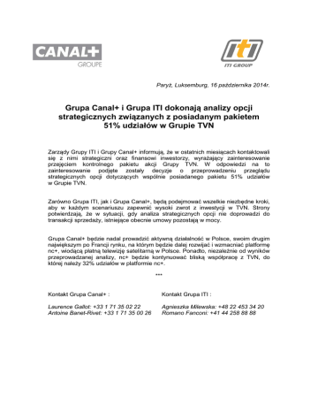 Paryż, Luksemburg, 16 października 2014r. Grupa Canal+ i Grupa ITI dokonają analizy opcji strategicznych związanych z posiadanym pakietem 51% udziałów w Grupie TVN Zarządy Grupy ITI i Grupy Canal+ informują, że w ostatnich miesiącach kontaktowali się z nimi strategiczni oraz finansowi inwestorzy, wyrażający zainteresowanie przejęciem kontrolnego pakietu akcji Grupy TVN. W odpowiedzi na to zainteresowanie podjęte zostały decyzje o przeprowadzeniu przeglądu strategicznych opcji dotyczących wspólnie posiadanego pakietu 51% udziałów w Grupie TVN. Zarówno Grupa ITI, jak i Grupa Canal+, będą podejmować wszelkie niezbędne kroki, aby w każdym scenariuszu zapewnić wysoki zwrot z inwestycji w TVN. Strony potwierdzają, że w sytuacji, gdy analiza strategicznych opcji nie doprowadzi do transakcji sprzedaży, istniejące obecnie umowy pozostają w mocy. Grupa Canal+ będzie nadal prowadzić aktywną działalność w Polsce, swoim drugim największym po Francji rynku, na którym będzie dalej rozwijać i wzmacniać platformę nc+, wiodącą płatną telewizję satelitarną w Polsce. Ponadto, niezależnie od wyników przeprowadzanej analizy, nc+ będzie kontynuować bliską współpracę z TVN, do której należy 32% udziałów w platformie nc+. *** Kontakt Grupa Canal+ : Kontakt Grupa ITI : Laurence Gallot: +33 1 71 35 02 22 Antoine Banet-Rivet: +33 1 71 35 00 26 Agnieszka Milewska: +48 22 453 34 20 Romano Fanconi: +41 44 258 88 88 O TVN: TVN S.A („TVN”) jest jedyną spółką działającą wyłącznie w branży mediów elektronicznych, notowaną na Warszawskiej Giełdzie Papierów Wartościowych. TVN jest też wiodącą prywatną grupą medialną w Polsce. W chwili obecnej nadaje 11 następujących kanałów telewizyjnych: TVN - wiodący kanał telewizyjny, oferujący wysokiej jakości programy rozrywkowe oraz rzetelne i niezależne audycje informacyjne. TVN24 jest pierwszym polskim publicystycznym kanałem telewizyjnym. 24-godzinnym informacyjno- TVN24 Biznes i Świat jest kanałem informacyjnym o tematyce biznesowej i międzynarodowej. TVN Meteo to pierwszy polski kanał telewizyjny o pogodzie. TVN Turbo jest pierwszym polskim kanałem tematycznym adresowanym do mężczyzn i zarazem pierwszym poświęconym głównie motoryzacji. TVN Style jest kanałem telewizyjnym adresowanym poświęconym urodzie, stylom życia, modzie oraz zdrowiu. do kobiet, TTV - kanał telewizyjny oferujący publicystykę, informację i dokument społeczny - dostępny w sieciach kablowych, na platformach cyfrowych oraz w ramach naziemnej telewizji cyfrowej. TVN7 to kanał telewizyjny o profilu filmowo-serialowym. ITVN jest kanałem telewizyjnym skierowanym do widowni pochodzenia polskiego zamieszkałej za granicą, dostępnym w Europie, Ameryce Północnej i w Australii. Telezakupy Mango telesprzedażowy. to jedyny w Polsce całodobowy kanał NTL jest lokalnym kanałem telewizyjnym adresowanym do mieszkańców Radomska i okolic. TVN posiada w swojej ofercie produktów online m.in.: player.pl – platforma VOD, umożliwia bezpłatny dostęp online do bogatej biblioteki seriali i programów telewizyjnych. Jest dostępna m.in. na urządzeniach z systemem Android i iOS, konsolach PS3, w telewizorach wiodących producentów oraz w dekoderach kablowych i satelitarnych. Pozwala oglądać niektóre ulubione programy nawet przed emisją na antenie. tvn24.pl - portal informacyjny z największą ilością wideo, łączący efektywnie tekst i obraz, będący liderem w swojej kategorii. Akcje TVN S.A. zadebiutowały na Warszawskiej Giełdzie Papierów Wartościowych 7 grudnia 2004 r.