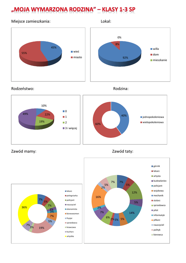 Miejsce zamieszkania: Lokal: 0% 8% 45% willa wieś 55% dom miasto 92% Rodzeństwo: mieszkanie Rodzina: 10% 0 49% 22% 19% 40% 1 2 jednopokoleniowa wielopokoleniowa 60% 3 i więcej Zawód mamy: Zawód taty: górnik lekarz artysta 5% 2% 7% 7% lekarz pielegniarka 7% 7% 3% 3% 7% 36% 5% 7% 3% 19% bisneswomen fryzjer sprzedawca krawcowa kucharz artystka wojskowy mechanik 16% 5% nauczyciel ekonomista policjant 12% policjant 5% budowlaniec 5% stolarz sprzedawca 2% 7% 14% 6% 2% 5% 5% pilot informatyk piłkarz nauczyciel polityk kierowca Zwierzęta domowe: 1% 43% 40% pies kot 16% inne bez zwierzat Wymarzona rodzina naszych najmłodszych uczniów mieszka w mieście (może być to Paryż, Nowy Jork, Warszawa, ostatecznie Kraków) w dużej willi z basenem, windą, torem motocyklowym, limuzynami (co najmniej 2), mile widziany samolot, sauna, telewizor baaaardzo duży (a może jeszcze większy). Konieczna jest również fontanna i wodne łóżko… Rodzina jest wielopokoleniowa (babcia, dziadek, wujkowie, ciocie) z dużą ilością dzieci (4 i więcej). Nie brakuje też zwierząt – pies (a nawet kilka psów), kot, rybki, chomik, świnka morska, papugi, królik i koń dopełniają obraz szczęśliwej rodziny. Taki luksus może zapewnić mama: artystka (aktorka, modelka, piosenkarka) lub sklepowa i tata: piłkarz lub policjant. Ważne jest, by w tej willi dziecko miało własny pokój i mogło w przyszłości zostać tym, kim chce (czyli piłkarzem – jak tata lub piosenkarką, modelką, projektantką mody jak mama albo fryzjerką czy nauczycielką). Mamo, tato naszych uczniów z klas 1 – 3, jeśli nie planujecie przeprowadzki do Paryża (ostatecznie do Krakowa), to chociaż zapewnijcie swojemu dziecku własny pokój, konia i pozwólcie mu zostać piłkarzem, modelką lub fryzjerką. PS. Klasy 1 i 3 zdecydowanie preferują duże miasta, klasa 2 duży dom (wyposażony równie bogato jak ten w Nowym Jorku) lokuje na wsi. Obraz statystycznej rodziny klas 1 – 3 wykona klasa 2.