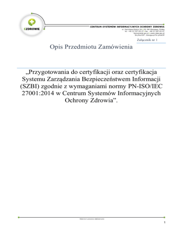 Załącznik nr 1 Opis Przedmiotu Zamówienia „Przygotowania do certyfikacji oraz certyfikacja Systemu Zarządzania Bezpieczeństwem Informacji (SZBI) zgodnie z wymaganiami normy PN-ISO/IEC 27001:2014 w Centrum Systemów Informacyjnych Ochrony Zdrowia”. 1 Spis treści 1. Przedmiot zamówienia ............................................................................................................................ 3 2. Audyt SZBI pod kątem certyfikacji wg normy PN-ISO/IEC 27001:2014 ............................................... 3 3. Działania doradcze prowadzące do uzyskania pełnej zgodności z wymogami normy PN-ISO/IEC 27001:2014. ............................................................................................................................................. 5 4. Certyfikacja Systemu Zarządzania Bezpieczeństwem Informacji zgodnie z normą PN-ISO/IEC 27001:2014 .............................................................................................................................................. 5 5. Ocena, opis ustaleń i wydanie zaleceń/propozycji optymalizacji w poszczególnych obszarach. ........... 6 2 1. Przedmiot zamówienia Zamawiający posiada ustanowiony Zintegrowany System Zarządzania Bezpieczeństwem Informacji i Ciągłością Działania (dalej: „ZSZBIiCD”) zaprojektowany i wdrożony wg standardu opisanego w normie PN-ISO/IEC 27001:2014. 1.1.W ramach Zamówienia Wykonawca wykona usługę polegającą na: a) wykonaniu audytu Systemu Zarządzania Bezpieczeństwem Informacji u Zamawiającego, pod kątem zgodności z przyszłej certyfikacji dla normy PN-ISO/IEC 27001:2014, b) działaniach doradczych prowadzących do uzyskania pełnej zgodności z wymogami normy PN-ISO/IEC 27001:2014, c) przeprowadzeniu certyfikacji Systemu Zarządzania Bezpieczeństwem Informacji na zgodność z normą PN-ISO/IEC 27001:2014; d) uzyskanie od akredytowanej jednostki certyfikatu potwierdzającego zgodność SZBI Zamawiającego z normą PN-ISO/IEC 27001:2014; e) Dla prac o których mowa w pkt a, b i c powyżej sporządzona zostanie ocena i wydane zostaną zalecenia/propozycje optymalizacji w poszczególnych badanych obszarach. 1.2. Prace, o których mowa w pkt 1.1. zostaną wykonane do dnia 14 grudnia 2016 r. 1.3. Wykonane prace, o których mowa w pkt.1.1 zostaną odebrane przez Zamawiającego Protokołem odbioru. 1.4. Ilekroć w dokumencie mowa o dniach, oznacza to dni robocze (od poniedziałku do piątku) w godzinach pracy Zamawiającego 8:00-16:00. 2. Audyt Systemu Zarządzania Bezpieczeństwem Informacji pod kątem certyfikacji wg normy PN-ISO/IEC 27001:2014 2.1. Audyt Systemu Zarządzania Bezpieczeństwem Informacji, o którym mowa w pkt 1.1. lit. a) zostanie dokonany na podstawie obszarów opisanych w normie PN-ISO/IEC 27001:2014. 2.2. Podczas audytu Wykonawca zbada aktualny stan zabezpieczenia zasobów informacyjnych pod względem: poufności, integralności i dostępności, wskazaniu ewentualnych 3 niezgodności oraz przygotuje rekomendacje związane z wprowadzeniem mechanizmów służących do uzyskania bezpieczeństwa informacji, zgodnego z normą PN-ISO/IEC 27001:2014. 2.3. Celem weryfikacji jest zbadanie czy rozwiązania przyjęte w ramach Systemu Zarządzania Bezpieczeństwem Informacji, wdrożonego u Zamawiającego są kompletne z punktu widzenia możliwości uzyskania certyfikacji na zgodność z normą PN-ISO/IEC 27001:2014. 2.4. Zakres prac audytowych obejmuje: a) analizę istniejących u Zamawiającego dokumentów: Polityki Bezpieczeństwa, procedur, instrukcji, regulaminów dotyczących bezpieczeństwa informacji, wchodzących w skład Systemu Zarządzania Bezpieczeństwem Informacji; b) ocenę ww. dokumentów pod kątem zgodności z normą PN-ISO/IEC 27001:2014, w oparciu o Załącznik A tej normy; c) weryfikację poprawności wdrożenia i funkcjonowania opisanych zabezpieczeń; d) weryfikację poprawności realizacji procedur, zawartych w Polityce Bezpieczeństwa; e) opracowanie raportu z audytu zawierającego opis funkcjonowania Systemu Zarządzania Bezpieczeństwem Informacji w odniesieniu do wytycznych zawartych w normie; f) sformułowanie niezgodności i rekomendacji. 2.5. Audyt będzie prowadzony na poziomie trzech warstw: metodologicznej, organizacyjnej oraz dokumentacyjnej. 2.6. Audyt będzie oparty na wymogach normy PN-ISO/IEC 27001:2014 oraz wymogach zabezpieczeń opisanych w Załączniku A do normy PN-ISO/IEC 27001:2014. 2.7. Wyniki audytu przedstawiane będą w formie raportu z audytu. Sformułowane w raporcie niezgodności powinny być poparte dowodami i odnosić się do punktów normy. 2.8. Raport z audytu Systemu Zarządzania Bezpieczeństwem Informacji, zawierać będzie elementy, o których mowa w pkt 2.7. oraz ocenę stanu zgodności z normą PN-ISO/IEC 27001:2014 na czterech poziomach: pełna zgodność, zgodność z zastrzeżeniami, zgodność na poziomie minimalnym, niezgodność. 4 2.9. W przypadku poziomów „zgodność z zastrzeżeniami, zgodność na poziomie minimalnym, niezgodność”, Wykonawca przedstawi propozycję ewentualnego uzupełnienia dokumentacji Systemu Zarządzania Bezpieczeństwem Informacji o brakujące elementy (na podstawie wymagań normy PN-ISO/IEC 27001:2014), jeśli taka potrzeba zostanie zidentyfikowana 3. Działania doradcze prowadzące do uzyskania pełnej zgodności z wymogami normy PN-ISO/IEC 27001:2014. 3.1.Działania doradcze, o których mowa w pkt 1.1. lit. b) zostaną dokonane na podstawie wskazanych w raporcie z audytu braków (niezgodności) w zakresie zgodności z obszarami opisanymi w normie PN-ISO/IEC 27001:2014. Wykonawca będzie rekomendował skuteczne działania korygujące. 3.2.W ramach działań doradczych Wykonawca będzie świadczył merytoryczną pomoc w zakresie doprowadzenia Systemu Zarządzania Bezpieczeństwem Informacji Zamawiającego do pełnej zgodności z wymogami normy PN-ISO/IEC 27001:2014. 3.3.W ramach działań doradczych Wykonawca przygotuje propozycje uzupełni