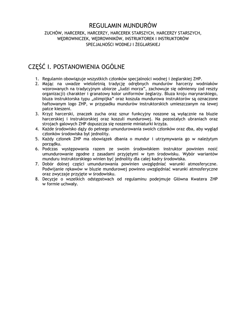 REGULAMIN MUNDURÓW ZUCHÓW, HARCEREK, HARCERZY, HARCEREK STARSZYCH, HARCERZY STARSZYCH, WĘDROWNICZEK, WĘDROWNIKÓW, INSTRUKTOREK I INSTRUKTORÓW SPECJALNOŚCI WODNEJ I ŻEGLARSKIEJ CZĘŚĆ I. POSTANOWIENIA OGÓLNE 1. Regulamin obowiązuje wszystkich członków specjalności wodnej i żeglarskiej ZHP. 2. Mając na uwadze wieloletnią tradycję odrębnych mundurów harcerzy wodniaków wzorowanych na tradycyjnym ubiorze „ludzi morza”, zachowuje się odmienny (od reszty organizacji) charakter i granatowy kolor uniformów żeglarzy. Bluza kroju marynarskiego, bluza instruktorska typu „olimpijka” oraz koszula mundurowa instruktorów są oznaczone haftowanym logo ZHP, w przypadku mundurów instruktorskich umieszczanym na lewej patce kieszeni. 3. Krzyż harcerski, znaczek zucha oraz sznur funkcyjny noszone są wyłącznie na bluzie harcerskiej i instruktorskiej oraz koszuli mundurowej. Na pozostałych ubraniach oraz strojach galowych ZHP dopuszcza się noszenie miniaturki krzyża. 4. Każde środowisko dąży do pełnego umundurowania swoich członków oraz dba, aby wygląd członków środowiska był jednolity. 5. Każdy członek ZHP ma obowiązek dbania o mundur i utrzymywania go w należytym porządku. 6. Podczas występowania razem ze swoim środowiskiem instruktor powinien nosić umundurowanie zgodne z zasadami przyjętymi w tym środowisku. Wybór wariantów munduru instruktorskiego winien być jednolity dla całej kadry środowiska. 7. Dobór dolnej części umundurowania powinien uwzględniać warunki atmosferyczne. Podwijanie rękawów w bluzie mundurowej powinno uwzględniać warunki atmosferyczne oraz zwyczaje przyjęte w środowisku. 8. Decyzje o wszelkich odstępstwach od regulaminu podejmuje Główna Kwatera ZHP w formie uchwały. CZĘŚĆ II. MUNDUR ZUCHÓW, HARCEREK I HARCERZY, HARCEREK STARSZYCH I HARCERZY STARSZYCH ORAZ WĘDROWNICZEK I WĘDROWNIKÓW Bluza Członkowie środowisk specjalności wodnej i żeglarskiej noszą bluzę kroju marynarskiego w kolorze granatowym zakładaną przez głowę, z materiału ubraniowego (tropik morski), lekko dopasowaną, wypuszczaną na spodnie lub spódnicę. Bluza w rozcięciach u dołu po bokach i z przodu na przedłużeniu dekoltu jest sznurowana granatową lub czarną tasiemką. W dolnej części bluzy mogą znajdować się dwie wewnętrzne kieszenie w szwach bocznych. Rękawy koszulowe długie, ujęte w mankiety zapinane na jeden płaski guzik z gładkim obrzeżem i lilijką połączoną w środku kotwicą. Przy mankietach rękawów trzy zaszewki. Rozcięcie w rękawie na tyle długie, aby można go było podwijać. Na bluzę nakładany jest granatowy kołnierz marynarski, obszywany trzema rzędami białej tasiemki. W okresie letnim możliwe jest noszenie białego kołnierza marynarskiego, obszywanego trzema rzędami granatowej tasiemki, jednolicie dla całej drużyny. Pod bluzę zakłada się jednolity podkoszulek (Tshirt) lub półgolf w kolorze białym, granatowym lub czarnym (jednakowo dla całego środowiska), wypełniający rozcięcie kołnierza z przodu. Zuchy mogą używać koszulek lub półgolfów oraz tasiemek do sznurowania w innych kolorach, jednolicie w gromadzie. Sposób noszenia na mundurze odznak i oznak określa Część VI Regulaminu. Na bluzie mundurowej nie nosi się chust. W drużynach wędrowniczych dopuszcza się noszenie granatowych koszul mundurowych (patrz mundur instruktorów) jednolicie w całym środowisku. Zasady noszenia oznak i odznak stosuje się wówczas odpowiednio, z wyjątkiem ograniczeń liczby, zakresu i czasu noszenia, które obowiązują jak w przypadku munduru wędrowników niespecjalnościowych. Spodnie, spódnica Chłopcy do bluzy żeglarskiej noszą długie spodnie w kolorze granatowym z materiału ubraniowego, dopasowane, z lekko rozszerzanymi lub prostymi nogawkami wykładanymi na buty, z dwiema kieszeniami w szwach bocznych i jedną z tyłu z prawej strony. Dopuszcza się możliwość noszenia spodni w kolorze czarnym, a w okresie letnim także białych spodni płóciennych, jednolitych kolorystycznie dla całego środowiska. Dziewczęta podczas zajęć na lądzie do bluzy żeglarskiej noszą granatowe spódnice z czterech klinów do kolan z materiału ubraniowego wg wzoru ZHP, z tyłu zapinane na suwak i jeden guzik. Z tyłu spódnicy w dolnej części umieszczone jest rozcięcie ułatwiające poruszanie się, po bokach u dołu dwie nakładane kieszenie zapinane na guzik, zamek błyskawiczny lub patkę z rzepem. Dopuszcza się noszenie spódnic czarnych, a w okresie letnim także białych, jednolicie dla całego środowiska. Spódnice nosi się bez rajstop lub z rajstopami w kolorze naturalnym lub czarnym. Dopuszcza się noszenie spodni jak u chłopców, jednolicie dla całego środowiska. W okresie letnim i podczas zajęć na wodzie dziewczęta i chłopcy mogą nosić do munduru także krótkie spodnie w kolorze granatowym, czarnym lub białym, jednolicie dla całego środowiska. Ze względów praktycznych zaleca się umieszczenie na spodniach nakładanych kieszeni z boku nogawki a’la bojówki zapinanych na guzik, zamek błyskawiczny lub patkę z rzepem; również górne kieszenie powinny być zapinane na zamek błyskawiczny lub patkę z rzepem. Do spódnic i krótkich spodni można nosić czarne, granatowe lub białe podkolanówki lub skarpety i getry w kolorze wybranym przez środowisko. Pas harcerski W drużynach wędrowniczych, w których noszone są granatowe koszule mundurowe, nosi się pas harcerski (patrz opis w Części III). Nakrycie głowy Beret typu baskijskiego w kolorze czarnym lub granatowym. Dopuszcza się noszenie przez zuchów białych, miękkich, okrągłych czapek marynarskich, tzw. „amerykanek” (a’la Papaj Marynarz). Obuwie i skarpety Podczas zajęć i wędrówek na lądzie można używać stosownego obuwia turystycznego lub sportowego w kolorze czarnym lub białym. Wędrownicy w czasie oficjalnych uroczystości mogą nosić czarne półbuty. Zaleca