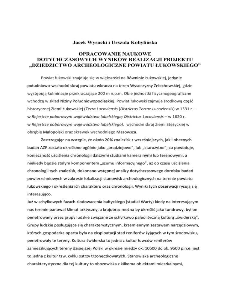 Jacek Wysocki i Urszula Kobylińska OPRACOWANIE NAUKOWE DOTYCHCZASOWYCH WYNIKÓW REALIZACJI PROJEKTU „DZIEDZICTWO ARCHEOLOGICZNE POWIATU ŁUKOWSKIEGO” Powiat łukowski znajduje się w większości na Równinie Łukowskiej, jedynie południowo-wschodni skraj powiatu wkracza na teren Wysoczyzny Żelechowskiej, gdzie występują kulminacje przekraczające 200 m n.p.m. Obie jednostki fizycznogeograficzne wchodzą w skład Niziny Południowopodlaskiej. Powiat łukowski zajmuje środkową część historycznej Ziemi Łukowskiej (Terra Lucoviensis (Districtus Terrae Lucoviensis) w 1531 r. – w Rejestrze poborowym województwa lubelskiego; Districtus Lucoviensis – w 1620 r. w Rejestrze poborowym województwa lubelskiego), wschodni skraj Ziemi Stężyckiej w obrębie Małopolski oraz skrawek wschodniego Mazowsza. Zastrzegając na wstępie, że około 20% znalezisk z wcześniejszych, jak i obecnych badań AZP zostało określone ogólnie jako „pradziejowe”, lub „starożytne”, co powoduje, konieczność uściślenia chronologii dalszymi studiami kameralnymi lub terenowymi, a niekiedy będzie stałym komponentem „szumu informacyjnego”, aż do czasu uściślenia chronologii tych znalezisk, dokonano wstępnej analizy dotychczasowego dorobku badań powierzchniowych w zakresie lokalizacji stanowisk archeologicznych na terenie powiatu łukowskiego i określenia ich charakteru oraz chronologii. Wyniki tych obserwacji rysują się interesująco. Już w schyłkowych fazach zlodowacenia bałtyckiego (stadiał Warty) kiedy na interesującym nas terenie panował klimat arktyczny, a krajobraz można by określić jako tundrowy, był on penetrowany przez grupy ludzkie związane ze schyłkowo paleolityczną kulturą „świderską”. Grupy ludzkie posługujące się charakterystycznym, krzemiennym zestawem narzędziowym, których gospodarka oparta była na eksploatacji stad reniferów żyjących w tym środowisku, penetrowały te tereny. Kultura świderska to jedna z kultur łowców reniferów zamieszkujących tereny dzisiejszej Polski w okresie miedzy ok. 10500 do ok. 9500 p.n.e. jest to jedna z kultur tzw. cyklu ostrzy trzoneczkowatych. Stanowiska archeologiczne charakterystyczne dla tej kultury to obozowiska z kilkoma obiektami mieszkalnymi, stanowiące zapewne ślady letnich zgromadzeń łowców w sąsiedztwie pastwisk reniferów, oraz stanowiska z pojedynczymi, zagłębionymi w ziemie obiektami mieszkalnymi, zapewne związane z rozproszeniem ludności w okresie zimowym i polowaniami indywidualnymi. Znane są także koncentracje wyrobów krzemiennych, zawierające groty strzał i rylce, stanowiące pozostałość obozowisk z okresu masowych polowań na renifery. Wraz z początkiem holocenu i transgresją środowiska leśnego na północ, kultura świderska przesuwa się na tereny Litwy, Łotwy i Estonii, gdzie przyczynia się do powstania kultury kundajskiej i niemeńskiej. Znaleziska związane z tą kulturą odnotowano w dolinach rzek Świder i Wilga (na północno-zachodnim krańcu powiatu), jak również w dolinie Bystrzycy (południowa część powiatu). Pojedyncze znalezisko związane z tą kulturą odnotowano także w Rolach w dolinie Krzny. Oczywiście w tamtych czasach ukształtowanie terenu oraz jego hydrografia były z pewnością inne, jednakże prawdopodobnie już wówczas były ukształtowane zasadnicze elementy fizjografii tych terenów, co generowało konkretne zachowania zarówno zwierząt jak i ludzi. Znaleziska „świderskie” to na razie pojedyncze przedmioty, świadczące raczej o penetracji tych terenów, niż o stałym ich zajęciu. Brak jak dotąd śladów bardziej długotrwałych obozowisk, których śladami byłyby krzemienice. Być może jest to związane z brakiem odpowiednich warunków fizjograficznych (wyniosłe wydmy), lub też z brakiem możliwości wykrycia tych pozostałości przez współczesnych archeologów. Dotychczas zarejestrowano 8 punktów zakwalifikowanych jako „świderskie”. Są to: Świder st. 1 (64-75/25) Ciechomin st. 5 (64-75/14) Wilczyska st. 29 (65-75/107) Radoryż Kościelny st. 1 ( 65-77/10) Huta Radoryska st 5 (66-77/28) Budziska st. 1 (68-78/1) Role st. 19 (62-80/84) W miarę ocieplania klimatu zmieniały się stosunki wodne ma tym terenie, stabilizowała się jego fizjografia i wzbogacała szata roślinna. W kolejnym, cieplejszym okresie klimatycznym, a dla rozwoju człowieka związanym z kolejną fazą epoki kamienia – mezolitem, teren nasz jest także odwiedzany przez grupy ludzkie, tym razem myśliwych, funkcjonujących w środowisku leśnym związanym także blisko z wodą. Ci myśliwi i zbieracze preferowali traperski model życia, związany z ciągłym przemieszczaniem się w poszukiwaniu dogodnych warunków do obozowania i polowania. Niestety dotychczas odkryto jedynie ślady polowań w postaci pojedynczych przedmiotów krzemiennych, a nie zlokalizowano żadnych śladów obozowisk. Ślady kultury mezolitycznej odkryto w 11 punktach na terenie powiatu, jednakże dającej się zidentyfikować kultury „janisławickiej” w 3 punktach, w dolinie Krzny, a pojedyncze ślady w postaci niezbyt charakterystycznych narzędzi lub półwytworów krzemiennych w dolinach Świdra i Bystrzycy. Kultura janisławicka to kultura epoki późnego mezolitu, datowana na okres ok. 6000 do ok. 5000 lat p.n.e. nawiązuje ona do terenów wschodniej Europy, przede wszystkim z basenu Dniepru. Jej odrębność wyraża się rozwojem technologii wiórowej w krzemieniarstwie, opartej na regularnych, większych wiórach, z których wykonywano narzędzia skrobiące i tnące, np. drapacze oraz geometryczne zbrojniki trapezowate. Gospodarka kultury janisławickiej oparta była na łowiectwie, rybołówstwie i zbieractwie. Ludność janisławicka preferowała krzemień dobrej jakości, przede wszystkim krzemień czekoladowy, eksploatowany sposobem górniczym. Obozowiska, przeważnie kilkuszałasowe, zakładano na wydmach oraz terasach rzecznych. Zanik k. ja