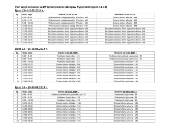 Plan zajęć na kursie: A.19 Wykonywanie zabiegów fryzjerskich (zjazd 13-14) Zjazd 12– 1-2.03.2014 r. Lp. 1 2 3 4 5 6 7 8 9 10 Godz. zajęć 8:00 – 8:45 8:50 – 9:35 9:40 – 10:25 10:30-11:15 11:30-12:15 12:20-13:05 13:10-13:55 14:00-14:45 14:50-15:35 15:40-16:20 Sobota 1-2.03.2014 r. Wykonywanie zabiegów pielęg. Włosów – 146 Wykonywanie zabiegów pielęg. Włosów – 146 Wykonywanie zabiegów pielęg. Włosów – 146 Wykonywanie zabiegów pielęg. Włosów - 146 Strzyżenie włosów, form. fryzur i ondulow.-146 Strzyżenie włosów, form. fryzur i ondulow.-146 Strzyżenie włosów, form. fryzur i ondulow.-146 Strzyżenie włosów, form. fryzur i ondulow.-146 Strzyżenie włosów, form. fryzur i ondulow.-146 Strzyżenie włosów, form. fryzur i ondulow.-146 Niedziela 1-2.03.2014 r. Zmiana koloru włosów - 146 Zmiana koloru włosów - 146 Zmiana koloru włosów - 146 Zmiana koloru włosów - 146 Strzyżenie włosów, form. fryzur i ondulow.-146 Strzyżenie włosów, form. fryzur i ondulow.-146 Strzyżenie włosów, form. fryzur i ondulow.-146 Strzyżenie włosów, form. fryzur i ondulow.-146 Strzyżenie włosów, form. fryzur i ondulow.-146 Strzyżenie włosów, form. fryzur i ondulow.-146 Sobota 15-16.03.2014 r. Podstawy fryzjerstwa – 24 Podstawy fryzjerstwa – 24 Podstawy fryzjerstwa – 24 Zmiana koloru włosów - 146 Zmiana koloru włosów - 146 Zmiana koloru włosów - 146 Zmiana koloru włosów - 146 Zmiana koloru włosów - 146 Zmiana koloru włosów - 146 Zmiana koloru włosów - 146 Niedziela 15-16.03.2014 r. Podstawy komunikacji społecznej – 25 Podstawy komunikacji społecznej - 25 Zmiana koloru włosów - 146 Zmiana koloru włosów - 146 Zmiana koloru włosów - 146 Zmiana koloru włosów - 146 Zmiana koloru włosów - 146 Zmiana koloru włosów - 146 Zmiana koloru włosów - 146 Zmiana koloru włosów - 146 Sobota 29-30.03.2014 r. Podstawy działalności gospodarczej– 25 Podstawy fryzjerstwa – 24 Podstawy fryzjerstwa – 24 Zmiana koloru włosów – 146 Zmiana koloru włosów - 146 Zmiana koloru włosów - 146 Zmiana koloru włosów - 146 Zmiana koloru włosów - 146 Zmiana koloru włosów - 146 Zmiana koloru włosów - 146 Niedziela 29-30.03.2014 r. Podstawy fryzjerstwa – 24 Podstawy fryzjerstwa – 24 Podstawy fryzjerstwa – 24 Zmiana koloru włosów - 146 Zmiana koloru włosów - 146 Zmiana koloru włosów - 146 Zmiana koloru włosów - 146 Zmiana koloru włosów - 146 Zmiana koloru włosów - 146 Zmiana koloru włosów - 146 Zjazd 13 – 15-16.03.2014 r. Lp. 1 2 3 4 5 6 7 8 9 10 Godz. zajęć 8:00 – 8:45 8:50 – 9:35 9:40 – 10:25 10:30-11:15 11:30-12:15 12:20-13:05 13:10-13:55 14:00-14:45 14:50-15:35 15:40-16:20 Zjazd 14 – 29-30.03.2014 r. Lp. 1 2 3 4 5 6 7 8 9 10 Godz. zajęć 8:00 – 8:45 8:50 – 9:35 9:40 – 10:25 10:30-11:15 11:30-12:15 12:20-13:05 13:10-13:55 14:00-14:45 14:50-15:35 15:40-16:20