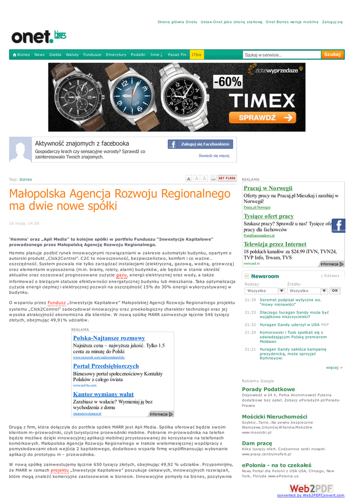 Strona główna O netu Ustaw O net jak o stronę startową O net Biznes wersja m obilna Zaloguj się bzines Biznes News Giełda Waluty Fundusze Emerytury Podatki Inne Pasaż Fin. ITbiz Szukaj Szukaj w serwisie... Aktywność znajomych z facebooka Gospodarczy krach czy sensacyjne wzrosty? Sprawdź co zainteresowało Twoich znajomych. Dowiedz się więcej Tagi: biznes REKLA MA Małopolska Agencja Rozwoju Regionalnego ma dwie nowe spółki Pracuj w Norwegii Oferty pracy na Pracuj.pl Mieszkaj i zarabiaj w Norwegii! Pracuj.pl/Norwegia Tysiące ofert pracy Szukasz pracy? Sprawdź u nas! Tysięce ofert pracy dla fachowców 16 maja, 14:50 PortalSamorzadowy.pl 'Hemms' oraz „Apli Media” to kolejne spółki w portfelu Funduszu "Inwestycje Kapitałowe" prowadzonego przez Małopolską Agencję Rozwoju Regionalnego. Hemms planuje podbić rynek innow acyjnymi rozw iązaniami w zakresie automatyki budynku, opartymi o autorski produkt „Click2Control”. C2C to now oczesność, bezpieczeństw o, komfort i co w ażne… oszczędność. System pozw ala nie tylko zarządzać instalacjami (elektryczną, gazow ą, w odną, grzew czą) oraz elementami w yposażenia (m.in. bramy, rolety, alarm) budynków , ale będzie w stanie określić aktualne oraz oszacow ać prognozow ane zużycie gazu , energii elektrycznej oraz w ody, a także informow ać o bieżącym statusie efektyw ności energetycznej budynku lub mieszkania. Taka optymalizacja zużycia energii cieplnej i elektrycznej pozw oli na oszczędność 15% do 30% energii w ykorzystyw anej w budynku. O w sparciu przez Fundusz „Inw estycje Kapitałow e” Małopolskiej Agencji Rozw oju Regionalnego projektu systemu „Click2Control” zadecydow ał innow acyjny oraz proekologiczny charakter technologii oraz jej w ysoka atrakcyjność ekonomiczna dla klientów . W now ą spółkę MARR zainw estuje łącznie 546 tysięcy złotych, obejmując 49,91% udziałów . Telewizja przez Internet 18 polskich kanałów za $24.99 iTVN, TVN24, TVP Info, Trwam, TVS www.pol.tv Newsroom Rodzaj: Wszystko | O dśwież Źródło: Wszystko OK 21:39 Seremet podpisał wytyczne ws. "mowy nienawiści" 21:33 Dlaczego huragan Sandy może być wyjątkowo niszczycielski? 21:32 Huragan Sandy uderzył w USA PAP REKLA MA Polska-Najtansze rozmowy Najniższa cena – najwyższa jakość. Tylko 1.5 centa za minutę do Polski www.mojewdt.com/zadzwondopolski 21:29 Komorowski i Tusk spotkali się z odwiedzającym Polskę premierem Mołdawii 21:21 Huragan Sandy zakłóca kampanię prezydencką, może sprzyjać Romneyowi Portal Przedsiębiorczych Biznesowy portal społecznościowy Kontakty Polaków z całego świata www.pol-bc.com Kantor wymiany walut Zarabiasz w walucie? Wymieniaj ją bez wychodzenia z domu internetowykantor.pl Drugą z firm, która dołączyła do portfela spółek MARR jest Apli Media. Spółka oferow ać będzie sw oim klientom m–przew odniki, czyli turystyczne przew odniki mobilne. Pobranie m-przew odnika na telefon będzie możliw e dzięki innow acyjnej aplikacji mobilnej przystosow anej do korzystania na telefonach komórkow ych. Małopolska Agencja Rozw oju Regionalnego w trakcie w ielomiesięcznej w spółpracy z pomysłodaw cami obok w ejścia 2 kapitałow ego, dodatkow o w sparła firmę w spółfinansując w ykonanie aplikacji do prototypu m – przew odnika. W now ą spółkę zainw estujemy łącznie 650 tysięcy złotych, obejmując 49,92 % udziałów . Przypomnijmy, że MARR w ramach projektu „Inw estycje Kapitałow e” poszukuje ciekaw ych, innow acyjnych rozw iązań, które mogą znaleźć komercyjne zastosow anie w biznesie. Innow acyjne pomysły na biznes, pozytyw nie więcej » Reklamy Google Porady Podatkowe O dpowiedź w 24 h, Pełna Anonim owość Pytania dodatk owe bez opłat. Zobacz ePorady24.pl/PoradyPrawne Mościcki Nieruchomości Szybk o..Tanio..Na pewno bezpiecznie Warszawa,Ursynów,W ilanów,Mok otów www.m oscick i.pl Dam pracę Kilk a tysięcy ofert. Codziennie setk i nowych. www.praca.centrum ofert.pl ePolonia - na to czekałeś Nowy Portal dla Polonii z USA USA, Chicago, New York , Floryda www.ePolonia.us converted by Web2PDFConvert.com ocenione przez ekspertów , zostają w drożone w życie, zaś MARR obejmuje udziały do 200 tysięcy euro. Po osiągnięciu przez firmę dojrzałości biznesow ej, agencja w ycofuje udziały, odsprzedając je w spólnikom, inw estorow i strategicznemu lub w drodze oferty publicznej na GPW. Najpopularniejsze wiadomości Miliarder, szef Virgin Mobile chce rozdać Polakom pieniądze 24 paź, 15:16 | Onet Źródło: Komunikaty prasowe 1 322742 Powiązania z tagami: firma, przedsiębiorczość, przedsiębiorca Belka: w Polsce nie ma kryzysu i 168325 polit. pieniężna nie jest stosowana na czas kryzysu 26 paź, 16:53 | PAP (Seks)imprezy firmowe 24 paź, 11:14 | Onet 164527 Zobacz także Rewolucyjne paliwo z C hin 25 paź, 16:48 | IAR 141246 Nagroda dla wolnych od korupcji Sudański miliarder Mohammed Ibrahim rokrocznie oferuje wysoką nagrodę władcom i... dzisiaj, 15:39 Łączne przychody Epicor i Solarsoft sięgną około miliarda dolarów więcej » Epicor sfinalizował przejęcie spółki Solasoft Business Systems. Prognozy finansowe... dzisiaj, 12:30 "NY T" o ukrytej fortunie rodziny premiera Chin Wirtualny doradca pięć razy tańszy niż tradycyjne biuro Rodzina premiera C hin Wen Jiabao, który często przypomina o swoim skromnym... Mogą pracować 24 godziny na dobę przez 7 dni w tygodni, w dodatku... 26 paź, 10:54 REKLAMA 26 paź, 06:57 biznes w i ęcej Napisz komentarz... Co o tym sądzisz? Wypowiedz się na forum! Bądź pierwszy! Wyraź swoją opinię! NEWSLETTER Notowania: Narzędzia: Dla Ciebie: Dla firmy: Specjalne: Źródła: Bądź na bieżąco z wiadomościami biznesowymi. Wpisz swój adres e-mail Zapisz się dowiedz się więcej Dynamiczne Akcje GPW Świat Surowce C atalyst Waluty NBP Waluty on-line Fundusze Twój portfel Analiza techniczna Profile Wykresy Wskaźniki Gra giełdowa Kal