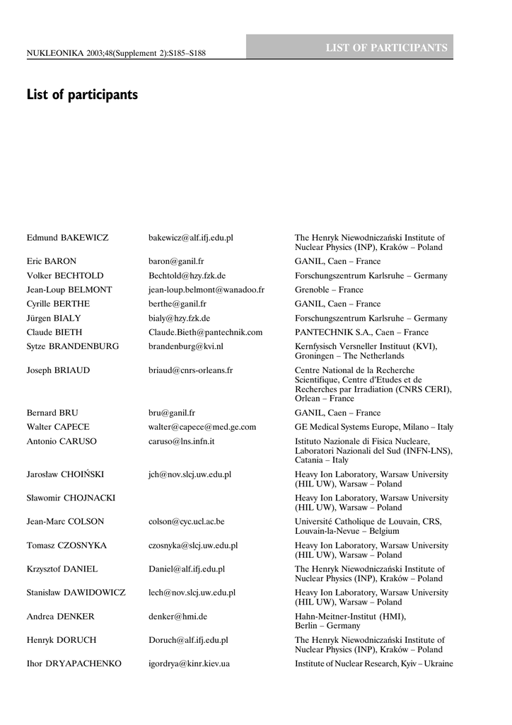 NUKLEONIKA 2003;48(Supplement 2):S185−S188 LIST OF PARTICIPANTS List of participants Edmund BAKEWICZ [email protected] The Henryk Niewodniczański Institute of Nuclear Physics (INP), Kraków − Poland Eric BARON [email protected] GANIL, Caen − France Volker BECHTOLD [email protected] Forschungszentrum Karlsruhe − Germany Jean-Loup BELMONT [email protected] Grenoble − France Cyrille BERTHE [email protected] GANIL, Caen − France Jürgen BIALY [email protected] Forschungszentrum Karlsruhe − Germany Claude BIETH [email protected] PANTECHNIK S.A., Caen − France Sytze BRANDENBURG [email protected] Kernfysisch Versneller Instituut (KVI), Groningen − The Netherlands Joseph BRIAUD [email protected] Centre National de la Recherche , Scientifique, Centre d Etudes et de Recherches par Irradiation (CNRS CERI), Orlean − France Bernard BRU [email protected] GANIL, Caen − France Walter CAPECE walter@[email protected] GE Medical Systems Europe, Milano − Italy Antonio CARUSO [email protected] Istituto Nazionale di Fisica Nucleare, Laboratori Nazionali del Sud (INFN-LNS), Catania − Italy Jarosław CHOIŃSKI [email protected] Heavy Ion Laboratory, Warsaw University (HIL UW), Warsaw − Poland Sławomir CHOJNACKI Heavy Ion Laboratory, Warsaw University (HIL UW), Warsaw − Poland Jean-Marc COLSON [email protected] Université Catholique de Louvain, CRS, Louvain-la-Nevue − Belgium Tomasz CZOSNYKA [email protected] Heavy Ion Laboratory, Warsaw University (HIL UW), Warsaw − Poland Krzysztof DANIEL [email protected] The Henryk Niewodniczański Institute of Nuclear Physics (INP), Kraków − Poland Stanisław DAWIDOWICZ [email protected] Heavy Ion Laboratory, Warsaw University (HIL UW), Warsaw − Poland Andrea DENKER [email protected] Hahn-Meitner-Institut (HMI), Berlin − Germany Henryk DORUCH [email protected] The Henryk Niewodniczański Institute of Nuclear Physics (INP), Kraków − Poland Ihor DRYAPACHENKO [email protected] Institute of Nuclear Research, Kyiv − Ukraine S186 List of participants Gerardo DUTTO [email protected] TRIUMF, Vancouver − Canada Santo GAMMINO [email protected] Istituto Nazionale di Fisica Nucleare, Laboratori Nazionali del Sud (INFN-LNS), Catania − Italy Andreas GEISLER [email protected] ACCEL Instruments GbmH, Bergisch Gladbach − Germany Hans-Juergen GILS [email protected] Forschungszentrum Karlsruhe − Germany Konrad GUGUŁA [email protected] Institute of Nuclear Physics (INP), Kraków − Poland Grigori GULBEKIAN [email protected] Joint Institute for Nuclear Research (JINR), Dubna − Russia Pauli HEIKKINEN [email protected] University of Jyväskylä, Jyväskylä − Finland Kerttuli HELARIUTTA [email protected] University of Helsinki, Laboratory of Radiochemistry, Helsinki − Finland Heinrich HOMEYER [email protected] Hahn-Meitner-Institut (HMI), Berlin − Germany Martin HUMBEL [email protected] Paul Scherrer Institute (PSI), Villigen − Switzerland Takashi Tom INAMURA [email protected] Heavy Ion Laboratory, Warsaw University (HIL UW), Warsaw − Poland Marian JASKÓŁA [email protected] The Andrzej Soltan Institute for Nuclear Studies (SINS), Otwock-Świerk − Poland Jerzy JASTRZĘBSKI [email protected] Heavy Ion Laboratory, Warsaw University (HIL UW), Warsaw − Poland Yves JONGEN [email protected] Ion Beam Applications (IBA), Louvain-la-Neuve − Belgium Helge N. JUNGWIRTH [email protected] Institut fur Kernphysik (IKP), Jülich; ACCEL Instruments GmbH, Bergisch Gladbach − Germany Viatcheslav KHRABROV [email protected] Heavy Ion Laboratory, Warsaw University (HIL UW), Warsaw − Poland Maciej KISIELIŃSKI [email protected] Heavy Ion Laboratory, Warsaw University (HIL UW), Warsaw − Poland Wiel KLEEVEN [email protected] Ion Beam Applications (IBA), Louvain-la-Neuve − Belgium Hans-Udo KLEIN [email protected] ACCEL Instruments GbmH, Bergisch Gladbach − Germany Hannu A. KOIVISTO [email protected] University of Jyväskylä, Jyväskylä − Finland Detlef KRISCHEL [email protected] ACCEL Instruments GbmH, Bergisch Gladbach − Germany Richard KUBAT [email protected] Forschungszentrum Karlsruhe − Germany Ewa KULCZYCKA [email protected] Heavy Ion Laboratory, Warsaw University (HIL UW), Warsaw − Poland Stanisław KULIŃSKI [email protected] The Andrzej Soltan Institute for Nuclear Studies (SINS), Otwock-Świerk − Poland Janusz KURZYŃSKI Sławomir KWIATKOWSKI .. Heavy Ion Laboratory, Warsaw University (HIL UW), Warsaw − Poland [email protected] Lawrence Berkeley National Laboratory (LBNL), Berkeley − USA List of participants S187 Marc LEFEVRE [email protected] PANTECHNIK S.A., Caen − France Loic LePOLOTEC [email protected] Centre National Recherche Scientifique, , Centre d Etudes et de Recherches par Irradiation (CNRS CERI), Orlean − France Marek LEPORIS [email protected] Joint Institute for Nuclear Research (JINR), Dubna − Russia Marcel LIEUVIN [email protected] GANIL, Caen − France Esko LIUKKONEN [email protected] University of Jyväskylä, Jyväskylä − Finland Vladimir N. LOGINOV [email protected] Joint Institute for Nuclear Research (JINR), Dubna − Russia Marc LOISELET [email protected] Université Catholique de Louvain, Louvain-la-Nevue − Belgium Paweł MĄCZEWSKI [email protected] Heavy Ion Laboratory, Warsaw University (HIL UW), Warsaw − Poland Mario MAGGIORE [email protected] Istituto Nazionale di Fisica Nucleare, Laboratori Nazionali del Sud (INFN-LNS), Catania − Italy Jerzy T. MASIAKOWSKI [email protected] GE Medical Systems Europe, Warsaw − Poland Jan MISZCZAK [email protected] Heavy Ion Laboratory, Warsaw University (HIL UW), Warsaw − Poland Josef MOELLENBECK [email protected] Forschungszentrum Karlsruhe − Germany Paweł J. NAPIÓRKOWSKI [email protected] Heavy Ion Laboratory, Warsaw University (HIL UW), Warsaw − Poland Nebojša NEŠKOVIĆ [email protected] Vinca Institute of Nuclear Science, Belgrad − Yugoslavia Rouben OGANESSIAN [email protected] Joint Institute for Nuclear Research (