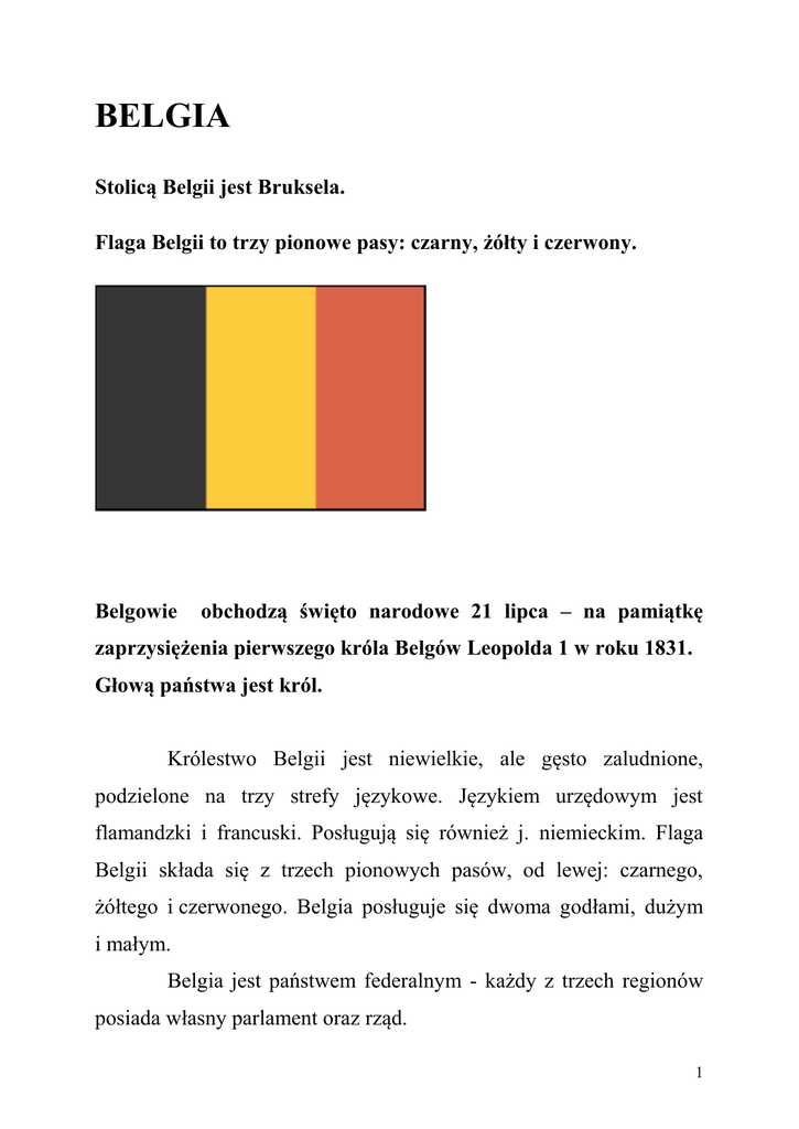 BELGIA Stolicą Belgii jest Bruksela. Flaga Belgii to trzy pionowe pasy: czarny, żółty i czerwony. Belgowie obchodzą święto narodowe 21 lipca – na pamiątkę zaprzysiężenia pierwszego króla Belgów Leopolda 1 w roku 1831. Głową państwa jest król. Królestwo Belgii jest niewielkie, ale gęsto zaludnione, podzielone na trzy strefy językowe. Językiem urzędowym jest flamandzki i francuski. Posługują się również j. niemieckim. Flaga Belgii składa się z trzech pionowych pasów, od lewej: czarnego, żółtego i czerwonego. Belgia posługuje się dwoma godłami, dużym i małym. Belgia jest państwem federalnym - każdy z trzech regionów posiada własny parlament oraz rząd. 1 Od kwietnia aż do jesieni we wszystkich miastach niderlandzkojęzycznych trwa Festiwal Flandryjski (Het Festival van Vlaanderen), podczas którego organizowane są występy zespołów muzyki średniowiecznej i koncerty muzyki klasycznej. Stolicą Belgii jest Bruksela. Jest też umowną stolicą Unii Europejskiej, tu koncentruje się polityka europejska w zakresie integracji i bezpieczeństwa. To siedziba instytucji unijnych o kluczowym znaczeniu, znajdują się tam: Komisja Europejska, Parlament Europejski, Rada Unii Europejskiej, Rada i Sekretariat Unii Zachodnio Europejskiej, Komitet ekonomiczno- społeczny, Komitet Regionów. Belgia reprezentowana jest w tych organach przez jednego komisarza, pięciu członków Rady Ministrów, dwudziestu pięciu deputowanych do parlamentu oraz po dwunastu doradców w Komitecie Ekonomiczno Społecznym i Komitecie Regionów. Nagromadzenie międzynarodowych instytucji poważnie wpływa na tętniące życiem miasto, jako że zamieszkuje w nim wielu cudzoziemców, będących urzędnikami. W kwestii rozszerzenia Unii o nowych członków Belgia stoi po stronie mówiącej, aby małe państwa były traktowane na równi z wielkimi, a także by wszystkie kraje członkowskie, bez względu na ich powierzchnię i liczbę ludności, były pełnoprawnymi uczestnikami zrzeszenia ekonomicznego i politycznego w Unii Europejskiej. Śmiało można powiedzieć, że największą atrakcją turystyczną Belgii są zabytki. Zaczynając od Brukseli, można wymienić chociażby słynny XV-wieczny ratusz mieszczący się w centrum miasta na Grand Place. Tutaj też znajdują się przepiękne, zabytkowe 2 kamienice i Dom Króla, czyli pałac z XV wieku, który aktualnie pełni rolę muzeum. Warto zobaczyć także Katedrę Św. Michała oraz gotycki Kościół Notre Dame du Sablon. Nie można zapomnieć o prawdziwym symbolu Belgii – rzeźbie Manneken Ciekawostki Belgii Jeżeli Belgia nie świeci pełnym światłem na europejskiej scenie, znajdując się w cieniu innych krajów, dzieje się tak wyłącznie z powodu wyjątkowej skromności jej mieszkańców. W tym niewielkim, niepozornym kraju możemy znaleźć ciekawszą historię, piękniejszą sztukę, smaczniejsze jedzenie i bardziej wyrafinowaną architekturę niż u wielu jego dużych, bardziej znanych sąsiadów. Święty Mikołaj odwiedza domy dwukrotnie: 4 grudnia sprawdza czy dzieci były grzeczne przez cały rok, a 6 grudnia powraca i zostawia prezenty w butach lub przygotowanych koszykach. Belgijskie przysmaki Do specjalności kuchni belgijskiej należy lapin a la biere (zając w piwie) oraz carbonnade (gulasz wołowy). W Belgii istnieje kilkaset gatunków piwa, a niektóre z nich są bez wątpienia najlepsze na świecie. W Belgii zjada się i wypija duże ilości czekolady, szczególną popularnością cieszą się praliny. 3