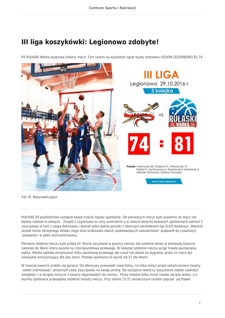 Centrum Sportu i Rekreacji III liga koszykówki: Legionowo zdobyte! KS PUŁASKI Warka wygrywa kolejny mecz! Tym razem na wyjeździe ograł wyżej notowany LEGION LEGIONOWO 81:74. Fot. M. Matysiak/Legion PUŁASKI 29 października rozegrał swoje trzecie ligowe spotkanie. Od pierwszych minut było wiadomo że mecz nie będzie należał to łatwych. Zespół z Legionowa to silny przeciwnik a w swoich dotychczasowych spotkaniach odniósł 2 zwycięstwa w tym z Legią Warszawa i doznał tylko jednej porażki z obecnym wiceliderem ligi GLKS Nadarzyn. Warecki zespół mimo okrojonego składu (tego dnia brakowało dwóch podstawowych zawodników) podszedł do rywalizacji poważnie i w pełni skoncentrowany. Pierwsza odsłona meczu była próbą sił. Wynik oscylował w granicy remisu ale ostatnie słowo w pierwszej kwarcie należało do Warki która wyszła na czteropunktową przewagę. W kolejnej odsłonie meczu wciąż trwała wyrównana walka. Warka zdołała utrzymywać kilku punktową przewagę ale rywal nie dawał za wygraną, przez co mecz był niezwykle emocjonujący dla obu stron. Połowa spotkania to wynik 43:37 dla Warki. W trzeciej kwarcie zrobiło się gorąco! Do ofensywy przeszedł rywal który, na kilka minut przed zakończeniem kwarty zdołał zremisować i przechylił szalę zwycięstwa na swoją stronę. Na szczęście wareccy koszykarze zdołali nadrobić zaległości i w drugiej minucie 4 kwarty doprowadzili do remisu. Przez kolejne kilka minut trwała zacięta walka, a o wyniku spotkania przesądziły ostatnie minuty meczu. Przy stanie 71:71 skutecznym rzutem popisał się Paweł 1 Centrum Sportu i Rekreacji Adamczyk, a wynik kilka sekund później podniósł jeszcze Damian Wawszczyk i było 75 do 71 dla Warki. W odpowiedzi rywale zdobyli 3 punkty, ale zimną krwią wykazał się Tomek Chojecki ,który wywalczył rzuty osobiste i zdobył kolejne 4 punkty dla Warki. Na koniec jeszcze dwa punkty rzucił Jarek Jachimowicz i tym sposobem Warka wywalczyła zwycięstwo. Spotkanie zakończyło się 81: 74 dla PUŁASKIEGO. Mecz nie należał do łatwych, były lepsze i gorsze momenty, ale budujące jest to że warecki zespół zaczął spełniać założenia taktyczne. Na pewno do korzystnego wyniku przyczyniło się dobre wprowadzenie piłki i skuteczniejsze zagrywki. Gra do końca i opanowanie były też ważnym elementem w drodze do zwycięstwa – stwierdzają trenerzy Marek Brzeżnicki i Robert Szczepaniak. Imponującą ilość punktów bo aż 28 w zespole Pułaskiego zdobył Adamczyk Paweł . Wysoką skutecznością popisał się też Tomasz Chojecki zdobywca 21 pkt. W sumie obaj panowie zdobyli ponad połowę punktów dla Warki. Brawa! Obecnie KS PUŁASKI Warka zajmuje 5 miejsce w rozgrywkach III ligi koszykówki grupy A. W najbliższym spotkaniu zmierzy się 5 listopada w Warszawie z Hutnikiem, następnie rozegra zaległy mecz wyjazdowy z NOSiR Nowy Dwór Mazowiecki, a 19 listopada podejmie na własnym boisku GLKS NADARZYN. Zdjęcia z meczu LEGION LEGIONOWO a PUŁASKI WARKA można znaleźć w linku: http://gazetapowiatowa.pl/sport/koszykowka-sport/legion-legionowo-mogli-wygrac-przespali-koncowke/ TABELA: WYJAZD PKT. ZD. PKT. STR. RÓŻNICA STOSUNEK M DRUŻYNA PKT MECZE ZW. POR. 1 MUKS Hutnik 10 5 5-0 3-0 2-0 450 305 +145 1.4754 2 GLKS Nadarzyn 8 5 3-2 2-0 1-2 483 361 +122 1.3380 3 Legia Warszawa 8 5 3-2 2-0 1-2 360 346 +14 1.0405 4 KS Legion Legionowo 6 4 2-2 1-2 1-0 323 300 +23 1.0767 5 KSP Warka 5 3 2-1 0-1 2-0 237 227 +10 1.0441 6 MUKS Piaseczno 5 4 1-3 0-2 1-1 256 297 -41 0.8620 7 UKS 9 PWSIP Łomża 4 4 0-4 0-2 0-2 266 426 -160 0.6244 8 NOSiR 2 2 0-2 0-1 0-1 108 221 -113 0.4887 DOM 2 Centrum Sportu i Rekreacji 3