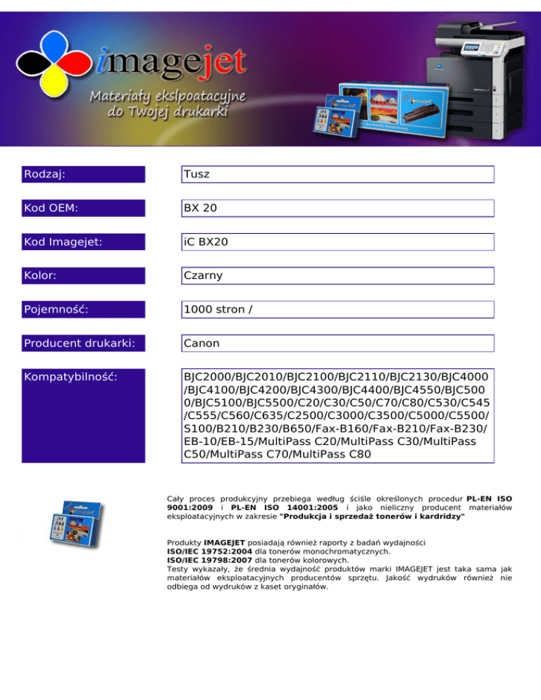 Rodzaj: Tusz Kod OEM: BX 20 Kod Imagejet: iC BX20 Kolor: Czarny Pojemność: 1000 stron / Producent drukarki: Canon Kompatybilność: BJC2000/BJC2010/BJC2100/BJC2110/BJC2130/BJC4000 /BJC4100/BJC4200/BJC4300/BJC4400/BJC4550/BJC500 0/BJC5100/BJC5500/C20/C30/C50/C70/C80/C530/C545 /C555/C560/C635/C2500/C3000/C3500/C5000/C5500/ S100/B210/B230/B650/Fax-B160/Fax-B210/Fax-B230/ EB-10/EB-15/MultiPass C20/MultiPass C30/MultiPass C50/MultiPass C70/MultiPass C80 Cały proces produkcyjny przebiega według ściśle określonych procedur PL-EN ISO 9001:2009 i PL-EN ISO 14001:2005 i jako nieliczny producent materiałów eksploatacyjnych w zakresie "Produkcja i sprzedaż tonerów i kardridzy" Produkty IMAGEJET posiadają również raporty z badań wydajności ISO/IEC 19752:2004 dla tonerów monochromatycznych. ISO/IEC 19798:2007 dla tonerów kolorowych. Testy wykazały, że średnia wydajność produktów marki IMAGEJET jest taka sama jak materiałów eksploatacyjnych producentów sprzętu. Jakość wydruków również nie odbiega od wydruków z kaset oryginałów. LASER1 ul. Warszawska 31 25-518 Kielce tel.: (41) 368-13-99 (41) 344-85-58 e-mail:[email protected] Powered by TCPDF (www.tcpdf.org)