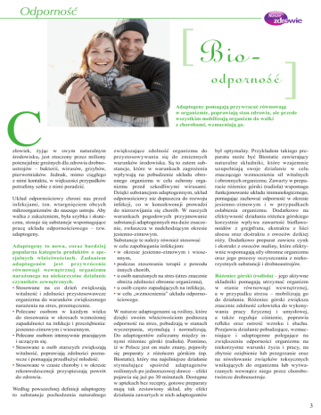 Odporność [ Bioodporność C złowiek, żyjąc w swym naturalnym środowisku, jest otoczony przez miliony potencjalnie groźnych dla zdrowia drobnoustrojów – bakterii, wirusów, grzybów, pierwotniaków. Jednak, mimo ciągłego z nimi kontaktu, w większości przypadków potrafimy sobie z nimi poradzić. Układ odpornościowy chroni nas przed infekcjami, tzn. wtargnięciem obcych mikroorganizmów do naszego ustroju. Aby walka z zakażeniem, była szybka i skuteczna, stosuje się substancje wspomagające pracę układu odpornościowego – tzw. adaptogeny. Adaptogeny to nowa, coraz bardziej popularna kategoria produktów o specjalnych właściwościach. Zadaniem adaptogenów jest przywrócenie równowagi wewnętrznej organizmu narażonego na niekorzystne działanie czynników zewnętrznych. • Stosowane na co dzień zwiększają witalność i zdolności przystosowawcze organizmu do warunków zwiększonego narażenia na stres, przemęczenie. • Polecane osobom w każdym wieku do stosowania w okresach wzmożonej zapadalności na infekcje i przeziębienia: jesienno-zimowym i wiosennym. • Polecane osobom intensywnie pracującym i uczącym się. • Stosowane u osób starszych zwiększają witalność, poprawiają zdolności poznawcze i pomagają przedłużyć młodość. • Stosowane w czasie choroby i w okresie rekonwalescencji przyspieszają powrót do zdrowia. Według powszechnej definicji adaptogeny to substancje pochodzenia naturalnego ] Adaptogeny pomagają przywracać równowagę w organizmie, poprawiają stan zdrowia, ale przede wszystkim mobilizują organizm do walki z chorobami, wzmacniają go. zwiększające zdolność organizmu do przystosowywania się do zmiennych warunków środowiska. Są to zatem substancje, które w warunkach zagrożenia wpływają na pobudzenie układu obronnego organizmu w celu ochrony organizmu przed szkodliwymi wirusami. Dzięki substancjom adaptogennym, układ odpornościowy nie dopuszcza do rozwoju infekcji, co w konsekwencji prowadzi do nierozwijania się chorób. W naszych warunkach pogodowych przyjmowanie substancji adaptogennych ma duże znaczenie, zwłaszcza w nadchodzącym okresie jesienno-zimowym. Substancje te należy również stosować w celu zapobiegania infekcjom: • w okresie jesienno-zimowym i wiosennym, • podczas stosowania terapii z powodu innych chorób, • u osób narażonych na stres (stres znacznie obniża zdolności obronne organizmu), • u osób często zapadających na infekcje, • w celu „wzmocnienia” układu odpornościowego. W naturze adaptogenami są rośliny, które dzięki swoim właściwościom podnoszą odporność na stres, pobudzają w stanach wyczerpania, stymulują i normalizują. Do adaptogentów zaliczamy między innymi różeniec górski (radiola). Pomimo, iż w Polsce jest on mało znany, pojawiły się preparaty z różeńcem górskim (np. Biostatic), który ma najsilniejsze działanie stymulujące spośród adaptagenów roślinnych po jednorazowej dawce – efekt pojawia się już po 30 minutach. Dostępne w aptekach bez recepty, gotowe preparaty mają tak zestawiony skład, aby efekt działania zawartych w nich adaptogentów był optymalny. Przykładem takiego preparatu może być Biostatic zawierający naturalne składniki, które wzajemnie uzupełniają swoje działanie w celu znaczącego wzmocnienia sił witalnych i obronnych organizmu. Zawarty w preparacie różeniec górski (radiola) wspomaga funkcjonowanie układu immunologicznego, pomagając zachować odporność w okresie jesienno-zimowym i w przypadkach osłabienia organizmu. Dodatkowo na efektywność działania różeńca górskiego korzystnie wpływa zawartość bioflawonoidów z grejpfruta, ekstraktu z liści aloesu oraz ekstraktu z owoców dzikiej róży. Dodatkowo preparat zawiera cynk i ekstrakt z owoców maliny, które efektywnie wspomagają siły obronne organizmu oraz jego procesy oczyszczania z niekorzystnych substancji i drobnoustrojów. Różeniec górski (rodiola) – jego aktywne składniki pomagają utrzymać organizm w stanie równowagi wewnętrznej, a w przypadku stresu – mobilizują go do działania. Różeniec górski zwiększa znacznie zdolność człowieka do wykonywania pracy fizycznej i umysłowej, a także reguluje ciśnienie, poprawia refleks oraz ostrość wzroku i słuchu. Przejawia działanie pobudzające, wzmacniające i adaptogenne polegające na zwiększeniu odporności organizmu na niekorzystne warunki życia i pracy, na zbytnie oziębienie lub przegrzanie oraz na niwelowanie związków toksycznych wnikających do organizmu lub wytwarzanych wewnątrz niego przez chorobotwórcze drobnoustroje. 3 Odporność [ Bioodporność Pestki z grejpfruta – są bogatym źródłem bioflawonoidów – naturalnych związków roślinnych, które chronią komórki roślin przed negatywnym działaniem niekorzystnych drobnoustrojów. Bioflawonoidy posiadają wiele korzystnych właściwości, przez co pozytywnie wpływają na funkcjonowanie organizmu. Przede wszystkim należą one do grupy przeciwutleniaczy, czyli związków neutralizujących wolne rodniki, które naruszają struktury komórkowe. Wolne rodniki działają niekorzystnie powodując m.in. przedwczesne starzenie organizmu. Im więcej bioflawonoidów znajduje się w codziennej diecie, tym sprawniejsze jest działanie bariery antyoksydacyjnej organizmu. Nie zawsze udaje się jednak zachować zbilansowaną dietę obfitującą m.in. w świeże owoce i warzywa, dlatego korzystne jest uzupełnianie jej o naturalne przeciwutleniacze. Dodatkowo bioflawonoidy wspomagają prawidłowe działanie układu odpornościowego oraz wspierają kondycję ścianek naczyń krwionośnych. Ponadto dzięki obecności bioflawonoidów organizm w sposób optymalny wchłania naturalną witaminę C, a bioflawonoidy dodatkowo wzmacniają jej korzystne działanie. Aloes jest rośliną bogatą w składniki odżywcze, w tym cenne dla organizmu człowieka aminokwasy, które biorą udział w