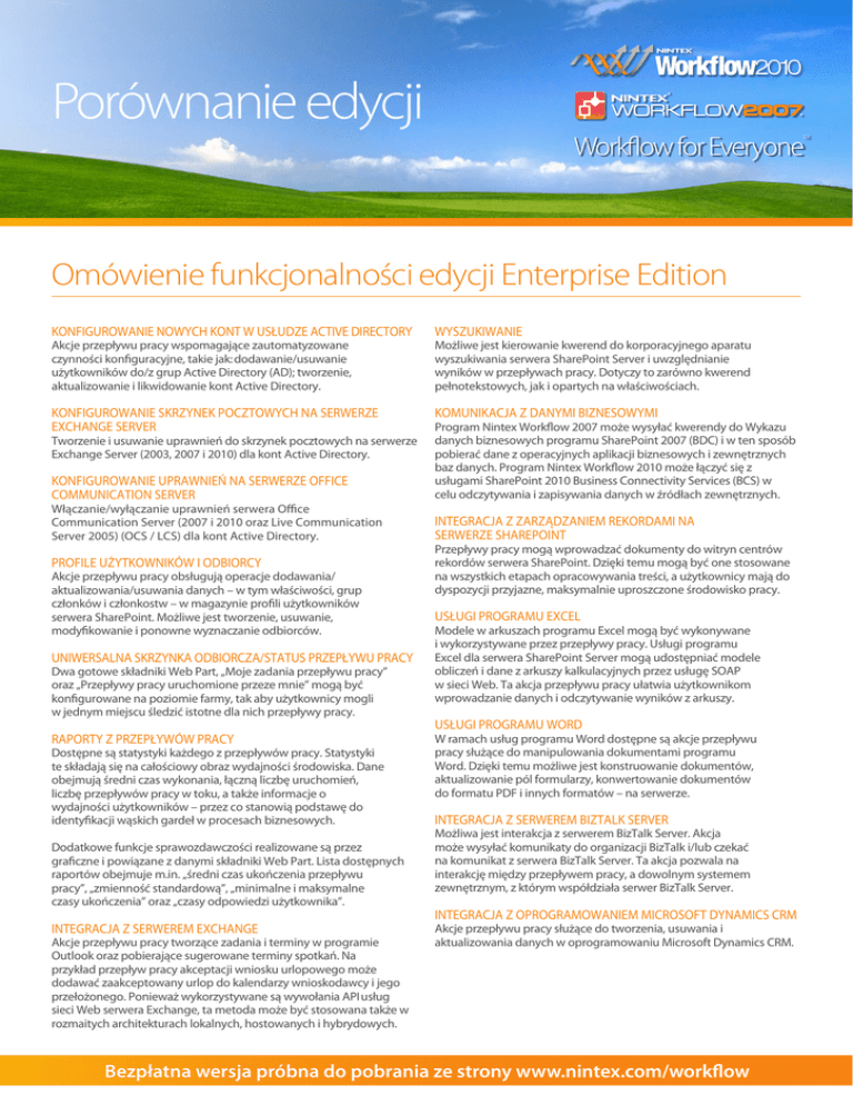 Porównanie edycji Workflow for Everyone TM Omówienie funkcjonalności edycji Enterprise Edition Konfigurowanie nowych kont w usłudze Active Directory Wyszukiwanie Konfigurowanie skrzynek pocztowych na serwerze Exchange Server Komunikacja z danymi biznesowymi Akcje przepływu pracy wspomagające zautomatyzowane czynności konfiguracyjne, takie jak: dodawanie/usuwanie użytkowników do/z grup Active Directory (AD); tworzenie, aktualizowanie i likwidowanie kont Active Directory. Tworzenie i usuwanie uprawnień do skrzynek pocztowych na serwerze Exchange Server (2003, 2007 i 2010) dla kont Active Directory. Konfigurowanie uprawnień na serwerze Office Communication Server Włączanie/wyłączanie uprawnień serwera Office Communication Server (2007 i 2010 oraz Live Communication Server 2005) (OCS / LCS) dla kont Active Directory. Profile użytkowników i odbiorcy Akcje przepływu pracy obsługują operacje dodawania/ aktualizowania/usuwania danych – w tym właściwości, grup członków i członkostw – w magazynie profili użytkowników serwera SharePoint. Możliwe jest tworzenie, usuwanie, modyfikowanie i ponowne wyznaczanie odbiorców. Uniwersalna skrzynka odbiorcza/status przepływu pracy Dwa gotowe składniki Web Part, „Moje zadania przepływu pracy” oraz „Przepływy pracy uruchomione przeze mnie” mogą być konfigurowane na poziomie farmy, tak aby użytkownicy mogli w jednym miejscu śledzić istotne dla nich przepływy pracy. Raporty z przepływów pracy Dostępne są statystyki każdego z przepływów pracy. Statystyki te składają się na całościowy obraz wydajności środowiska. Dane obejmują średni czas wykonania, łączną liczbę uruchomień, liczbę przepływów pracy w toku, a także informacje o wydajności użytkowników – przez co stanowią podstawę do identyfikacji wąskich gardeł w procesach biznesowych. Dodatkowe funkcje sprawozdawczości realizowane są przez graficzne i powiązane z danymi składniki Web Part. Lista dostępnych raportów obejmuje m.in. „średni czas ukończenia przepływu pracy”, „zmienność standardową”, „minimalne i maksymalne czasy ukończenia” oraz „czasy odpowiedzi użytkownika”. Integracja z serwerem Exchange Akcje przepływu pracy tworzące zadania i terminy w programie Outlook oraz pobierające sugerowane terminy spotkań. Na przykład przepływ pracy akceptacji wniosku urlopowego może dodawać zaakceptowany urlop do kalendarzy wnioskodawcy i jego przełożonego. Ponieważ wykorzystywane są wywołania API usług sieci Web serwera Exchange, ta metoda może być stosowana także w rozmaitych architekturach lokalnych, hostowanych i hybrydowych. Możliwe jest kierowanie kwerend do korporacyjnego aparatu wyszukiwania serwera SharePoint Server i uwzględnianie wyników w przepływach pracy. Dotyczy to zarówno kwerend pełnotekstowych, jak i opartych na właściwościach. Program Nintex Workflow 2007 może wysyłać kwerendy do Wykazu danych biznesowych programu SharePoint 2007 (BDC) i w ten sposób pobierać dane z operacyjnych aplikacji biznesowych i zewnętrznych baz danych. Program Nintex Workflow 2010 może łączyć się z usługami SharePoint 2010 Business Connectivity Services (BCS) w celu odczytywania i zapisywania danych w źródłach zewnętrznych. Integracja z zarządzaniem rekordami na serwerze SharePoint Przepływy pracy mogą wprowadzać dokumenty do witryn centrów rekordów serwera SharePoint. Dzięki temu mogą być one stosowane na wszystkich etapach opracowywania treści, a użytkownicy mają do dyspozycji przyjazne, maksymalnie uproszczone środowisko pracy. Usługi programu Excel Modele w arkuszach programu Excel mogą być wykonywane i wykorzystywane przez przepływy pracy. Usługi programu Excel dla serwera SharePoint Server mogą udostępniać modele obliczeń i dane z arkuszy kalkulacyjnych przez usługę SOAP w sieci Web. Ta akcja przepływu pracy ułatwia użytkownikom wprowadzanie danych i odczytywanie wyników z arkuszy. Usługi programu Word W ramach usług programu Word dostępne są akcje przepływu pracy służące do manipulowania dokumentami programu Word. Dzięki temu możliwe jest konstruowanie dokumentów, aktualizowanie pól formularzy, konwertowanie dokumentów do formatu PDF i innych formatów – na serwerze. Integracja z serwerem BizTalk Server Możliwa jest interakcja z serwerem BizTalk Server. Akcja może wysyłać komunikaty do organizacji BizTalk i/lub czekać na komunikat z serwera BizTalk Server. Ta akcja pozwala na interakcję między przepływem pracy, a dowolnym systemem zewnętrznym, z którym współdziała serwer BizTalk Server. Integracja z oprogramowaniem Microsoft Dynamics CRM Akcje przepływu pracy służące do tworzenia, usuwania i aktualizowania danych w oprogramowaniu Microsoft Dynamics CRM. Bezpłatna wersja próbna do pobrania ze strony www.nintex.com/workflow Legenda Tabela porównawcza edycji Nintex Workflow Funkcja dostępna w wersjach 2007 i 2010 Funkcja dostępna w obu wersjach, udoskonalona w wersji 2010 Funkcja dostępna tylko w wersji 2010 INSTALACJA Instalacja autonomiczna Instalacja w farmie sieci Web Witryny zespołów objęte licencją 5 witryn zespołów Bez ograniczeń Bez ograniczeń Poziom witryny Poziom witryny Poziom farmy Projektowanie Projektowanie techniką przeciągania i upuszczania Drukowanie Powiększanie widoku Sprawozdawczość i zarządzanie Składniki Web Part do śledzenia przepływu pracy wg. użytkowników Statystyki zbiorcze, składniki Web Part raportów i wykresów Indywidualna historia przepływu pracy i opcja pełnego rejestrowania Rejestrowanie na liście historii Kontrola konta użytkownika Zatwierdzanie zmiany przepływu pracy Logika i przepływ Zbiór akcji Akcje pętli, wyboru wariantu i równoległe Uruchamianie warunkowe, warunki i filtry Maszyna stanów Interakcja z użytkownikiem Generowanie/obsługa formularzy InfoPath Oddelegowanie zadania przepływu pracy Tworzenie zadania programu SharePoint Za