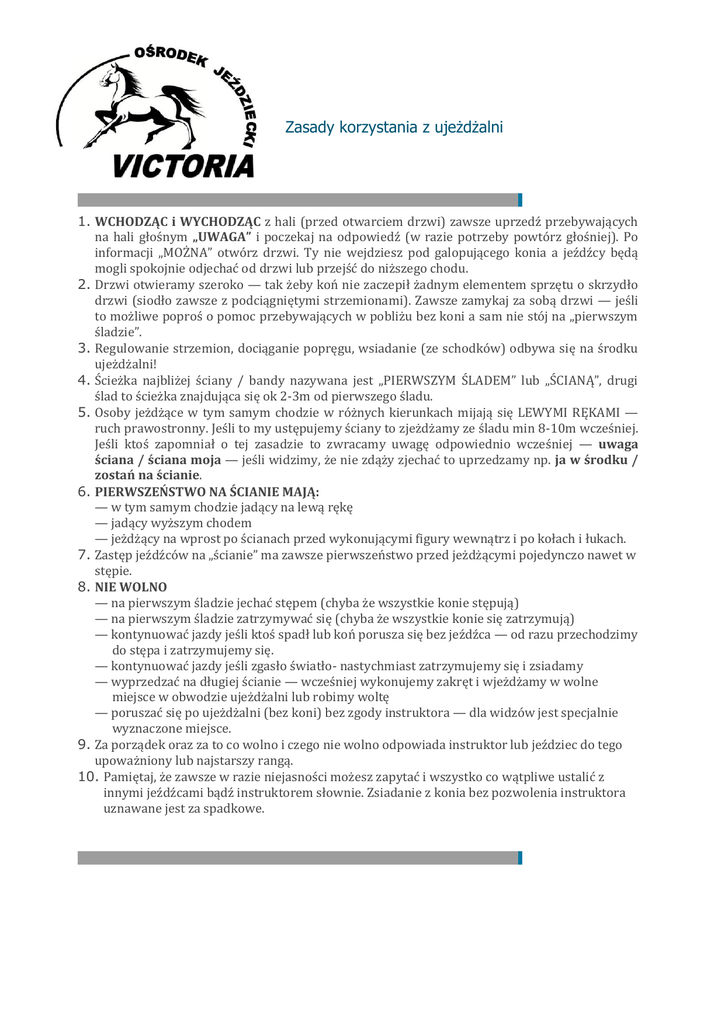 Zasady korzystania z ujeżdżalni 1. WCHODZĄC i WYCHODZĄC z hali (przed otwarciem drzwi) zawsze uprzedź przebywających na hali głośnym „UWAGA” i poczekaj na odpowiedź (w razie potrzeby powtórz głośniej). Po informacji „MOŻNA” otwórz drzwi. Ty nie wejdziesz pod galopującego konia a jeźdźcy będą mogli spokojnie odjechać od drzwi lub przejść do niższego chodu. 2. Drzwi otwieramy szeroko — tak żeby koń nie zaczepił żadnym elementem sprzętu o skrzydło drzwi (siodło zawsze z podciągniętymi strzemionami). Zawsze zamykaj za sobą drzwi — jeśli to możliwe poproś o pomoc przebywających w pobliżu bez koni a sam nie stój na „pierwszym śladzie”. 3. Regulowanie strzemion, dociąganie popręgu, wsiadanie (ze schodków) odbywa się na środku ujeżdżalni! 4. Ścieżka najbliżej ściany / bandy nazywana jest „PIERWSZYM ŚLADEM” lub „ŚCIANĄ”, drugi ślad to ścieżka znajdująca się ok 2-3m od pierwszego śladu. 5. Osoby jeżdżące w tym samym chodzie w różnych kierunkach mijają się LEWYMI RĘKAMI — ruch prawostronny. Jeśli to my ustępujemy ściany to zjeżdżamy ze śladu min 8-10m wcześniej. Jeśli ktoś zapomniał o tej zasadzie to zwracamy uwagę odpowiednio wcześniej — uwaga ściana / ściana moja — jeśli widzimy, że nie zdąży zjechać to uprzedzamy np. ja w środku / zostań na ścianie. 6. PIERWSZEŃSTWO NA ŚCIANIE MAJĄ: — w tym samym chodzie jadący na lewą rękę — jadący wyższym chodem — jeżdżący na wprost po ścianach przed wykonującymi figury wewnątrz i po kołach i łukach. 7. Zastęp jeźdźców na „ścianie” ma zawsze pierwszeństwo przed jeżdżącymi pojedynczo nawet w stępie. 8. NIE WOLNO — na pierwszym śladzie jechać stępem (chyba że wszystkie konie stępują) — na pierwszym śladzie zatrzymywać się (chyba że wszystkie konie się zatrzymują) — kontynuować jazdy jeśli ktoś spadł lub koń porusza się bez jeźdźca — od razu przechodzimy . do stępa i zatrzymujemy się. — kontynuować jazdy jeśli zgasło światło- nastychmiast zatrzymujemy się i zsiadamy — wyprzedzać na długiej ścianie — wcześniej wykonujemy zakręt i wjeżdżamy w wolne . miejsce w obwodzie ujeżdżalni lub robimy woltę — poruszać się po ujeżdżalni (bez koni) bez zgody instruktora — dla widzów jest specjalnie . wyznaczone miejsce. 9. Za porządek oraz za to co wolno i czego nie wolno odpowiada instruktor lub jeździec do tego upoważniony lub najstarszy rangą. 10. Pamiętaj, że zawsze w razie niejasności możesz zapytać i wszystko co wątpliwe ustalić z innymi jeźdźcami bądź instruktorem słownie. Zsiadanie z konia bez pozwolenia instruktora uznawane jest za spadkowe.