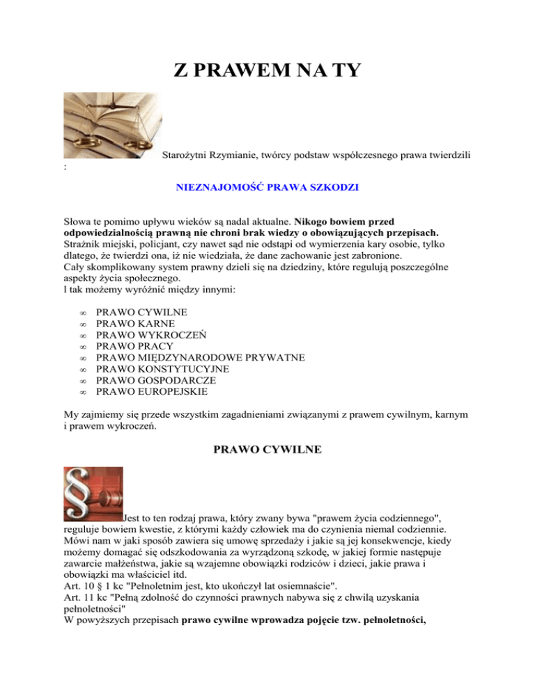 Z PRAWEM NA TY Starożytni Rzymianie, twórcy podstaw współczesnego prawa twierdzili : NIEZNAJOMOŚĆ PRAWA SZKODZI Słowa te pomimo upływu wieków są nadal aktualne. Nikogo bowiem przed odpowiedzialnością prawną nie chroni brak wiedzy o obowiązujących przepisach. Strażnik miejski, policjant, czy nawet sąd nie odstąpi od wymierzenia kary osobie, tylko dlatego, że twierdzi ona, iż nie wiedziała, że dane zachowanie jest zabronione. Cały skomplikowany system prawny dzieli się na dziedziny, które regulują poszczególne aspekty życia społecznego. l tak możemy wyróżnić między innymi: • • • • • • • • PRAWO CYWILNE PRAWO KARNE PRAWO WYKROCZEŃ PRAWO PRACY PRAWO MIĘDZYNARODOWE PRYWATNE PRAWO KONSTYTUCYJNE PRAWO GOSPODARCZE PRAWO EUROPEJSKIE My zajmiemy się przede wszystkim zagadnieniami związanymi z prawem cywilnym, karnym i prawem wykroczeń. PRAWO CYWILNE Jest to ten rodzaj prawa, który zwany bywa "prawem życia codziennego", reguluje bowiem kwestie, z którymi każdy człowiek ma do czynienia niemal codziennie. Mówi nam w jaki sposób zawiera się umowę sprzedaży i jakie są jej konsekwencje, kiedy możemy domagać się odszkodowania za wyrządzoną szkodę, w jakiej formie następuje zawarcie małżeństwa, jakie są wzajemne obowiązki rodziców i dzieci, jakie prawa i obowiązki ma właściciel itd. Art. 10 § 1 kc "Pełnoletnim jest, kto ukończył lat osiemnaście". Art. 11 kc "Pełną zdolność do czynności prawnych nabywa się z chwilą uzyskania pełnoletności" W powyższych przepisach prawo cywilne wprowadza pojęcie tzw. pełnoletności, stanowiąc, iż po ukończeniu 18 roku życia stajemy się "dorośli" i możemy w pełni uczestniczyć w życiu społecznym oraz dokonywać samodzielnie wszystkich czynności prawnych np. zakupić dom lub samochód, zawrzeć związek małżeński. Przed ukończeniem tego wieku ( ale mając skończone lat trzynaście ) możemy jedynie -jak stanowi art. 20 kodeksu cywilnego - zawierać umowy w "drobnych, bieżących sprawach życia codziennego". Oznacza to, że możesz bez zgody rodziców kupić sobie ubranie lub książkę, ale nikt już nie zgodzi się, aby sprzedać Ci samochód czy mieszkanie. Art. 415 kc "Kto z winy swojej wyrządził drugiemu szkodę, obowiązany jest do jej naprawienia". Art. 422 kc "Za szkodę odpowiedzialny jest nie tylko ten kto ją bezpośrednio wyrządził, lecz także ten, kto inną osobę do wyrządzenia szkody nakłonił albo był jej pomocny, jak również ten, kto świadomie skorzystał z wyrządzonej drugiemu szkody" Art. 431 "Kto zwierzę chowa albo się nim posługuje, obowiązany jest do naprawienia wyrządzonej przez nie szkody niezależnie od tego, czy było pod jego nadzorem, czy też zabłąkało się lub uciekło (...)". Powyższe artykuły mówią o zasadzie odpowiedzialności za własne czyny i ich konsekwencje. Jeżeli np. malując graffiti na murach czyjegoś domu doprowadzisz do zniszczenia ściany, to nie dość, że popełnisz przestępstwo lub wykroczenie, to będziesz jeszcze musiał naprawić wyrządzoną szkodę lub zapłacić za jej usunięcie. Konsekwencje takie spotkają Cię nie tylko wtedy, kiedy sam malowałeś, ale też wtedy, kiedy namówiłeś do tego młodszego kolegę lub pożyczyłeś mu swój sprzęt do malowania. Szczególną uwagę musisz też zachować, kiedy wyprowadzasz na spacer psa. Nie dość, że musisz pamiętać o smyczy i kagańcu, to jeszcze odpowiedzialny jesteś za wszelkie szkody, które pies może wyrządzić ludziom lub innym zwierzętom. PRAWO KARNE Prawo karne jest zbiorem przepisów, których celem jest zwalczanie niepożądanych czynów, zwanych przestępstwami, za pomocą metod, do których należą kary i środki zabezpieczające. Wszystkie przestępstwa opisane w prawie karnym są podzielone na zbrodnie i występki. ZBRODNIE to najcięższe przestępstwa, zagrożone karą pozbawienia wolności na czas nie krótszy niż trzy lata, aż do dożywocia włącznie. Zbrodnią jest np. zabicie człowieka. Czyny tak poważne jak szpiegostwo, spisek przeciwko Rzeczpospolitej, zamach na życie Prezydenta to także zbrodnie. Zbrodnią jest również rozbój z użyciem broni lub innego niebezpiecznego narzędzia - często wśród młodzieży zwany wymuszeniem. Przestępstwo to polega na zagrożeniu innej osobie bronią, nożem lub innym tego typu przedmiotem w celu okradzenia jej z pieniędzy, dokumentów, biżuterii itp. Niestety coraz częściej na terenie szkół mamy do czynienia z pewną odmianą rozboju, którą jest grożenie młodszym uczniom w celu obrabowania ich z pieniędzy, telefonów komórkowych, markowych ubrań. PAMIĘTAJMY! ZABRANIE SIŁĄ LUB GROŹBĄ MŁODSZEMU KOLEDZE NAWET DWÓCH ZŁOTYCH, ZA KTÓRE MIAŁ SOBIE KUPIĆ DRUGIE ŚNIADANIE W SZKOLNYM SKLEPIKU, MOŻE BYĆ UZNANE ZA ROZBÓJ ! Pozostałe przestępstwa opisane w kodeksie karnym noszą nazwę WYSTĘPKÓW. Występkami są między innymi: • • • • • • • • • Uszkodzenie ciała (art. 156-157 kodeksu karnego) Udział w bójce lub pobiciu człowieka (art. 158 kodeksu karnego) Spowodowanie wypadku komunikacyjnego (art. 177 kodeksu karnego) Bezprawne grożenie innej osobie (art. 190 kodeksu karnego) Zniesławienie, oszczerstwo lub pomówienie (art. 212 kodeksu karnego) Naruszenie nietykalności cielesnej innej osoby, polegające między innymi na uderzeniu, szarpaniu, opluciu itp. Fałszywe oskarżenie kogoś o popełnienie przestępstwa (art. 234 kodeksu karnego) Branie udziału w grupie przestępczej (art. 258 kodeksu karnego) Fałszowanie dokumentów (art. 270 kodeksu karnego) Warto wiedzieć, że dokumentami są nie tylko dowody osobiste, prawa jazdy, legitymacje, paszporty itp. dokumentem jest też Dziennik Lekcyjny!!! Prawo legalnego, zgodnego z prawem wpisywania w nim ocen i usprawiedliwiania nieobecności ma jedynie nauczyciel!!! • • • Kradzież (art. 278 kodeksu karnego) Znęcanie się nad zwierzętami (art. 35 o ochron
